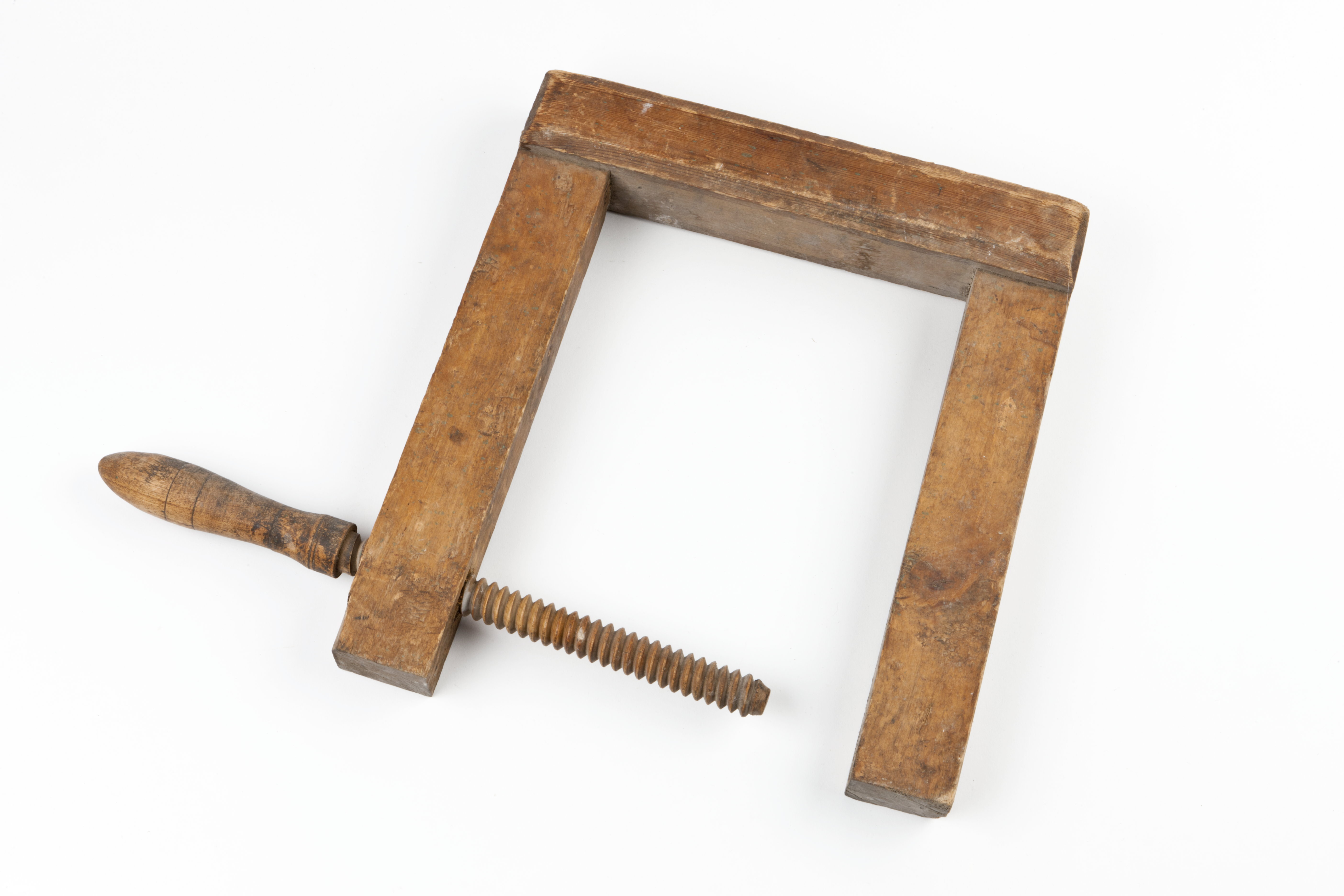 Skruvtving av björk med furulister limmade på ramens vertikala stycke. Skruv av björk med svarvat skaft.