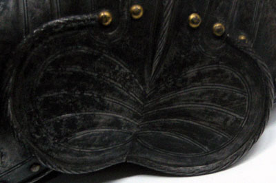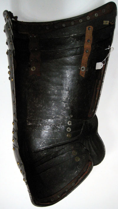TILLÄGG: Längs musslans överkant samt på den översta skenans yttre hörn återfinns en stämpel med ett "M" följt av en krönt sköld med tre fleur de lys och sedan ett "P". Stålets ytstruktur och behandling stämmer övverens med axelstyckena inv.nr. 23164 och inv.nr. 23170, däremot avviker ytan i jämförelse med inv.nr. 23164 som utgör ett par med denna lårpansar. På utsidan spår av korrosion. Knäledens nitar är bytta under 1900-talet till kopparnitar med guldfärgad kullrig skalle. Överkanten med spår av sammetklädd läderbit för snörning i rustjacka.