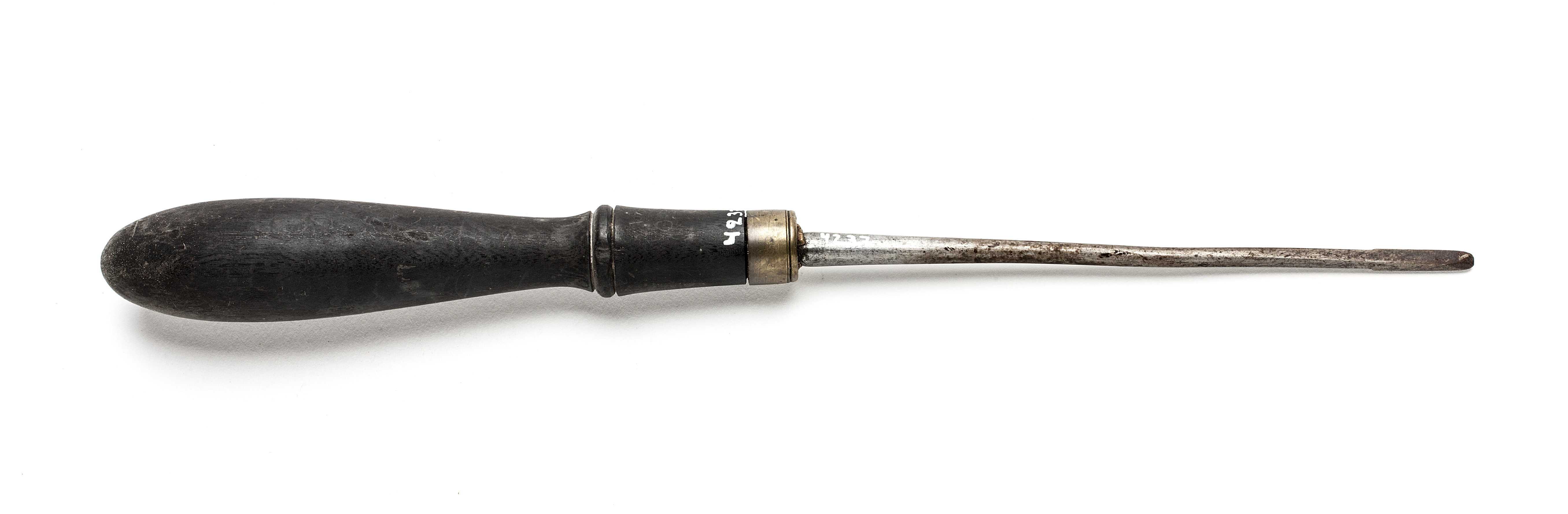 Rund klinga, tillplattad i änden. Borr med två centralsymmetriska eggar. Svarvat skaft av ebenholts med en vulst. Mässingsring. Stämplat på klingan: "S B".