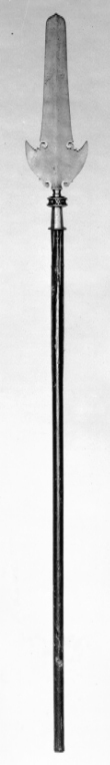 Klinga med punsad, hårt nedslipad ornering. Årtalet otydligt vid vingarnas bas, på båda sidor är 16 synligt, på den ena delvis 4. Riksvapen Sverige med Vasahjärtsköld, slutna kronor i trekronorsfälten, sköldhållare krönta lejon. Namnchiffer C R S av raka, odekorerade bokstäver, krönta av slutna kronor. Holk, l: 90 mm med punsade rankor på alla sidor. Brunmålat skaft av furu, l: 1450 mm med stålskonig nertill, brunmålade skenor, l: 450 mm.