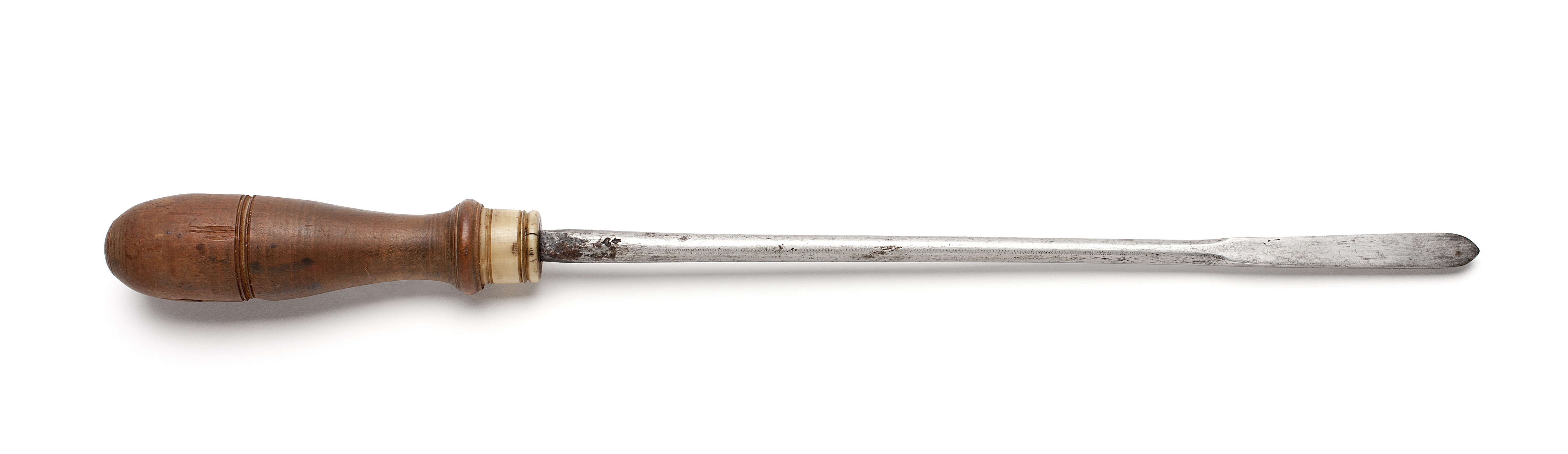Rund klinga, i änden med halvcirkelformad genomskärning. Stämplat på klingan: hjärta under kors. Spetsoval egg, rundad på undersidan. Svarvat skaft av päronträ, med en vulst nedtill ("rydboholmstyp"). Hornring. 1930 kallat skrubbjärn.