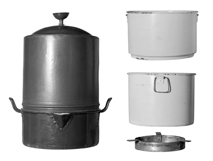 ÅNGKOKNINGSAPPARAT Av emaljerad stålplåt. Bestående av fyra cylindriska delar, två yttre och två inre, jämte ett fotställ. Yttre delarna utvändigt i blått, invändigt i vitt samt stående på varandra; nedre delen lägre, med två snett utstående rundstaviga handtag samt liten spetsig snås, kring övre kanten en utstående stav; övre delen med kupig översida, i vars mitt en liten skålformig tratt; kring nedre kanten en från insidan utpressad profilering; nedanför denna en inuti nedre delen gående hög sarg i vitt. Inre delarna i vitt; nedre delen med botten genombruten med runda hål i koncentriska ringar, kring övre kanten en utstående stav, nedanför denna på två motsatta sidor ett fyrsidigt rundstavigt handtag, rörligt i en omvikt plåtflik, fäst med en nit (ett av handtagen saknas); den övre med indragen plan botten som fals för nedre delen, kring övre kanten en ustående stav, nedanför denna två motsatta flikar efter handtag; delarna stående på varandra, den nedre på en kantställd ring av bandjärn, med tre rakt utstående flikar av något smalare bandjärn än ringen. Yttre delar, höjd: 39 cm.; diameter: 23,7 cm. Inre delar, höjd: 13 och 14,6 cm.; diameter: 19,9 och 20,6 cm