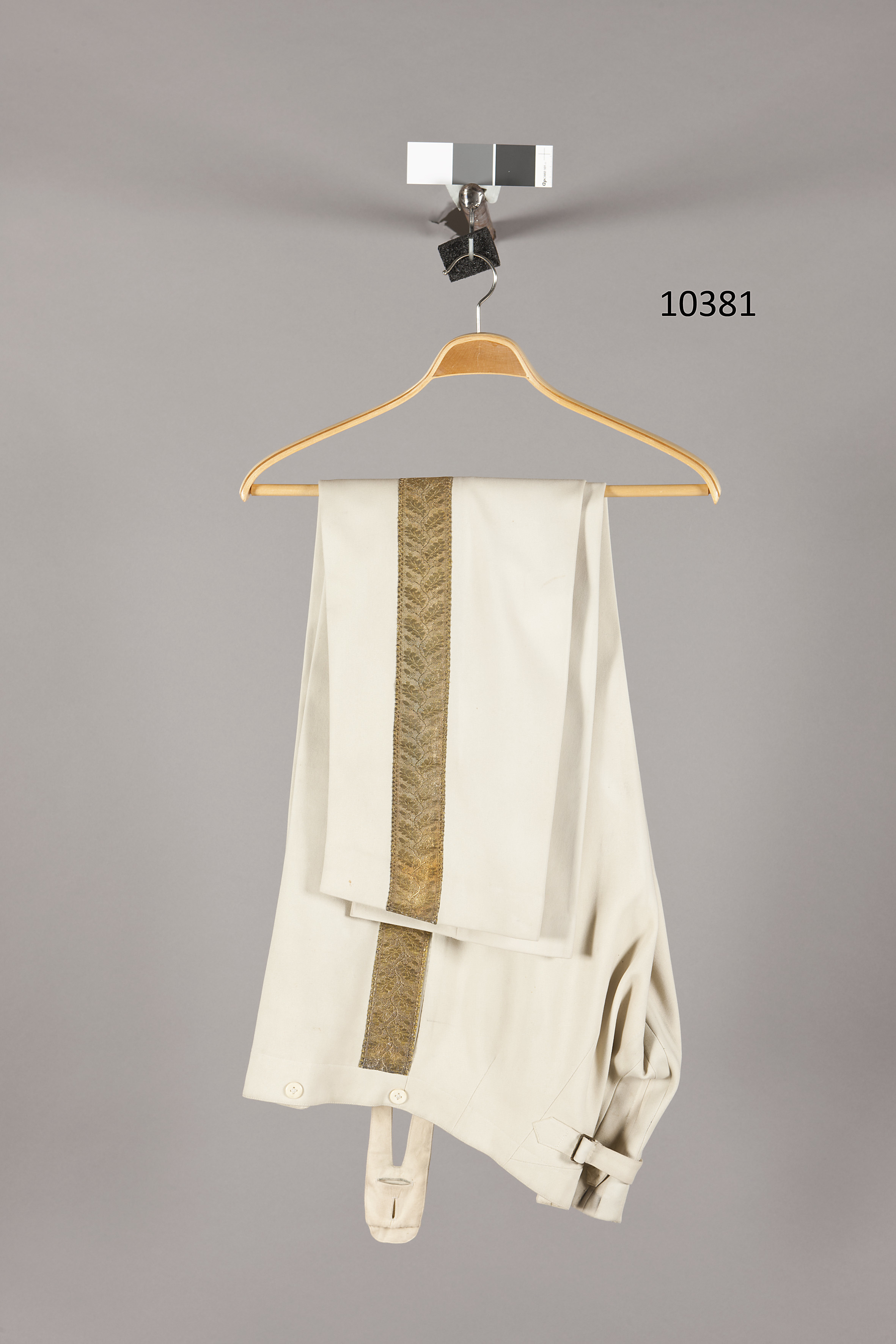 Byxor av vitt kläde, knäppning med gylf och fyra vita knappar 12 mm i diam, den nedersta knappen något större och olik de andra. Linning med nio knappar 16 mm i diam. Baktill infälld stor kil samt en mindre smalare. Spänntampar med rektangulär sölja av gulmetall med text: "F.W. & S". Fickor i sidsömmen, utmed dessa 50 mm bred guldgalon med eklövsmönster.