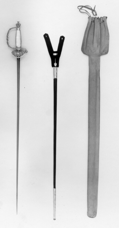 Fodral av kalvskinn med påse upptill för fästet, kant av tandade rundlar, dragsko med läderrem. Mörke efter klistrad pappersetikett på övre delens baksida.