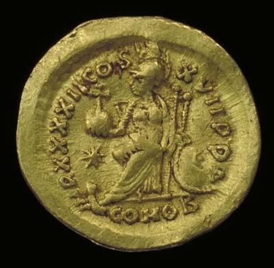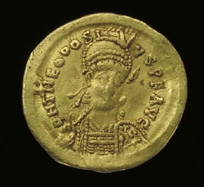 Upphov: Theodosius II. Media: Anställd vid SHM. Ekonomiska museet - Kungliga myntkabinettet/SHM, (CC BY 4.0) Du får bearbeta och dela verket för alla ändamål, även kommersiella, så länge du anger upphovsperson och licensgivare.