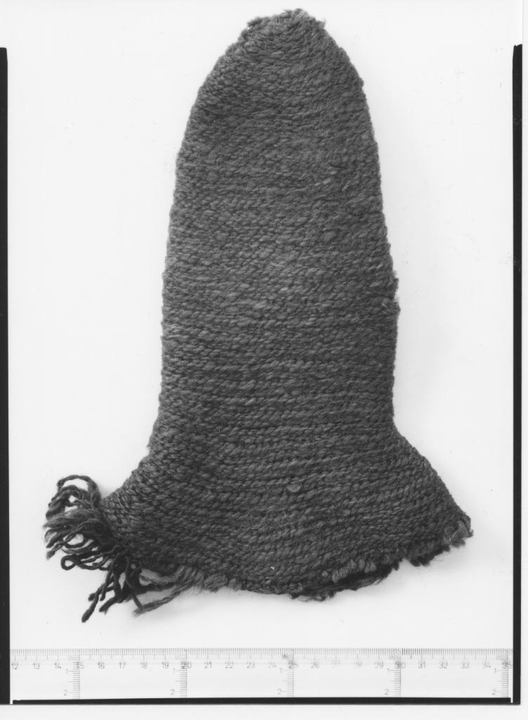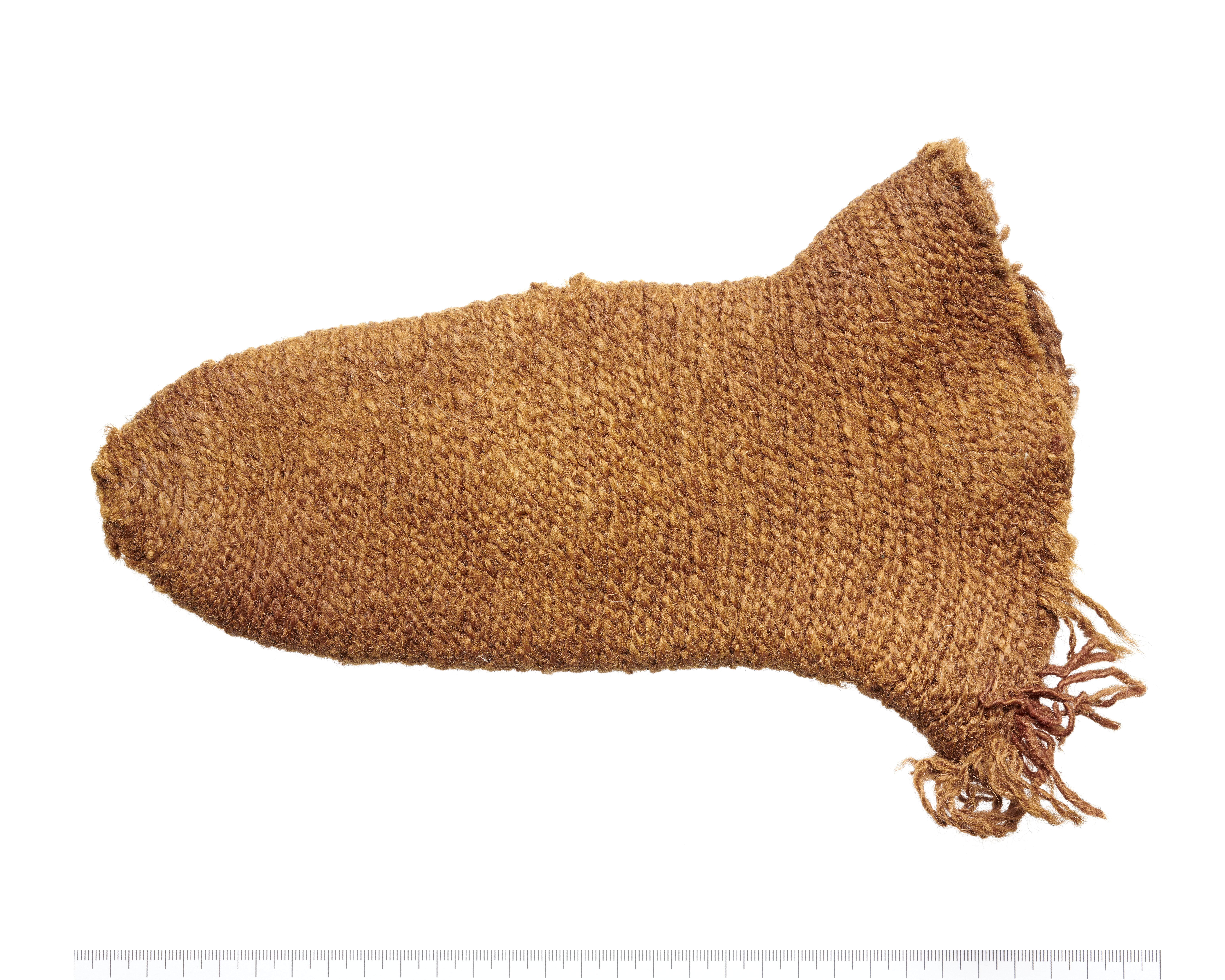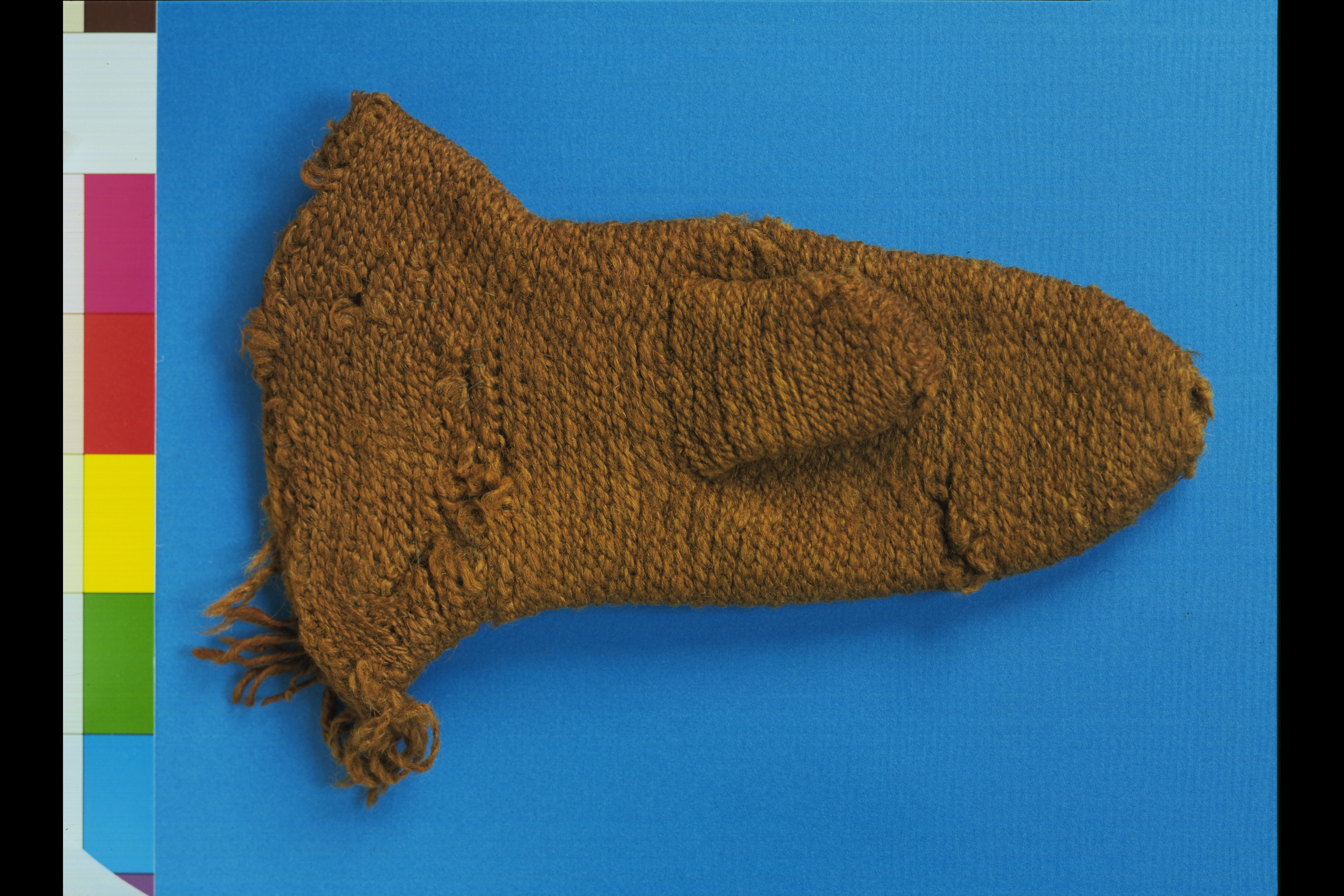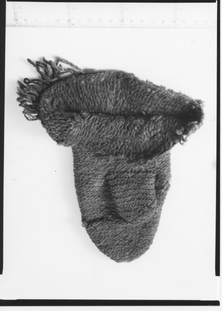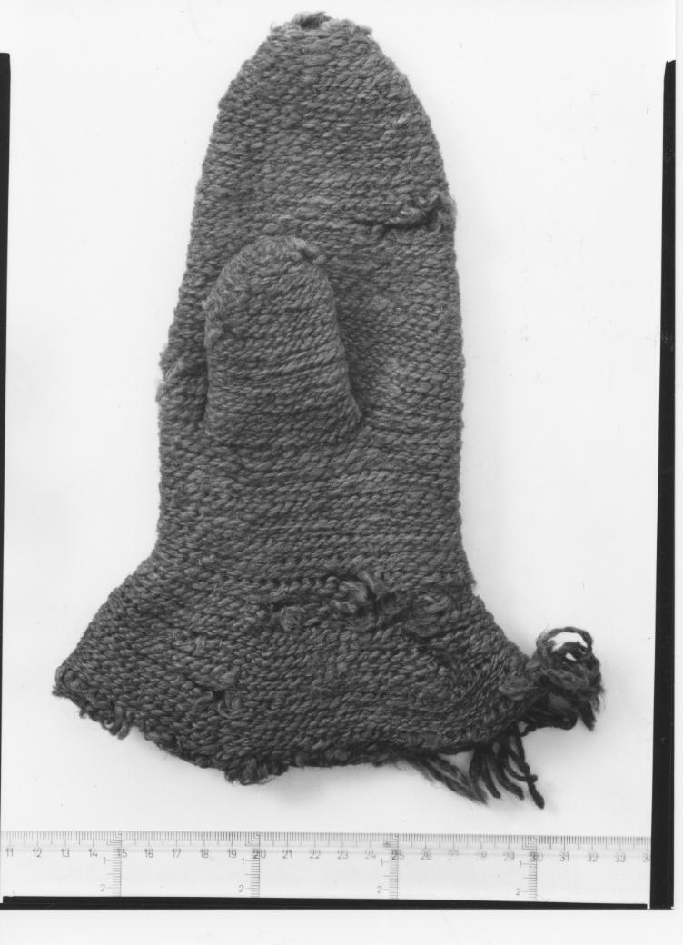 Nålbunden vänstervante av ullgarn, ursprungligen sannolikt ofärgat. Frans av rött, grönt och ofärgat ullgarn runt kragen.// Garnet Z-spunnet och S-tvinnat. Daterad med C-14, resultatet visar AD. 1510-1640.