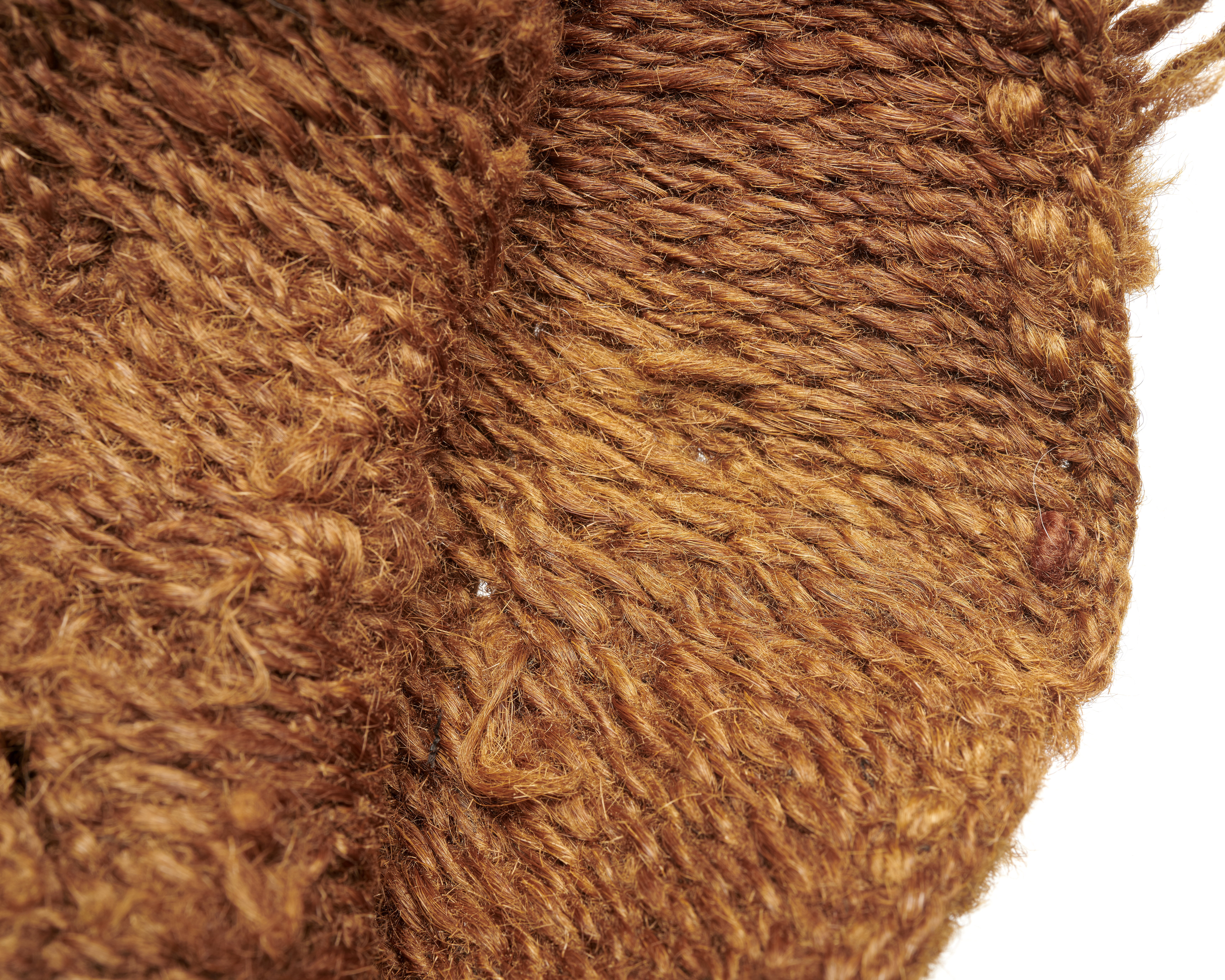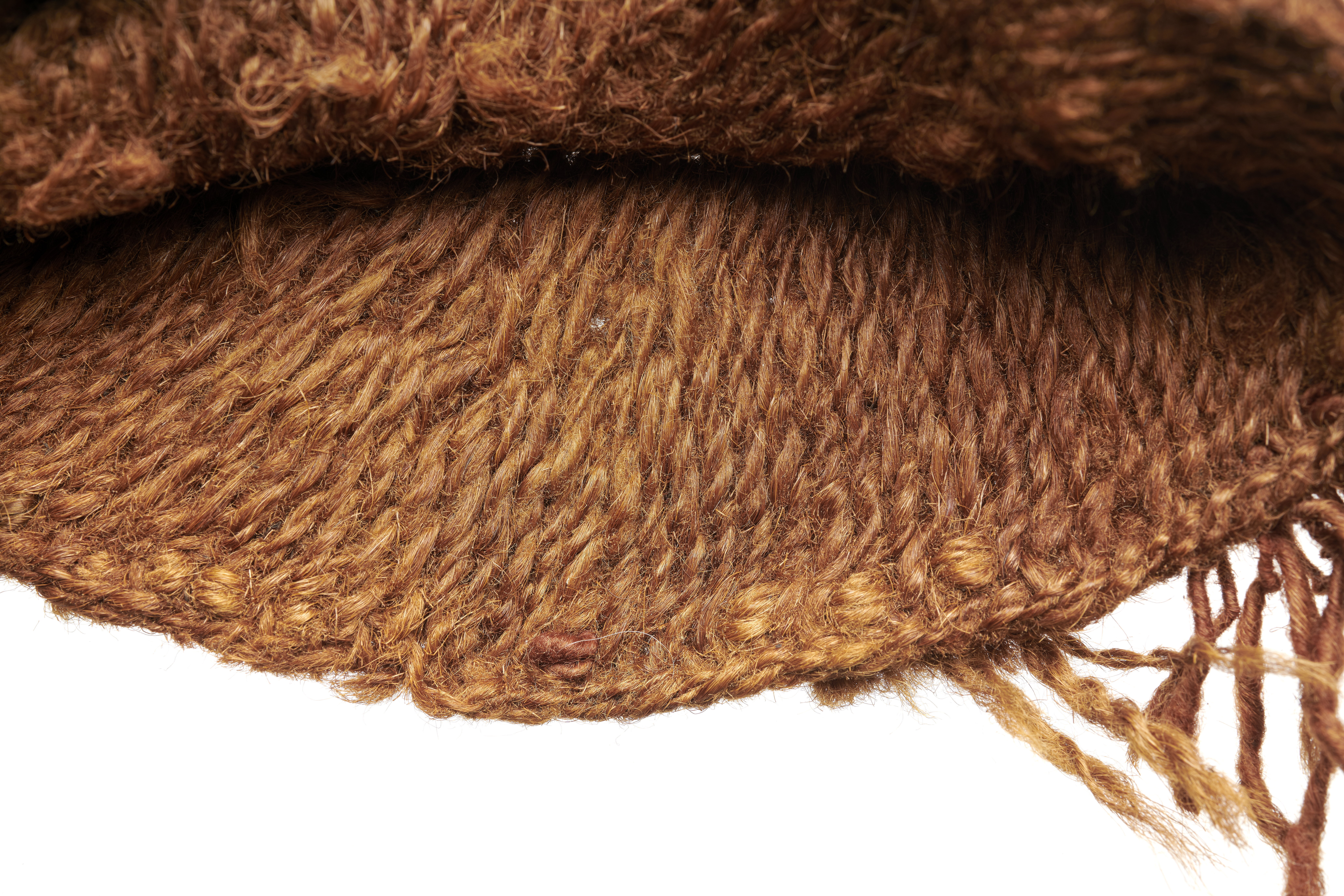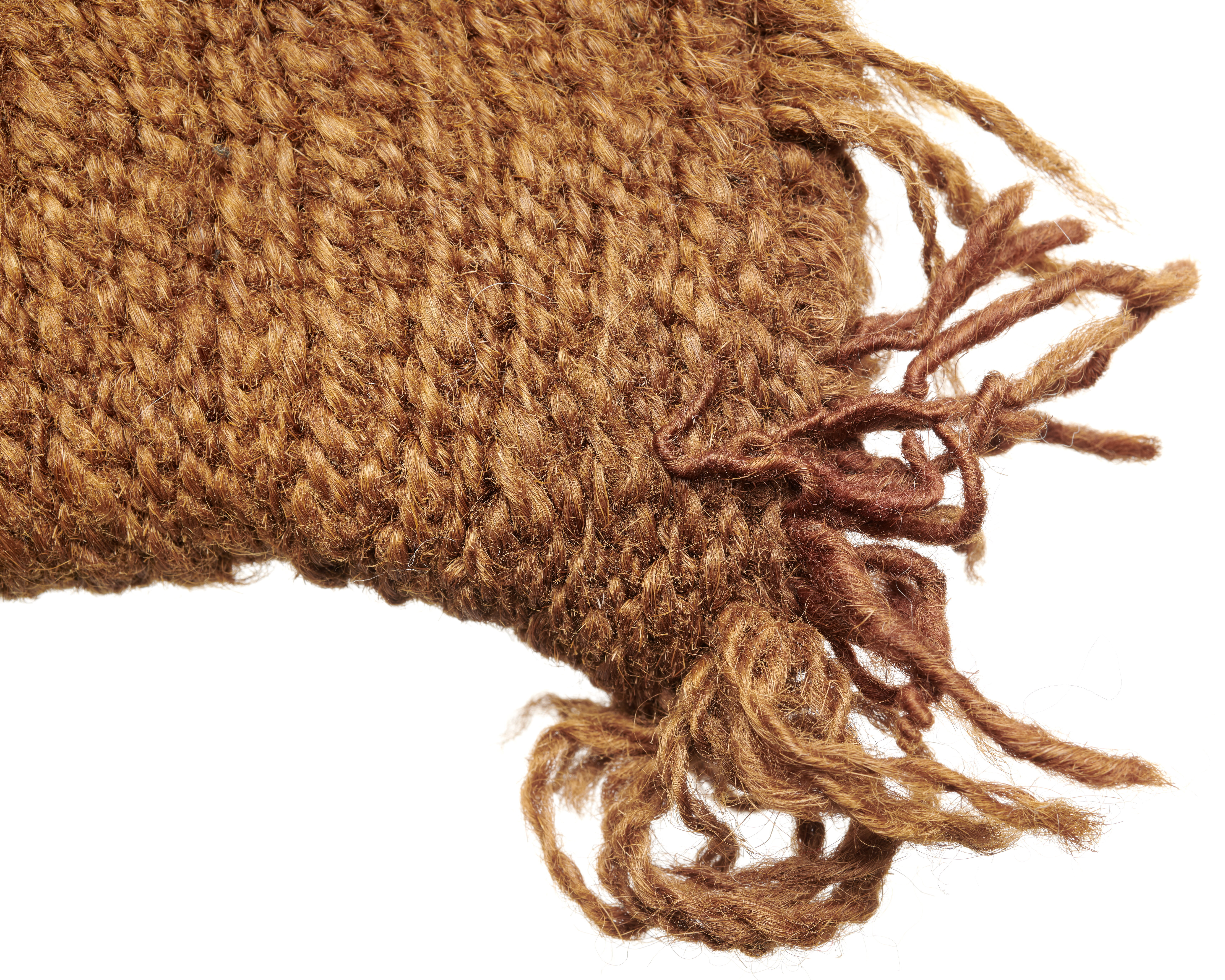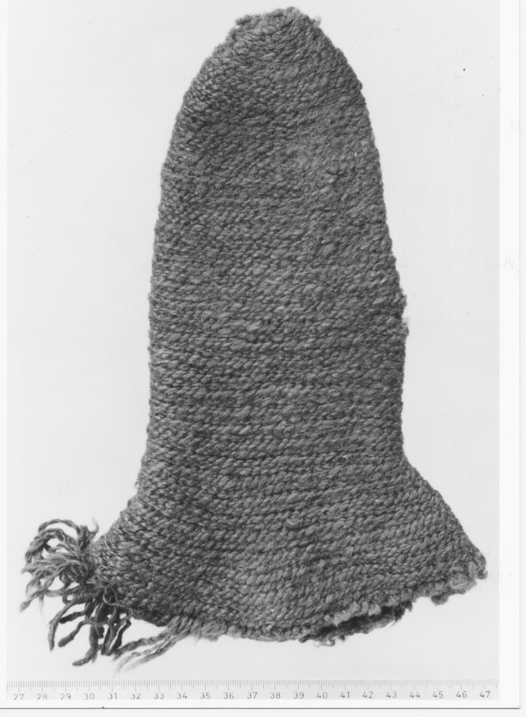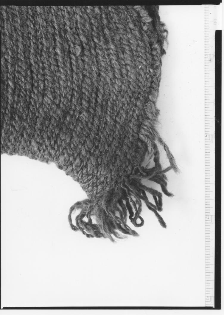 Nålbunden vänstervante av ullgarn, ursprungligen sannolikt ofärgat. Frans av rött, grönt och ofärgat ullgarn runt kragen.// Garnet Z-spunnet och S-tvinnat. Daterad med C-14, resultatet visar AD. 1510-1640.