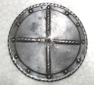 Driven stålplåt, blankslipad utsida. Cirkulär platt skiva, diam 174 mm, med omvikt rundsmidd kant. Innanför denna 10 mm bred slät och något försänkt bård med nitar. I mitten fyra drivna åsar bildandes ett likarmat kors med enkel dekor av punsade snedställda linjer. I mitten genomgående hål, diam 4,5 mm. Insidan brunsvart med tydliga slagmärken.