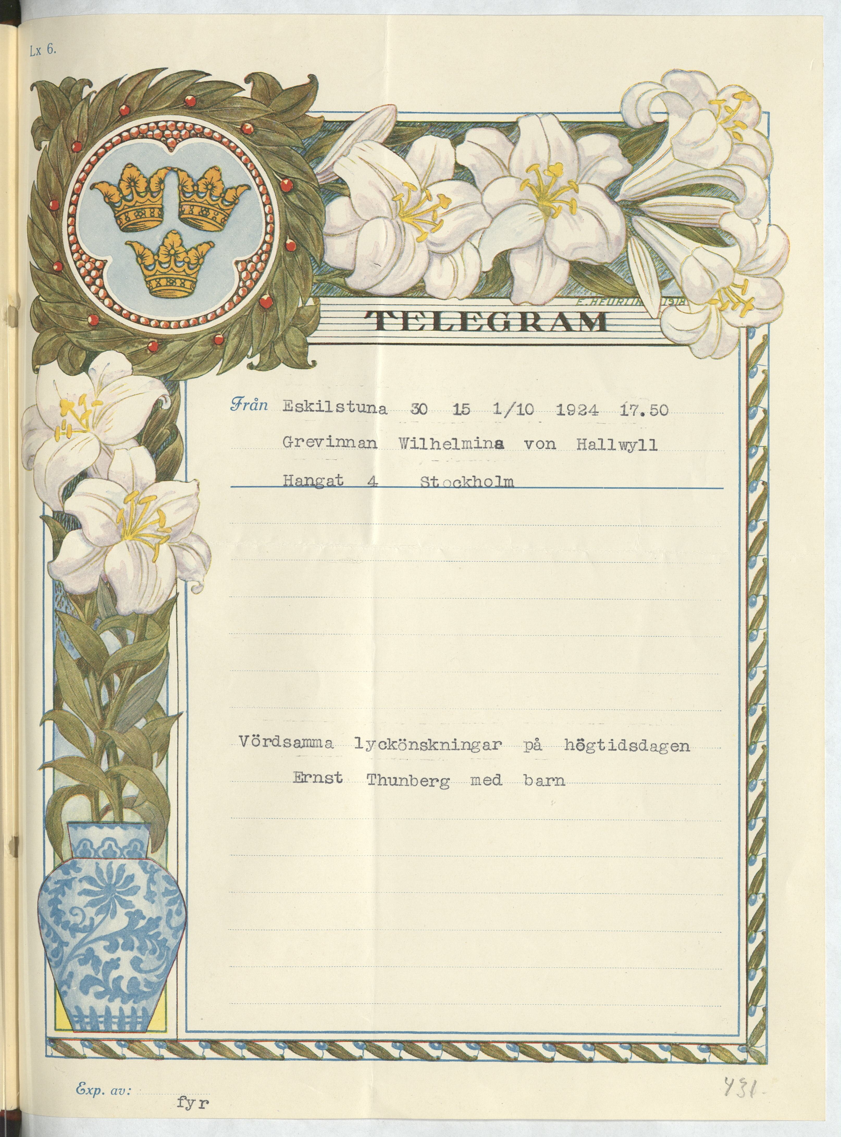 Telegram från Ernst Thunberg med barn