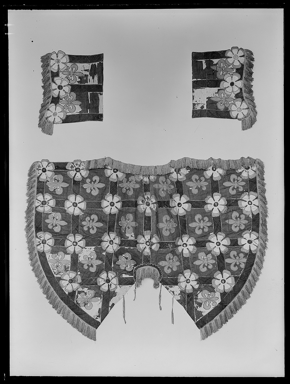 Ett Tornere Täcke med utzijrat arbete af rödt utskurit Sammet och hywitt Atlask i blomwärck, samt smala Silfwer Snöreni Kanterne, bestående af ett stort Täcke ofwan på hästen, och dess utom ett Eschabraque på hästländen, en Hals Kappa och Twå små stycken at bruka under Steglädren, med Silfwer i röda Silckes Fransar, wid alla stycken på behöriga ställen ?? somliga äre fordrade, wärderade tillhopa för - 200:-