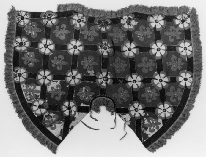På en botten av vit taft är applicerade ca 65 mm breda röda sammetsremsor, tagna på diagonalen, i ett rutsystem. Där remsorna korsar varandra är applicerad en dubbel blomma av sidenatlas den undre röd och ca 180 mm i diameter, den övre vit och ca 140 mm. På varje ruta en stiliserad lilja ca 90 mm hög och 160 mm bred. En rosett ca 20 mm i diameter av ibland guldgalon och ibland av silvergalon i blommornas mitt. Applikationerna kantade med 3 mm breda silverflätor.