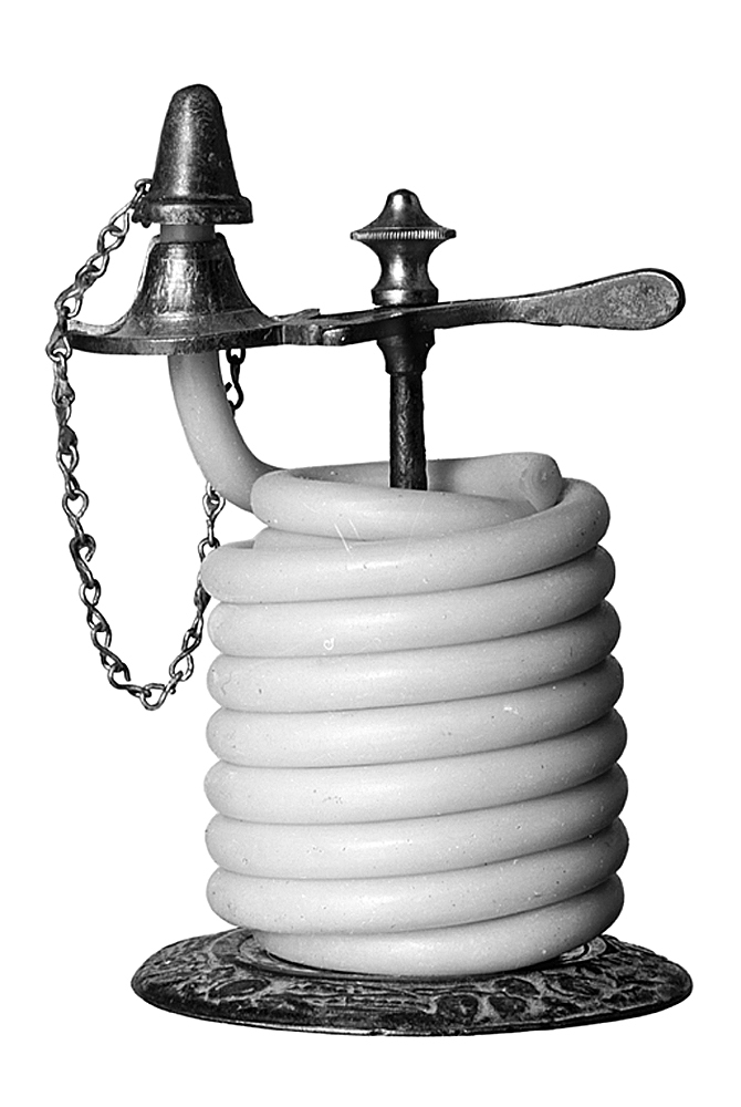 Bestående av en något kupig rund fotskiva, på vars översida kring kanten i relief en bård med en ranka av rosor och liljekonvaljer med blad, inom bården en guldfernissad smal grund käl. I skivans mitt en rakt uppstående stolpe för stapeln, nedtill med en hög hals mellan två trissliknande utsvängningar; på stolpens övre ända en horisontalt liggande saxliknande hållare med halvrunda blad och bågformiga skänklar med fyrsidigt tvärsnitt samt utvidgade rundade ytterändar, mellan skänklarna en stålfjäder; bladen sammanförda mot varandra bildande en rund skiva med starkt uppskjutande konisk mitt, varigenom ett runt hål för stapeländan; över upphöjningen en konisk hatt, fäst vid ena bladet medels en kedja med skevande 8-formiga rundstaviga länkar; hållaren fäst vid stolpen medels en på denna skruvbar guldfernissad profilerad knopp. Vaxstapel (ny): Av ljusgult vax, med veke och runt tvärsnitt samt spiralformigt hoplindad i två koncentriska varv. Grovlek: 0,9 cm. Tillhört inventarierna på firman Wilh. H. Kempes (innehavare Walther von Hallwyl och Johanna Kempe, f. Wallis) kontor, inrymt i Blasieholmstorg 11, 1884 - 30 September 1896, och Hamngatan 4, 1 Oktober 1896 - 1909; sedermera på Walther von Hallwyls privata kontor 1909 - 1921 samt slutligen på Wilhelmina von Hallwyls, f. Kempe, kontor där från sistnämnda år t. o. m. 1930.