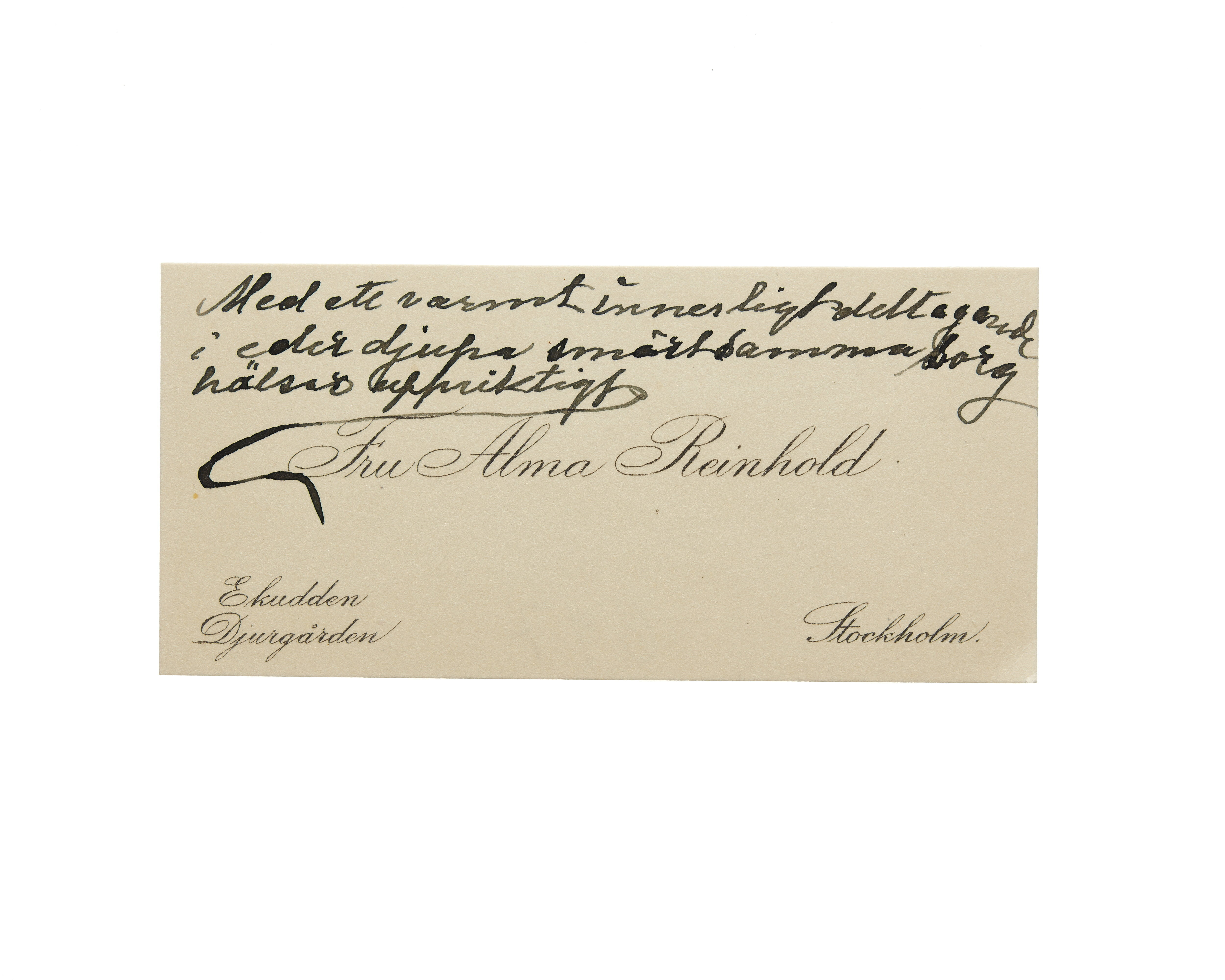 Ett visitkort från Fru Alma Reinhold, daterat 1921. Adress (nedre vänstra hörnet) Ekudden, Djurgården, (nedre högra hörnet) Stockholm. Handskrift "med ett varmt innerligt deltagande i din djupa smärtsamma sorg hälsas uppriktigt".