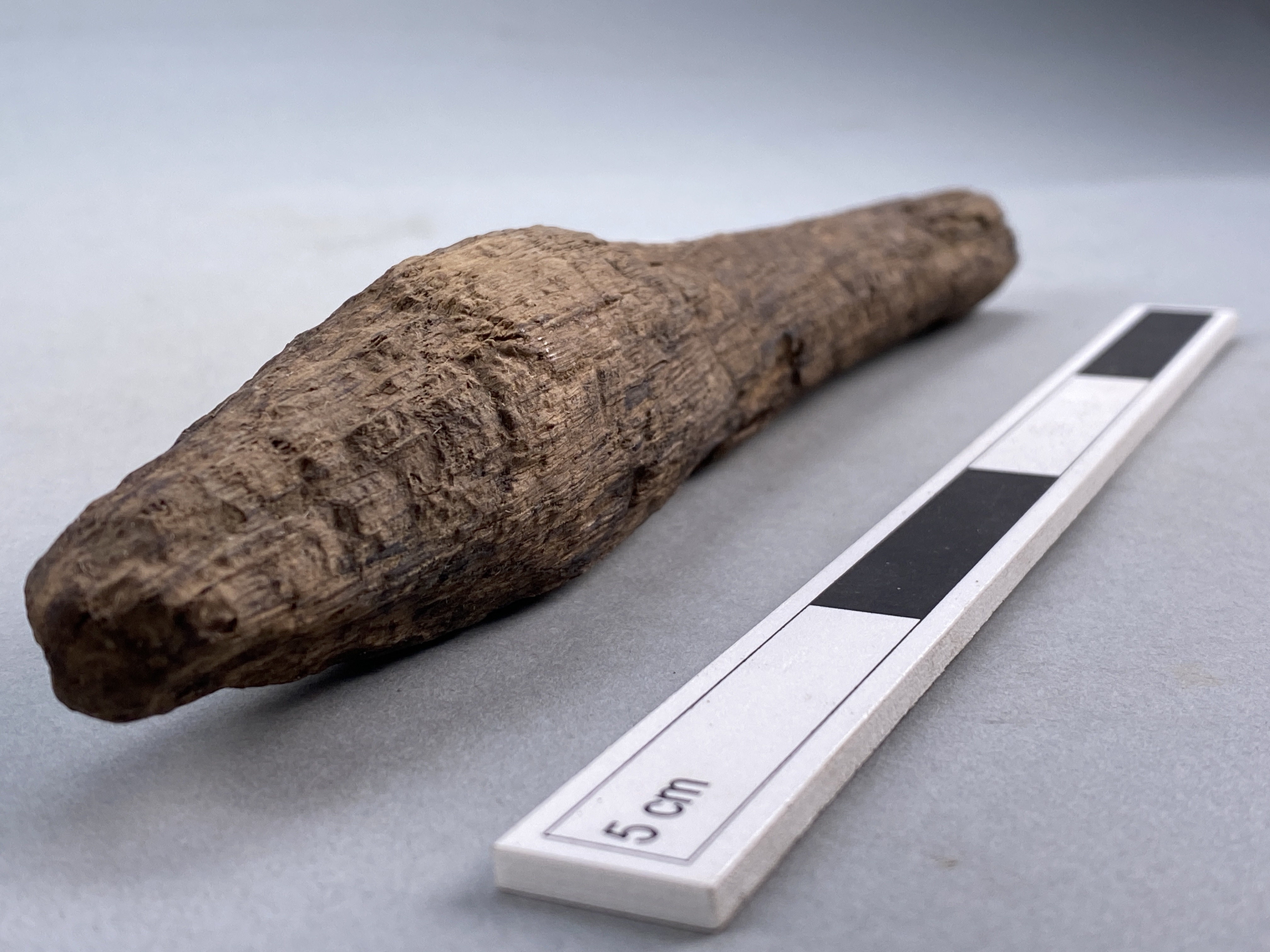 Långsmalt föremål som har ett tjockare parti med ett urtag. Kraftig eroderad.
