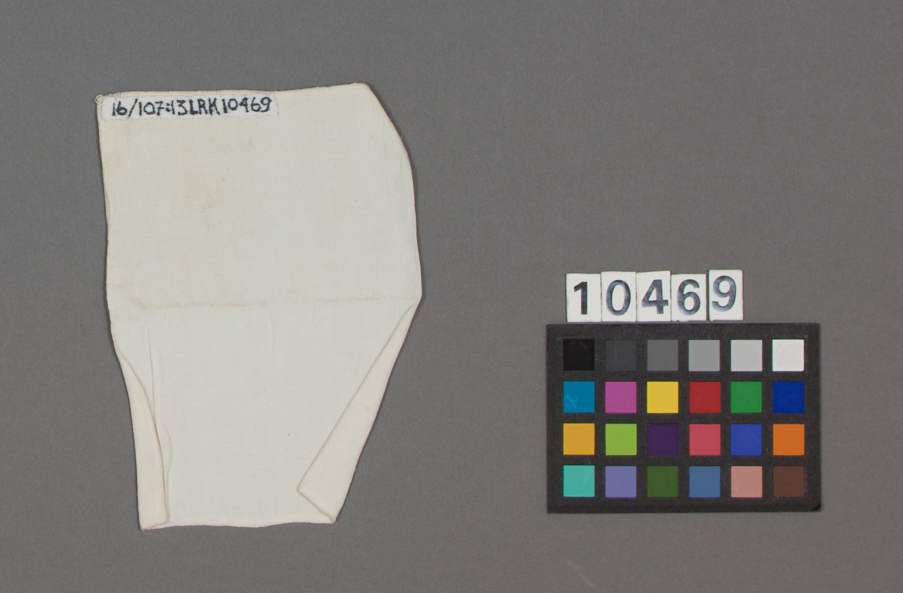 Plagg ingående i en korg med babykläder som använts av Sofia och Oskar (II):s barn. Rektangulär navellapp av dubbelt linnetyg med handsydda sömmar. L: 131mm, b: 95 mm