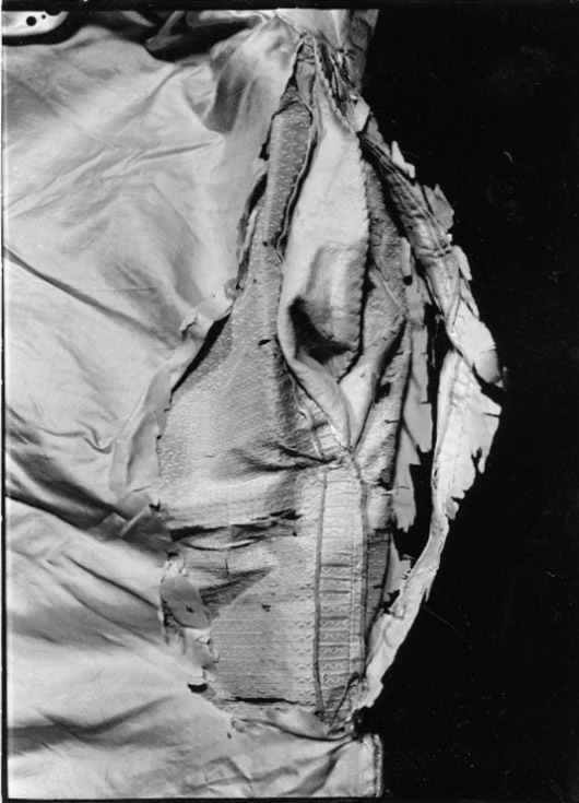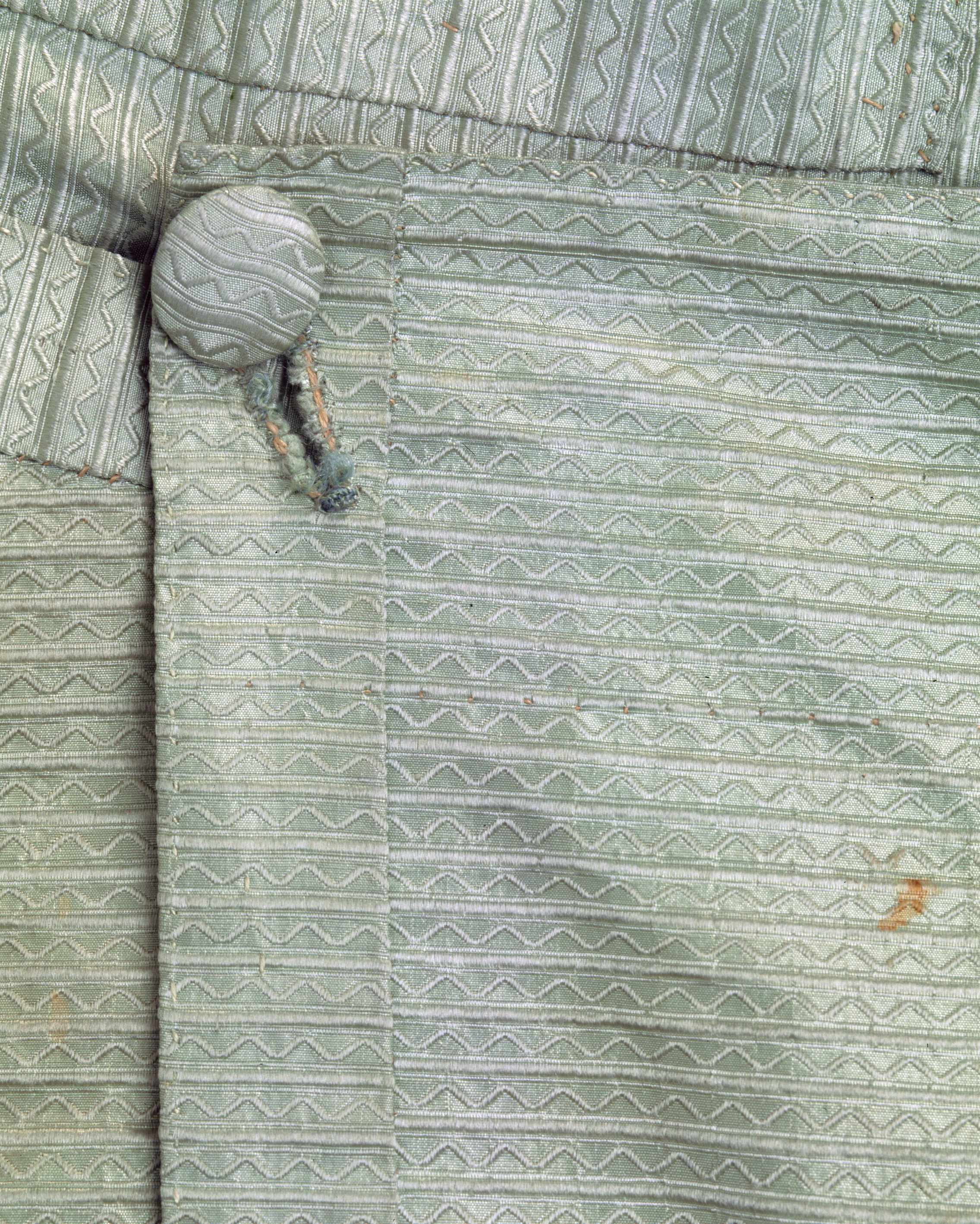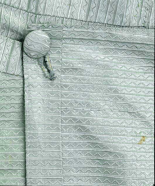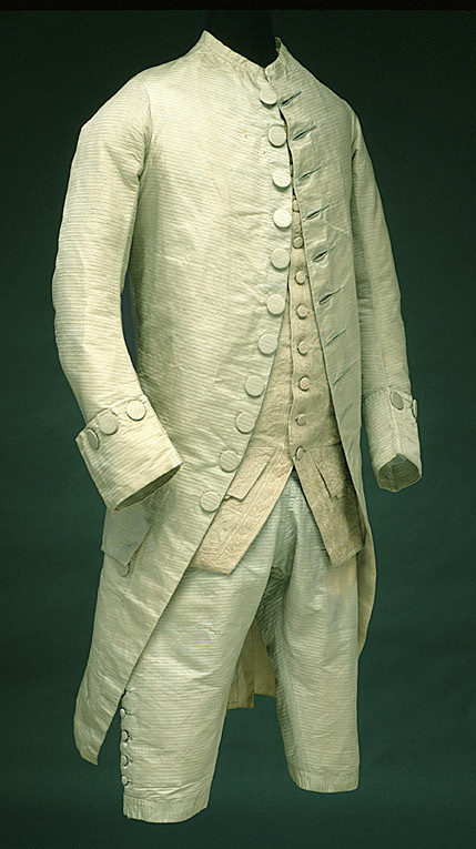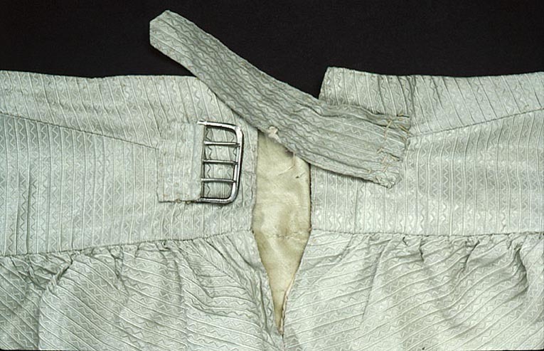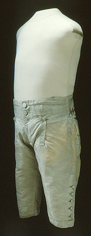 Byxor i samma gröna sidentyg som kappan, med lucka fram och sex fickor. Snävt skurna framstycken med bensprund och knälinning. Något rundad fram över knät och urringad bak i knävecket. Linningen är bredare fram än bak och byxan ökar i höjd baktill där den rynkats fast mot linningen (snäv framsida och stor rumpa!) Mitt bak finns spänntampar vid sprundet mitt bak och ett spänne? Bak mot sprundet är tyget skarvat med en liten kil och linningen är också skarvad med kilar på baksidan. Byxorna har två fickor i linningen med liggande fickstolpar, en tagen på snedden och en trådrakt, fickpåsar i Linne? bomull? De stora fickorna i skarven mellan byxa och linning har fickpåsar i sämskskinn och ficköppningen kantas med tyget, snedställda knapphål i ficklockets hörn, klädd knapp. Totalt har byxorna 21 st knappar, 14 st (12 mm); 3 st (21 mm) ; 2 st (18 mm metallknappar) ; 2st (16 mm) 5 klädda knappar vid bensprundet. Knappen till benlinningen saknas. Mitt bak finns ryggslejfar kvar och ett metallspänne. Byxbenen är ganska snäva ner mot knät skurna som andra av GIII:s byxor med ökad vidd över stussen på bakbyxan som är högre än frambyxan. Foder i ljust kypertvävt siden. Mitt bak i sprundet sitter en trekantig iläggning av taft.