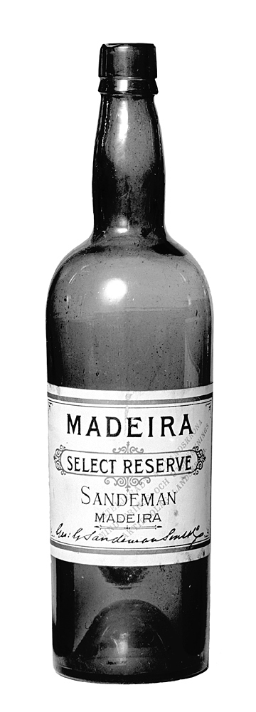 "SELECT RESERVE", Sandeman, tjugosex helbuteljer. Av brunt glas. Cylindriska, med kupigt indragen skuldra och spolformig hals med en bred och en smal stärkring; bottnen konisk. Etikett vit, på denna text och firmanamn i svart, dessutom snett över text i rött: "Buteljerat av Landskrona Minuterings- och Utskänknings Aktiebolag Landskrona". Höjd: 28,8 cm.; diameter: 7,8 cm.