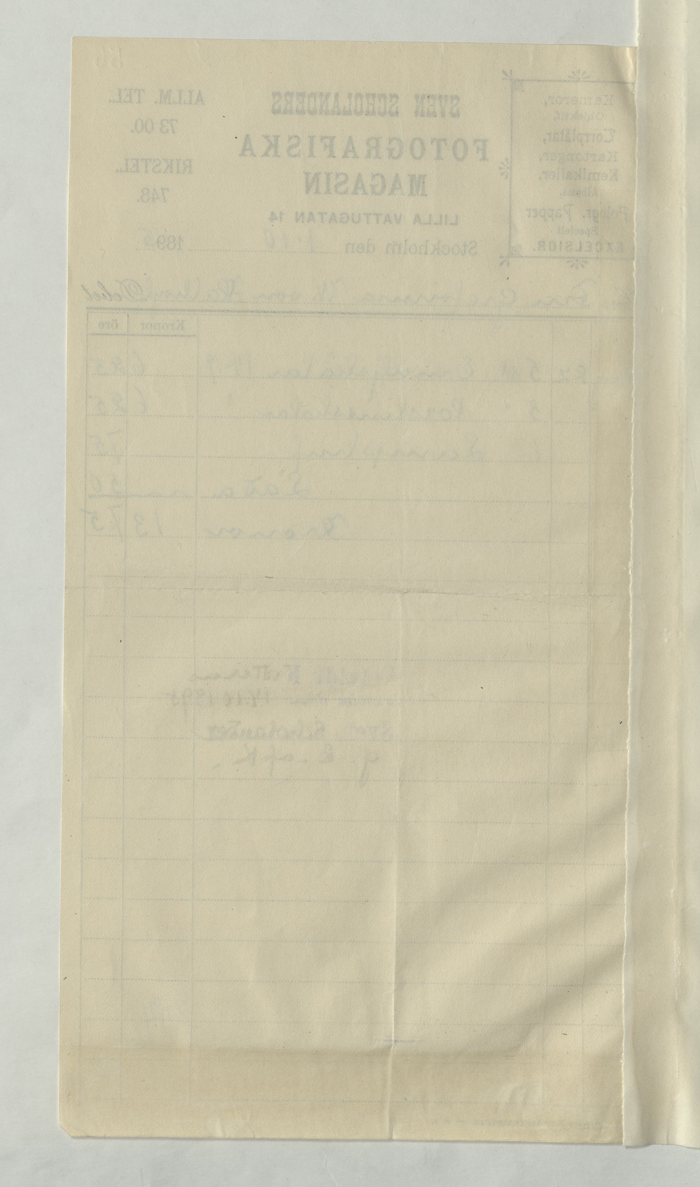 Kvitto från Sven Scholander, Bildhuggeriaffär för fotografiska artiklar