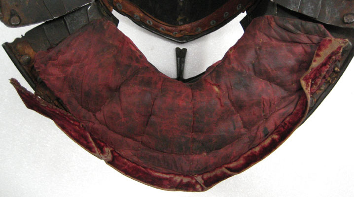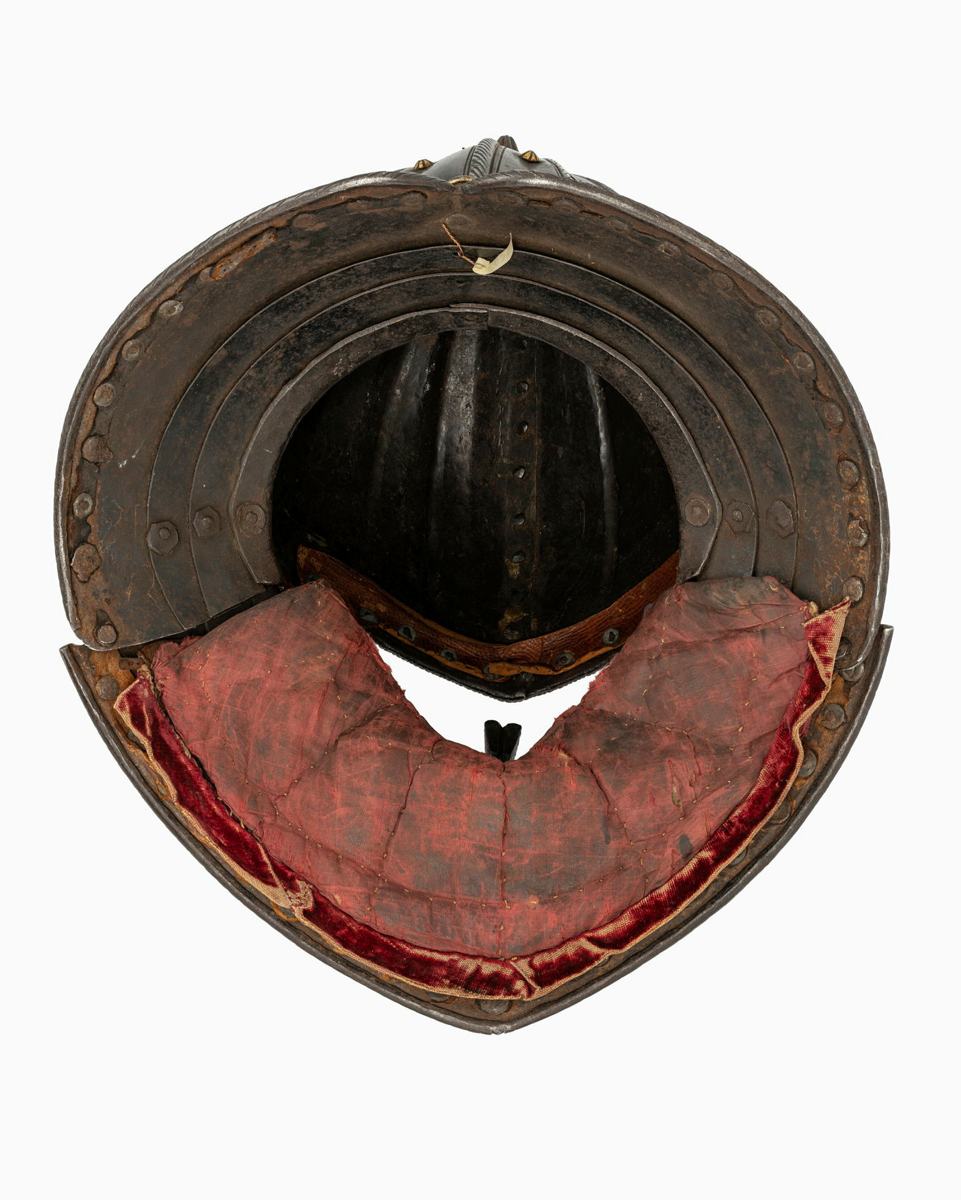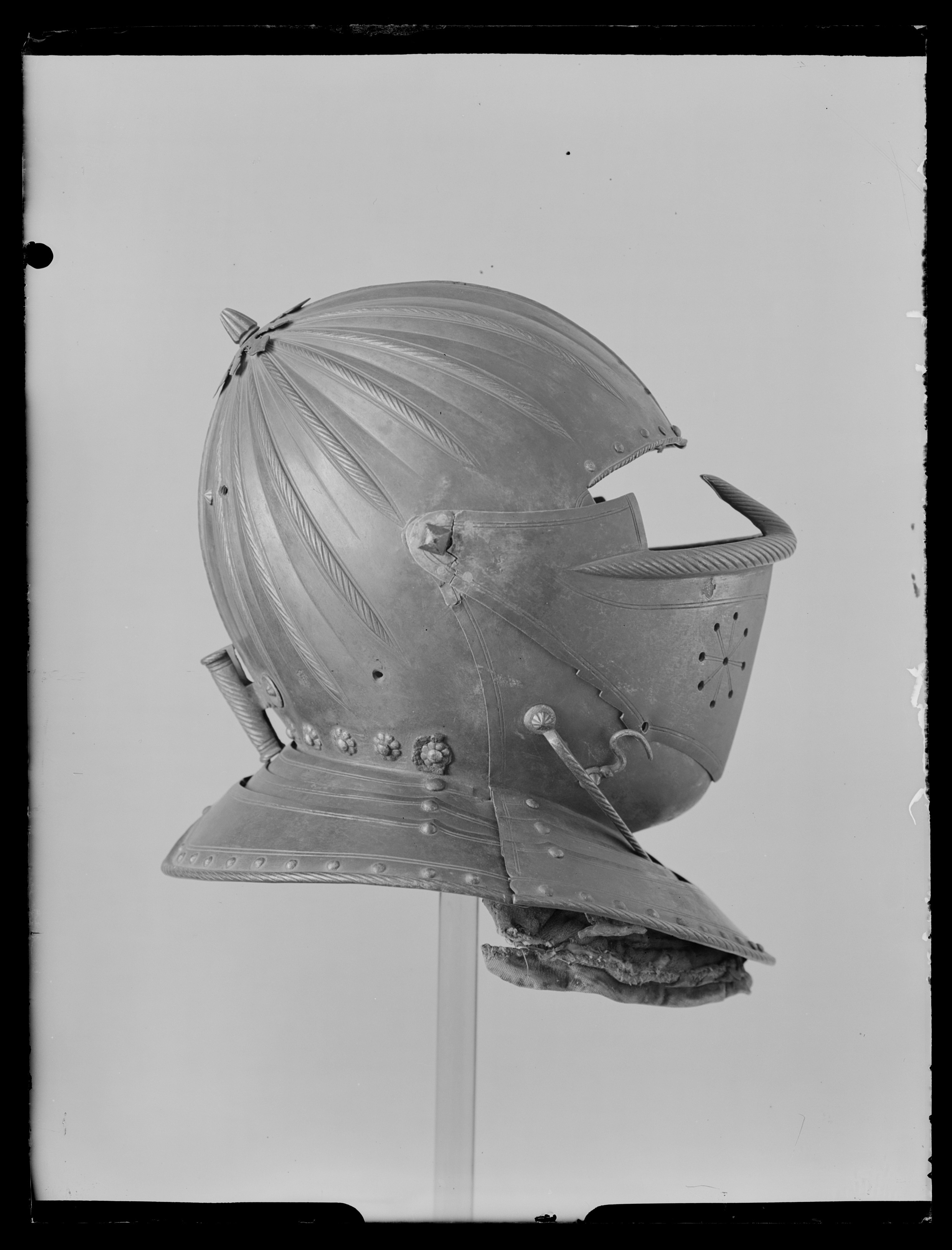 TILLÄGG Hantverksmässigt mycket väl utförd. Klockan som är i två delar är skickligt sammansatt och döljer skarven väl. Formmässigt är hjälmen mycket välgjord. Repstavens mejsling stämmer väl överens med lårskenorna inv.nr. 23120-23121 samt axelstycket 23170. Dessa delar kan samhöra med hjälmen. Stämpeln på hjälmens visir och på klockans högra sida, bak, överensstämmer med de övriga delars stämplar. På baksidan av klockan fyra stycken gängade hål med oklar funktion. Läderremsa för uppfästning av foder i pannan utbytt. Ursprungligen sannolikt blånerad. Ursprungligen har en rem med sölja varit fast nitad och hållit samman bakstycket med hakstycket. Hjälmen har varit försedd med en pannklaff med utstickande skärm.