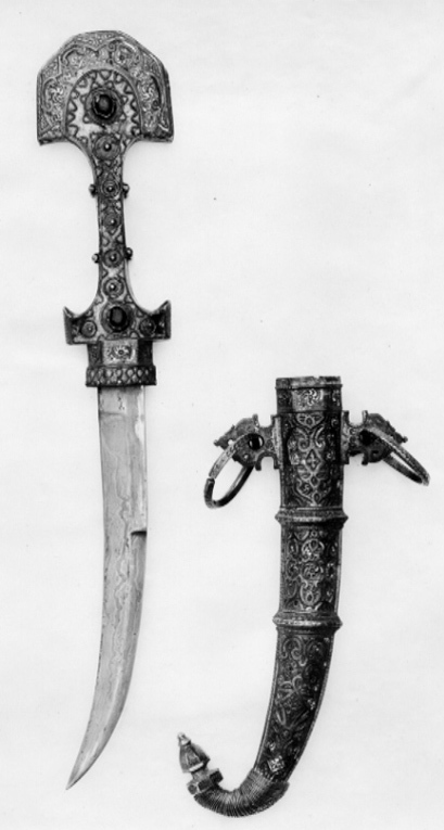 Fäste av trä klätt med mässingsplåt. Sidorna insvängda med två tvärgående vulster. Fram-bak- samt insidorna med yttäckande ornering av enkla graverade linjer och streck. Utsidan med dekor av silverplåt och olikfärgad emalj samt upptill och nedtill en stor rödslipad sten (glas?). Nedanför fästet en 24 mm hög holk av silver samt gul och blåemaljdekor. Klinga böjd, damaskerad, tvåeggad utom 79 mm från basen på ena sidan. Ricasso ca 17 mm. Klingan slipad med mätande skär.