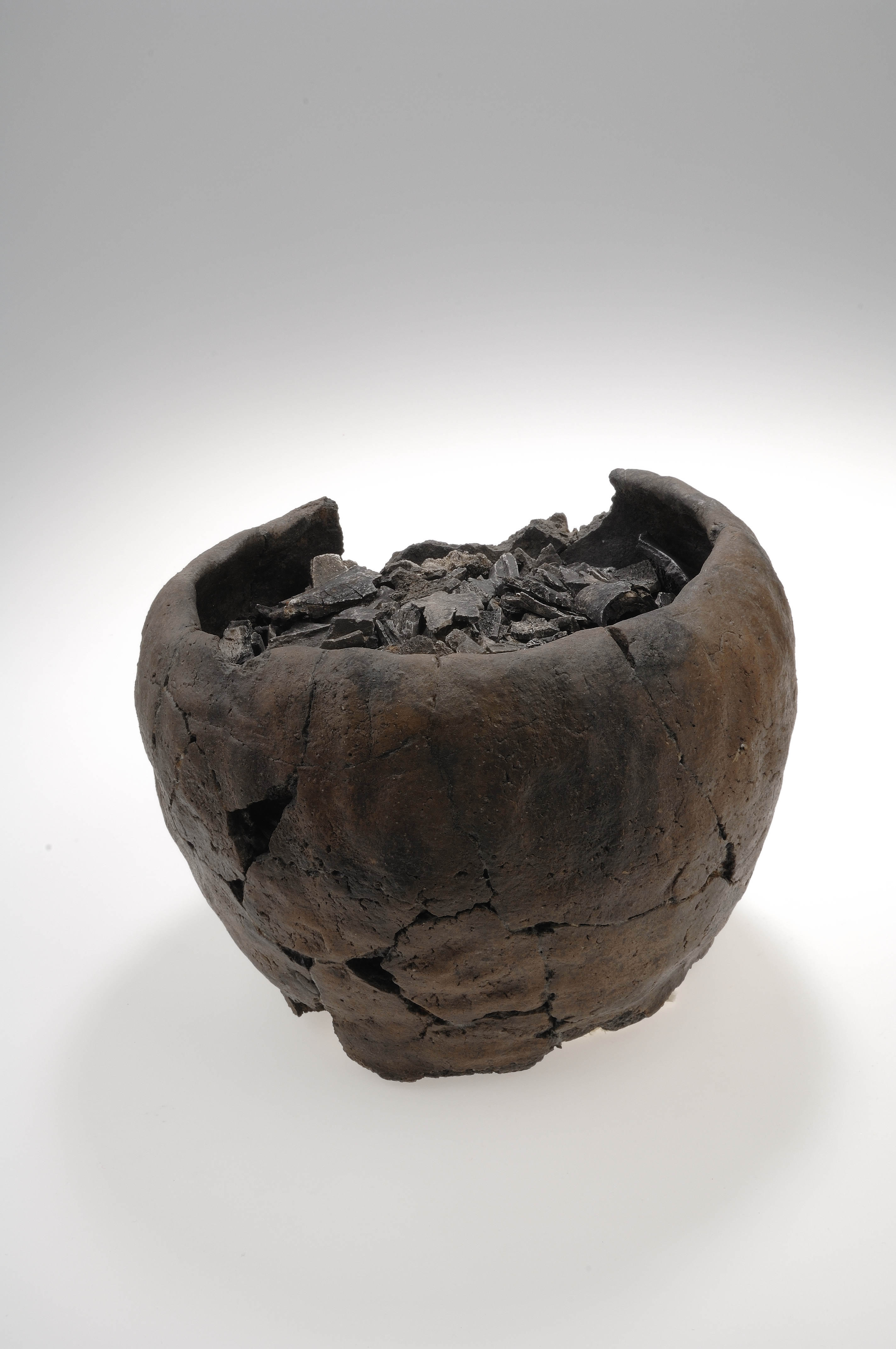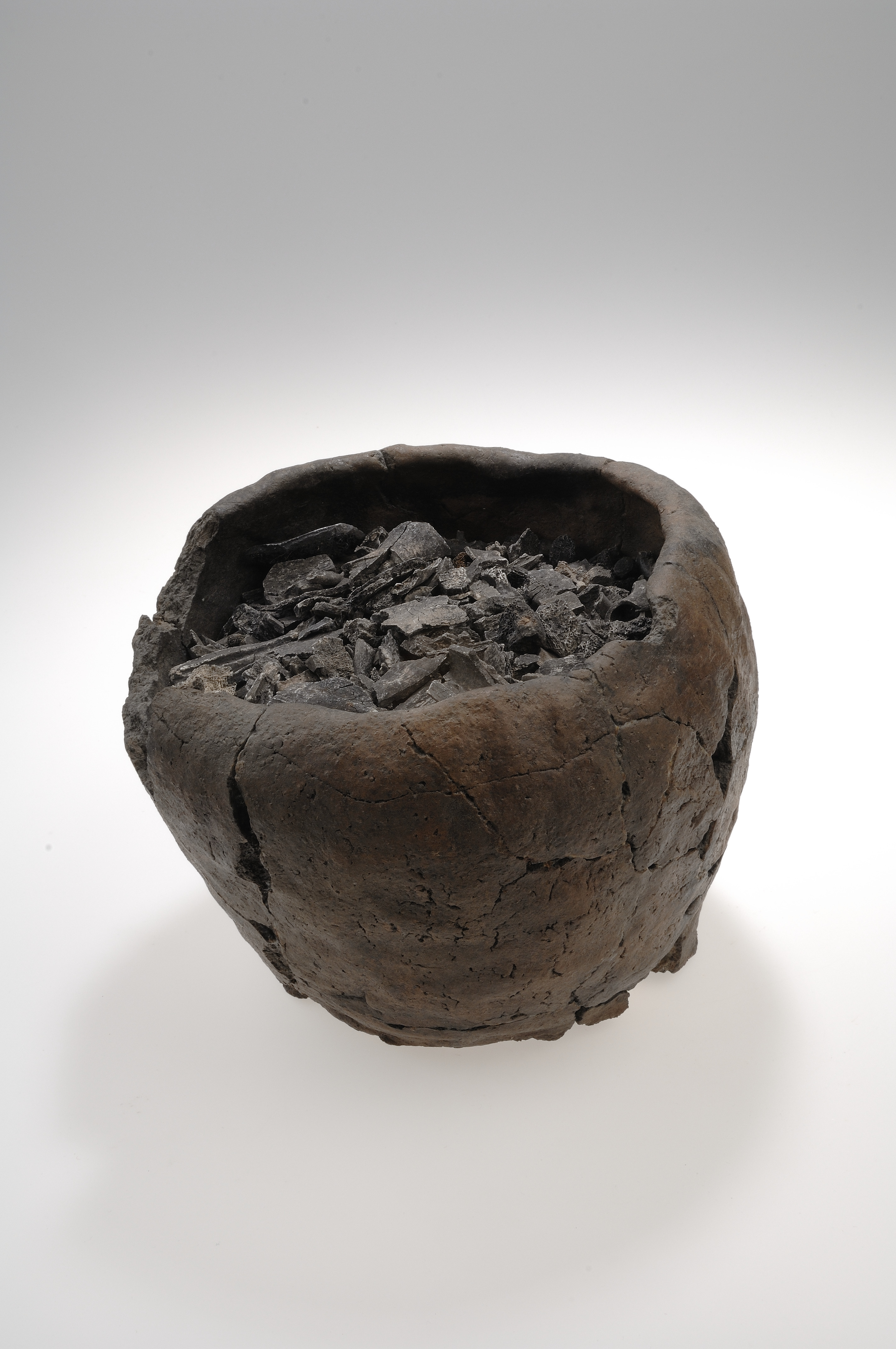 Ljusbrunt, odekorerat AIV:3a1-kärl använt som benbehållare. Innåtböjt mynningsparti och utåtsvängd botten.