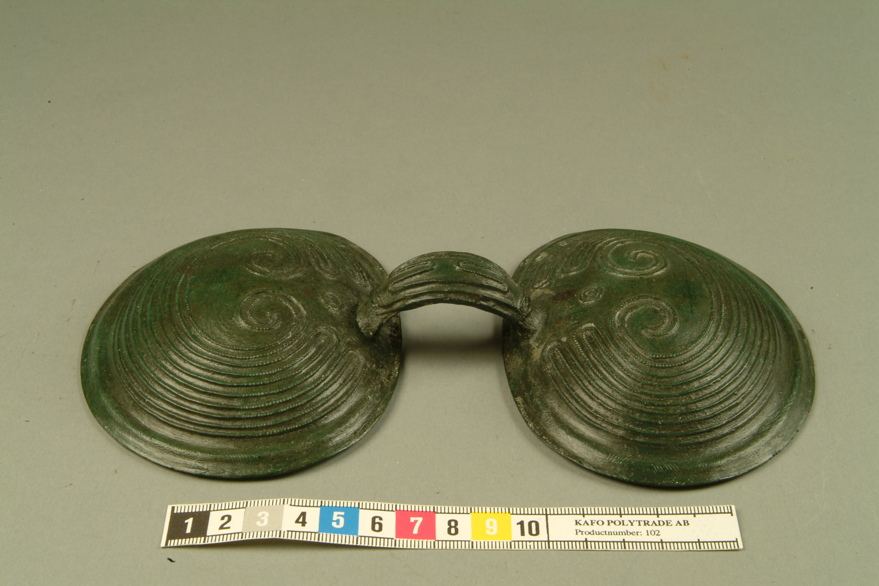 Stort glasögonspänne av brons med högt välvda skivor med ornering. Nålen fattas.