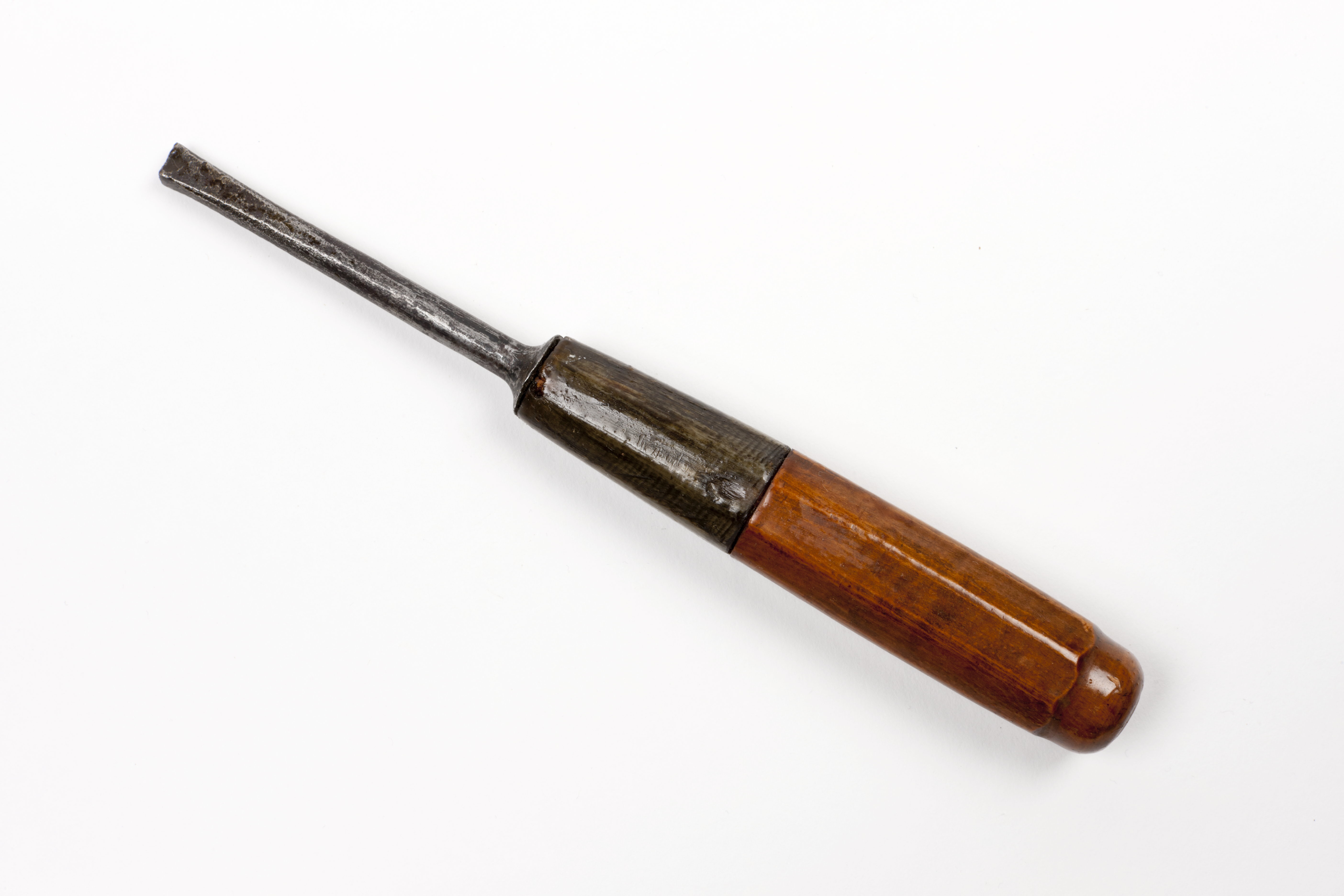 Bildhuggarjärn. Grovt smidd rund klinga. Vidgad bas. Skuret, åttasidigt skaft av buxbom. Hornring. Stämpel på klingan.
