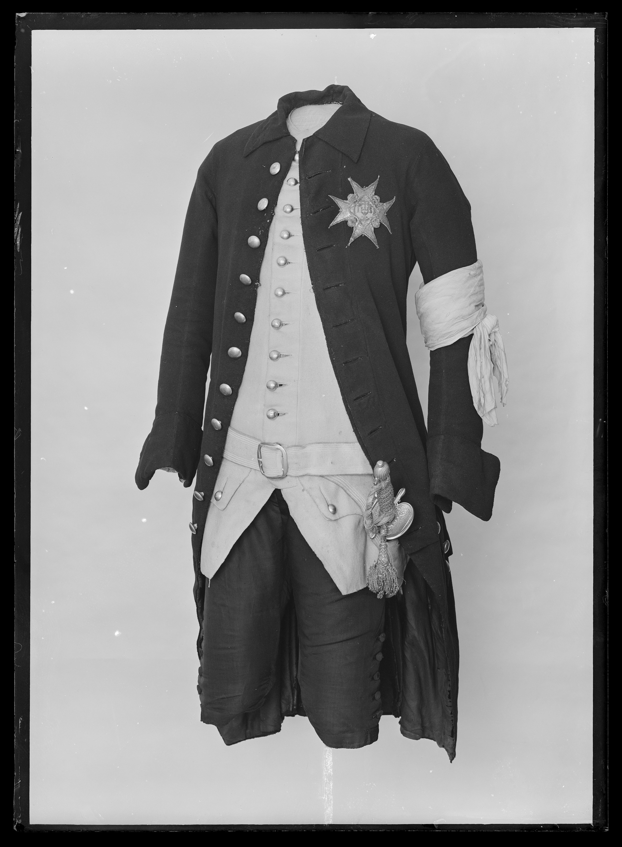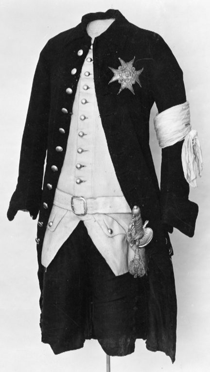 Öfvertyget på flera ställen skadadt af mal, å kapprocken delvis lagadt med svart silke; fodret så väl i kappa som rock söndrigt. Till denna drägt hörer en värja, upptagen i Armeförvaltningens invent. N:r 2011.
