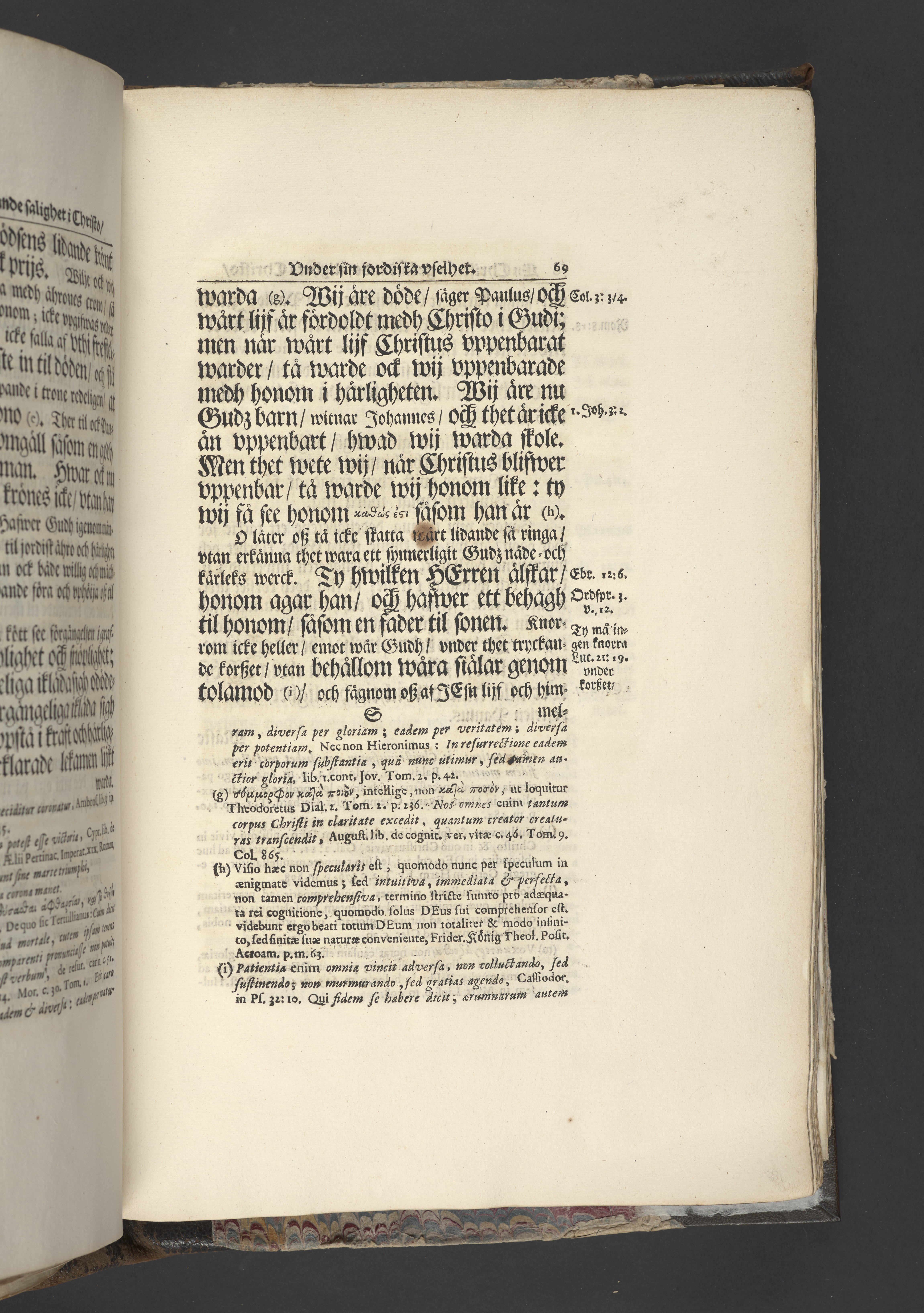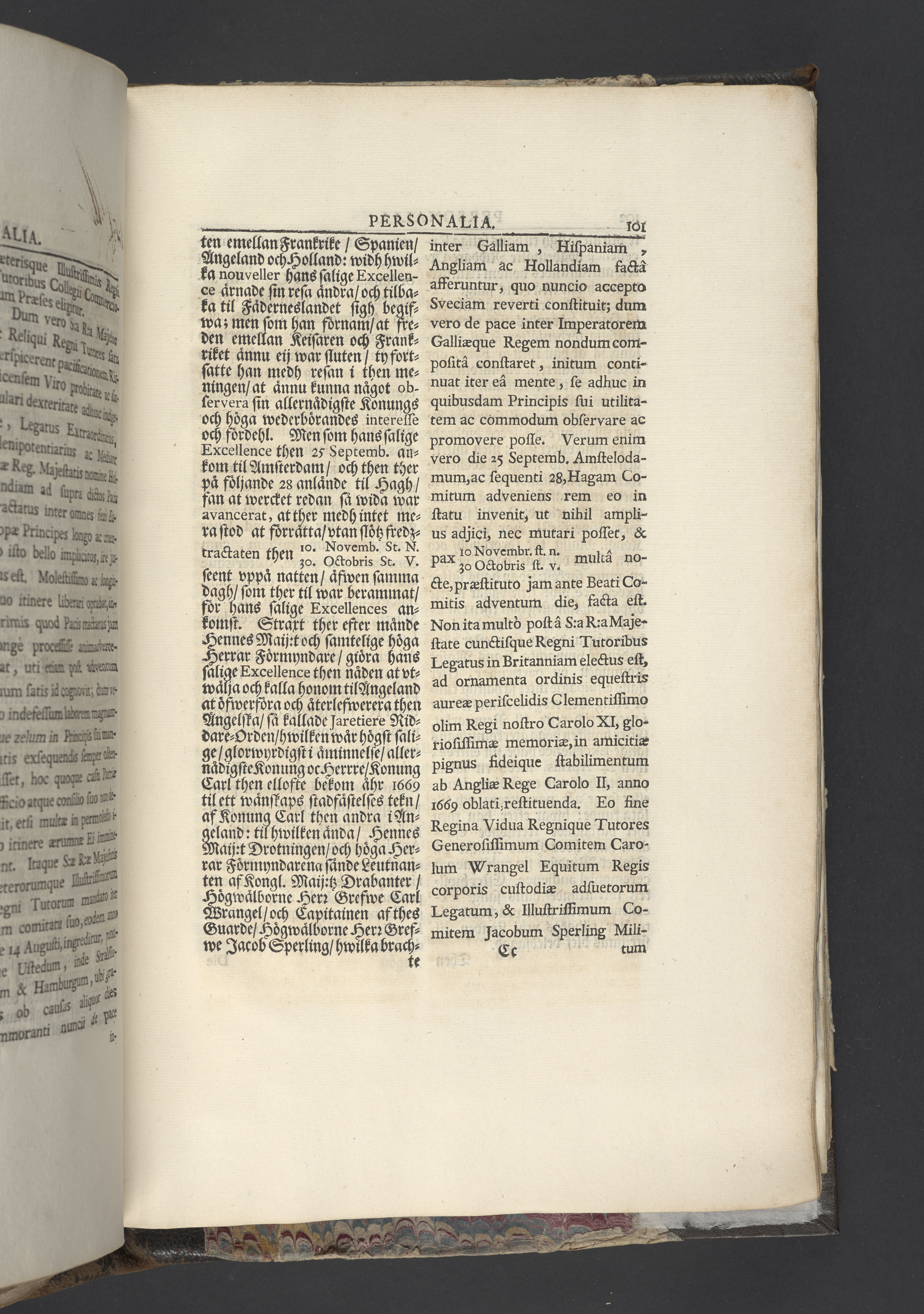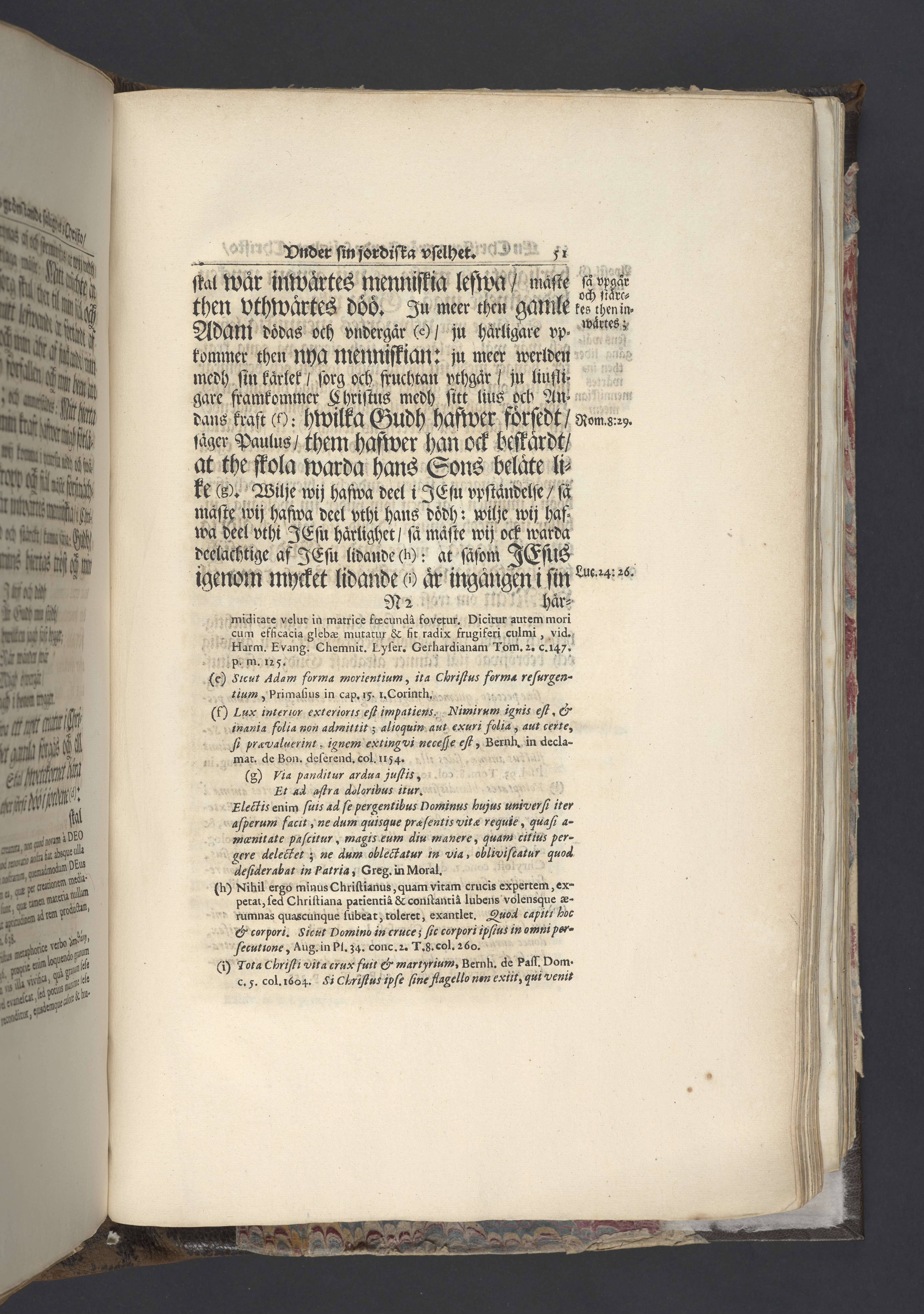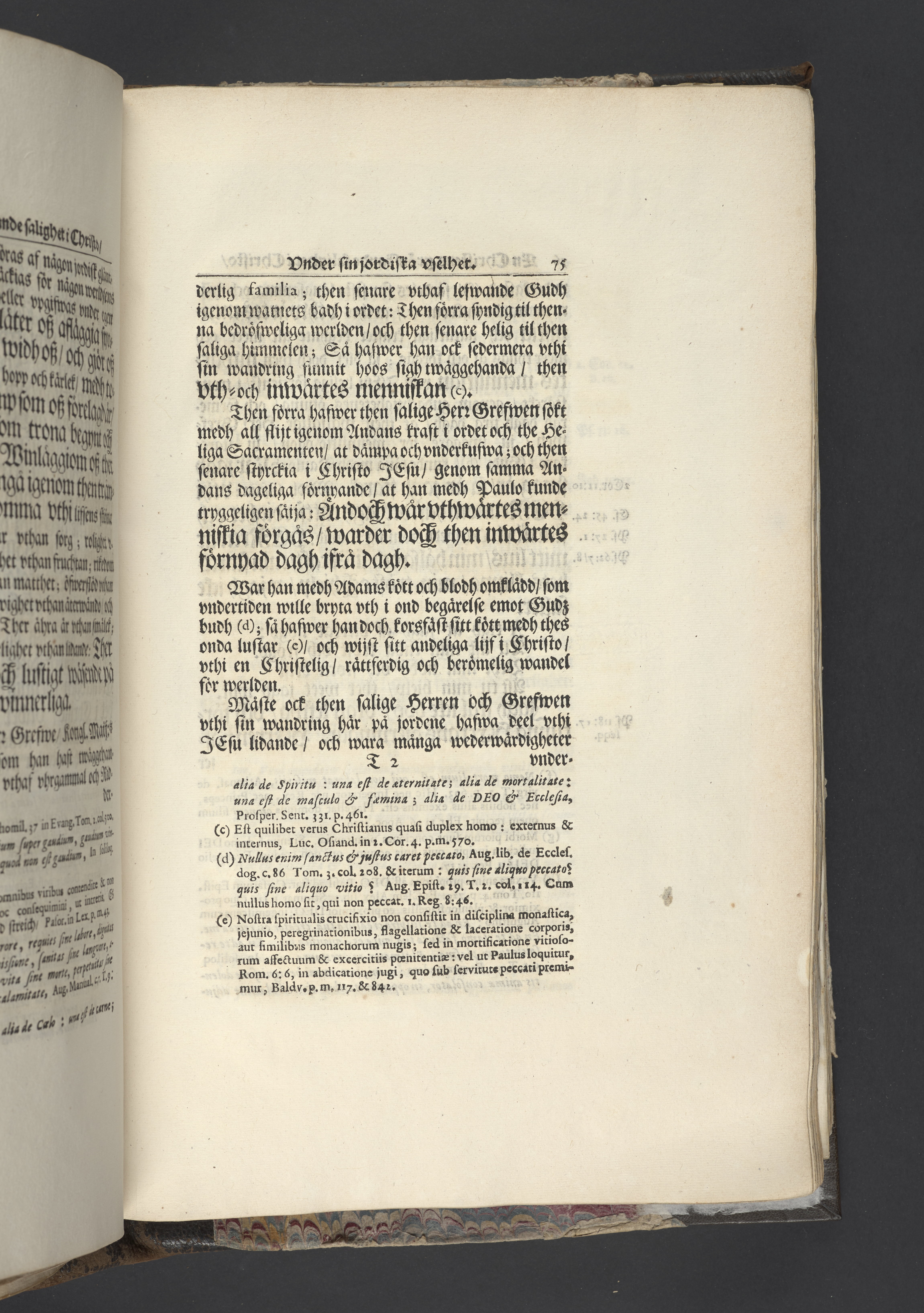 Band m. pärmar av marmorerat papper, rygg och hörn av pergament. Pärmfyllnad: trä.