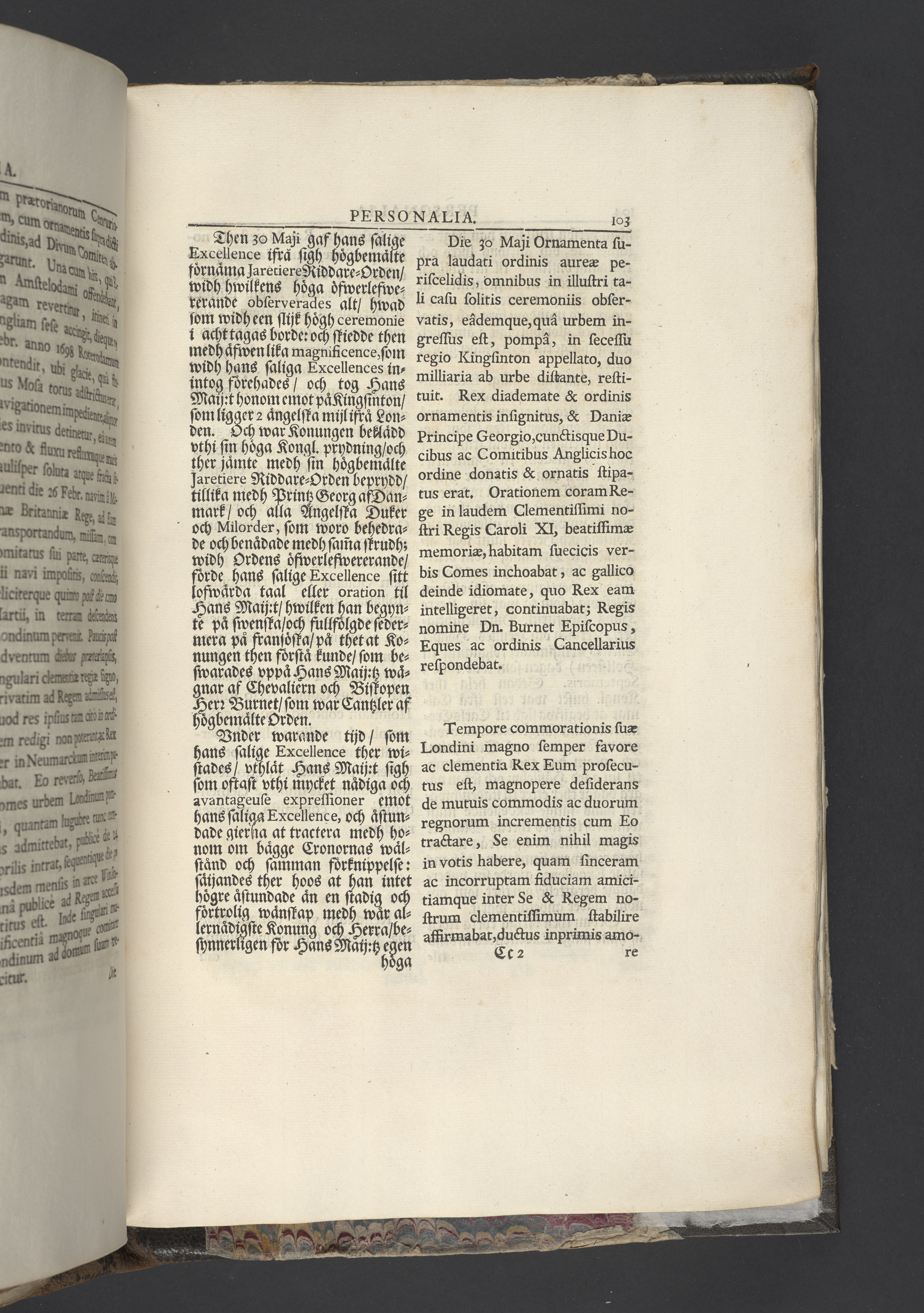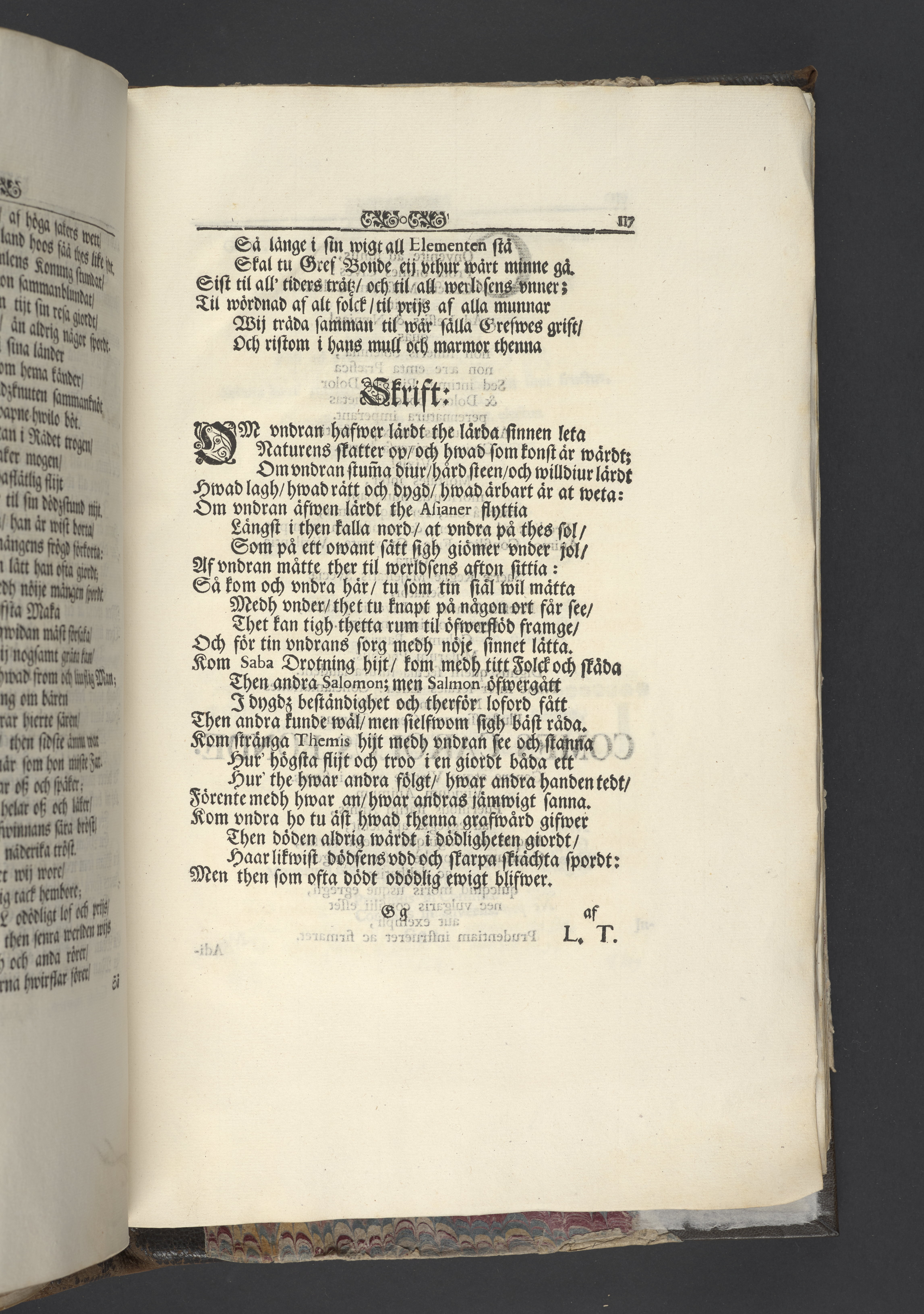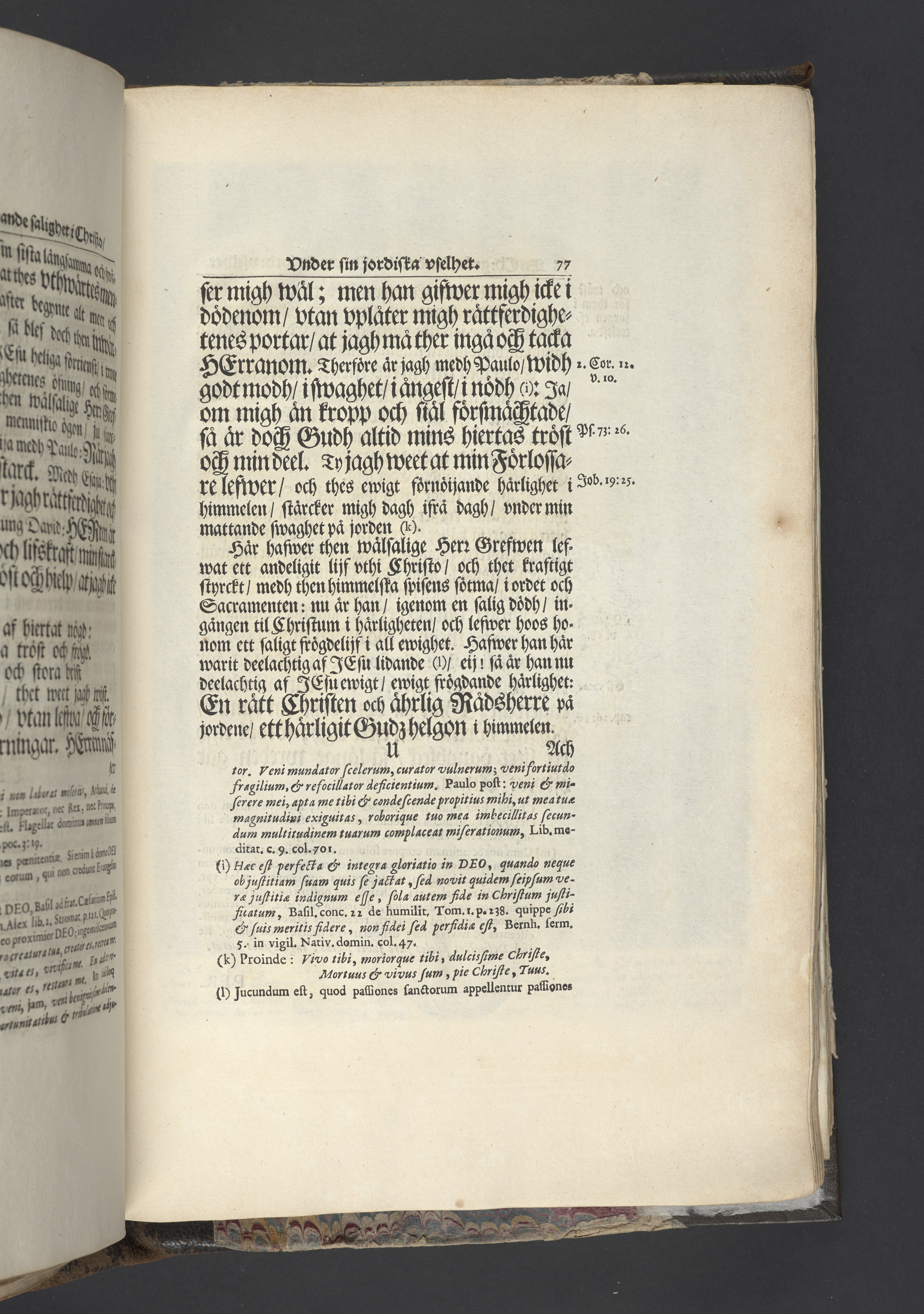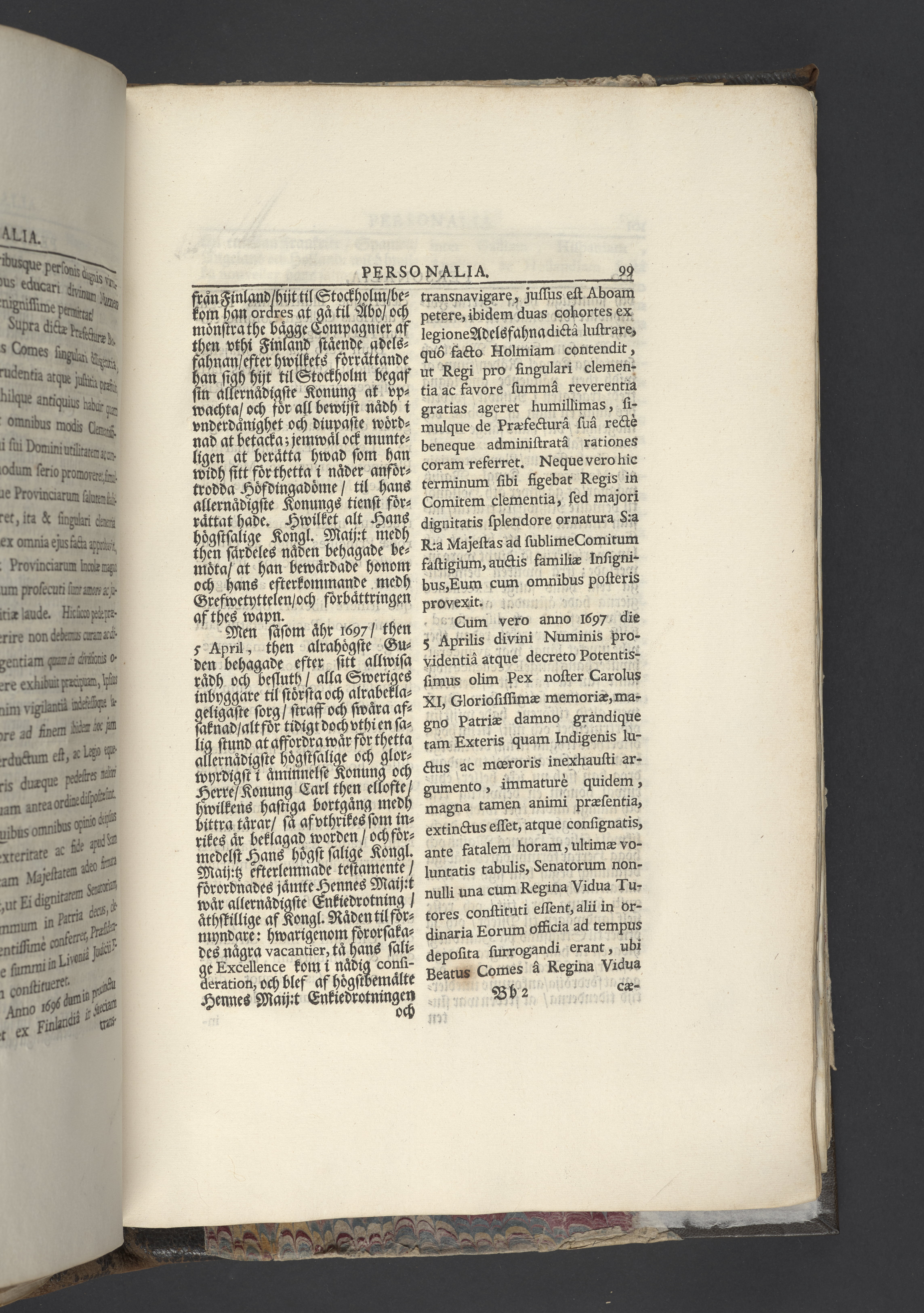 Band m. pärmar av marmorerat papper, rygg och hörn av pergament. Pärmfyllnad: trä.