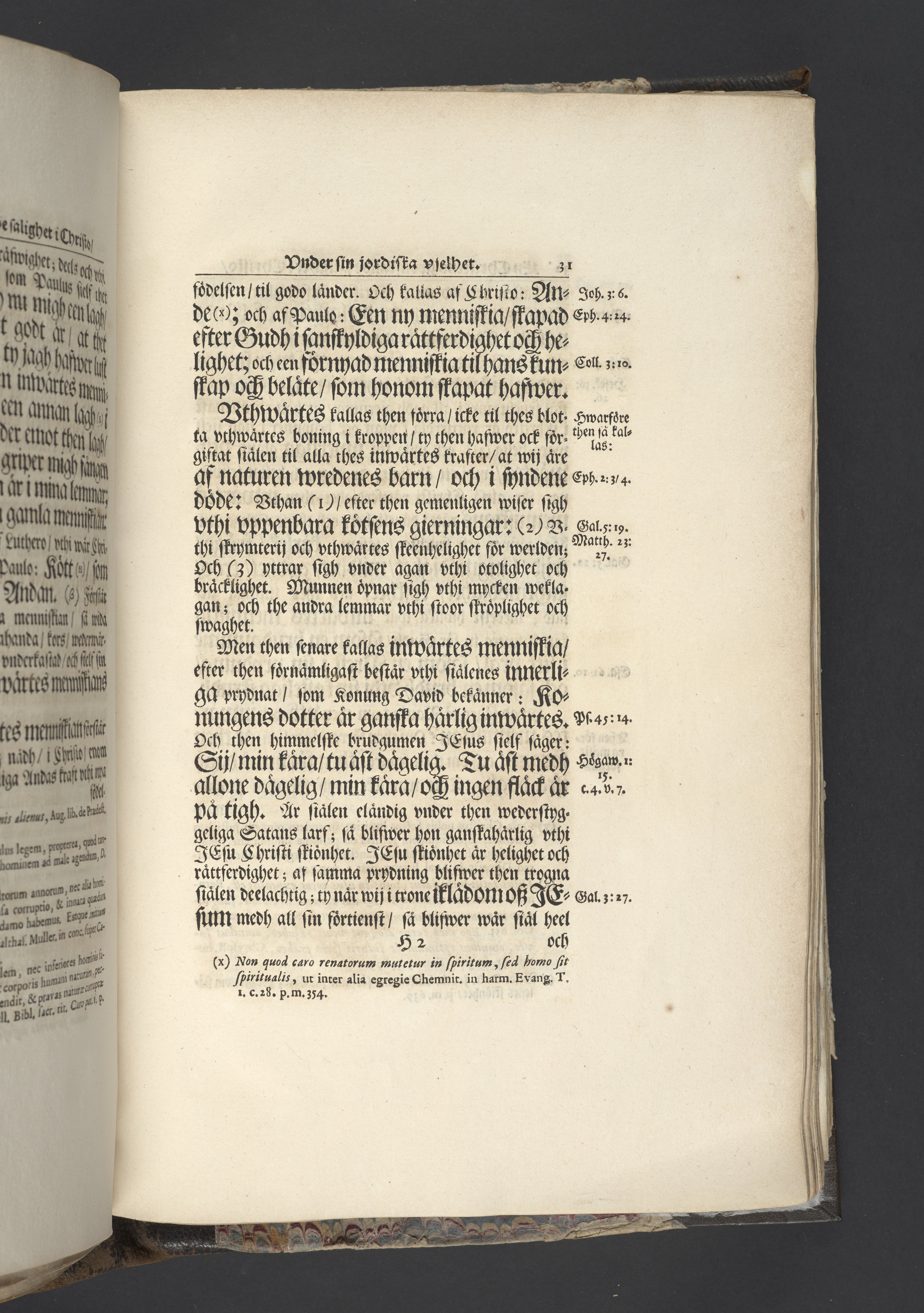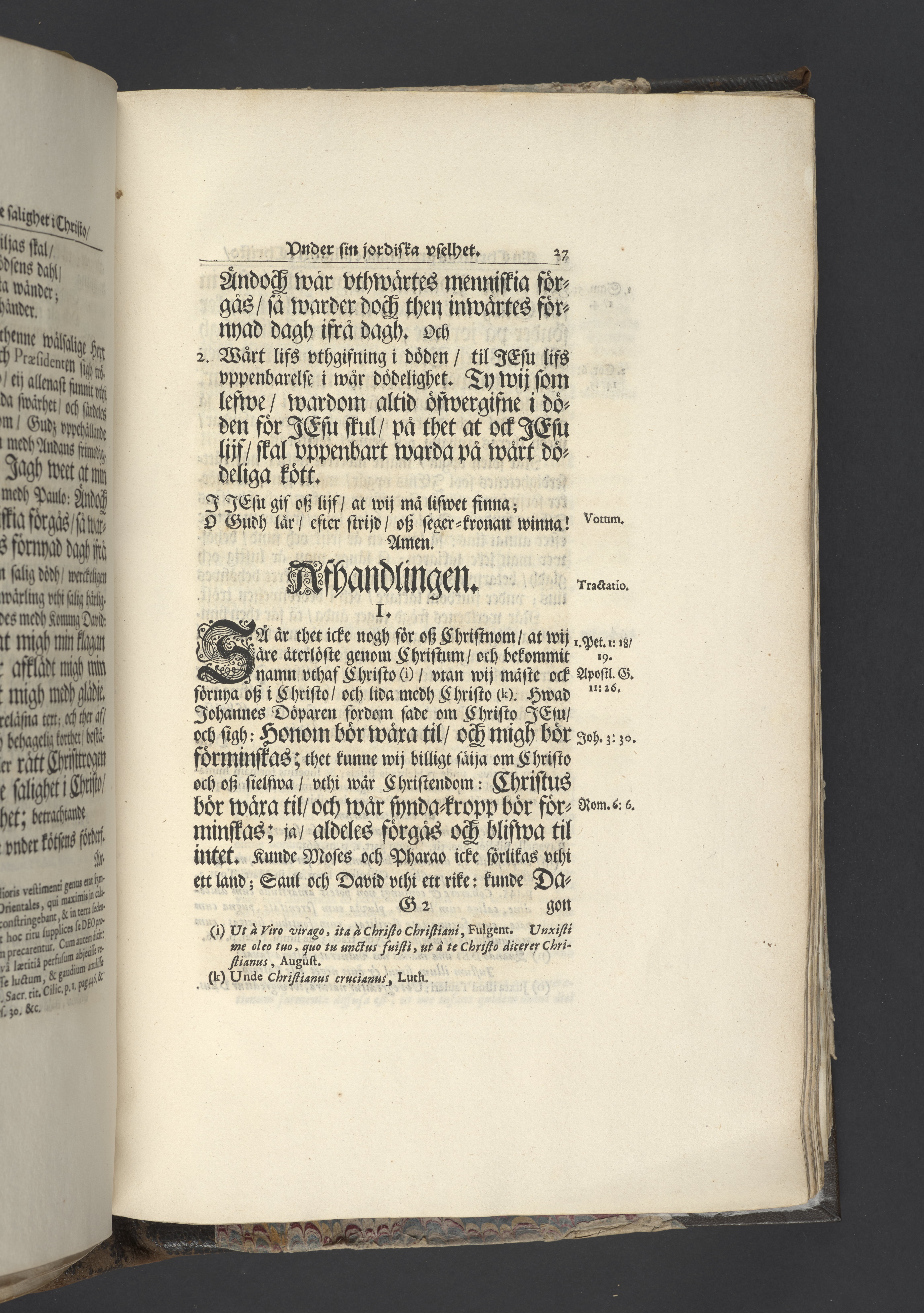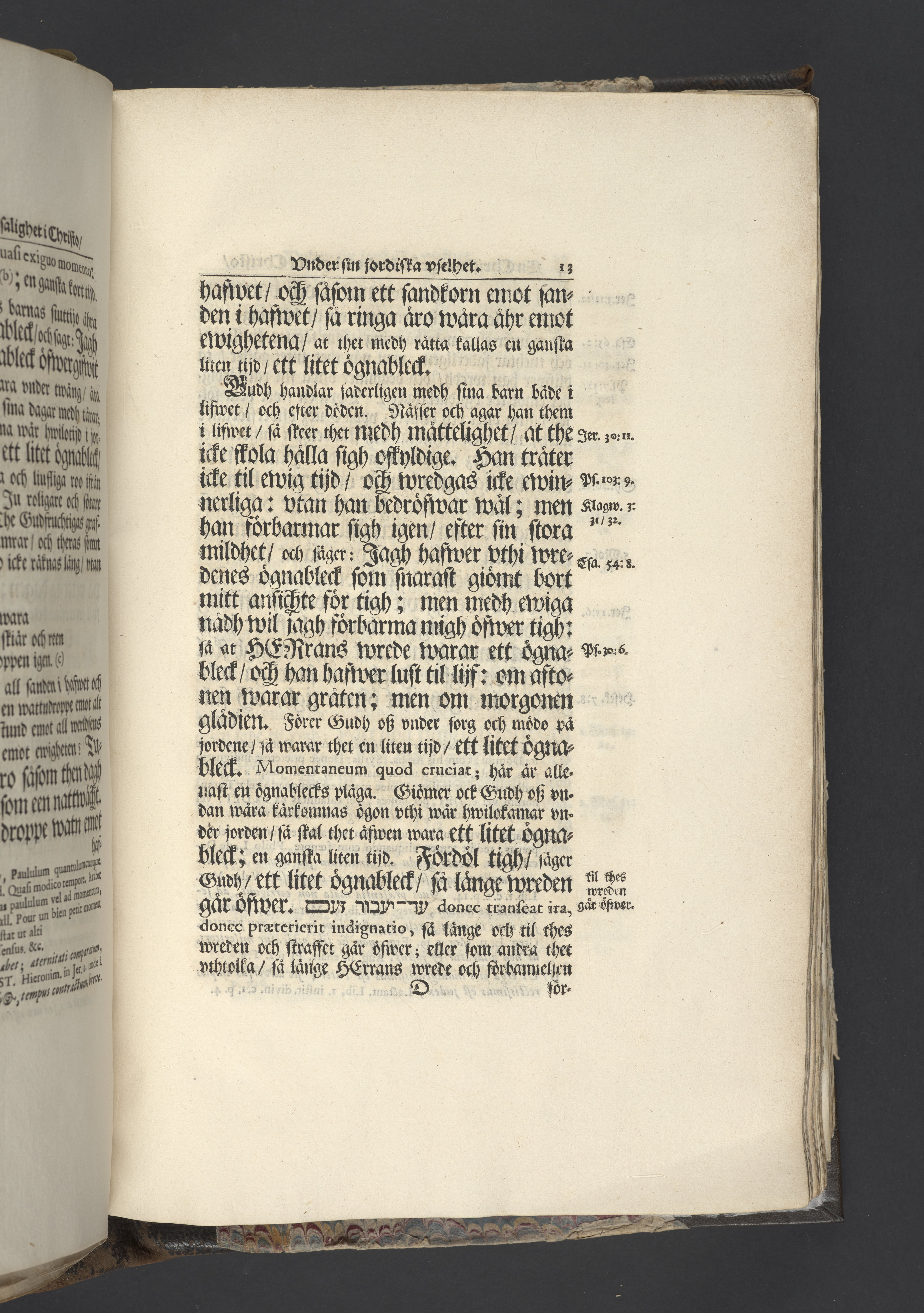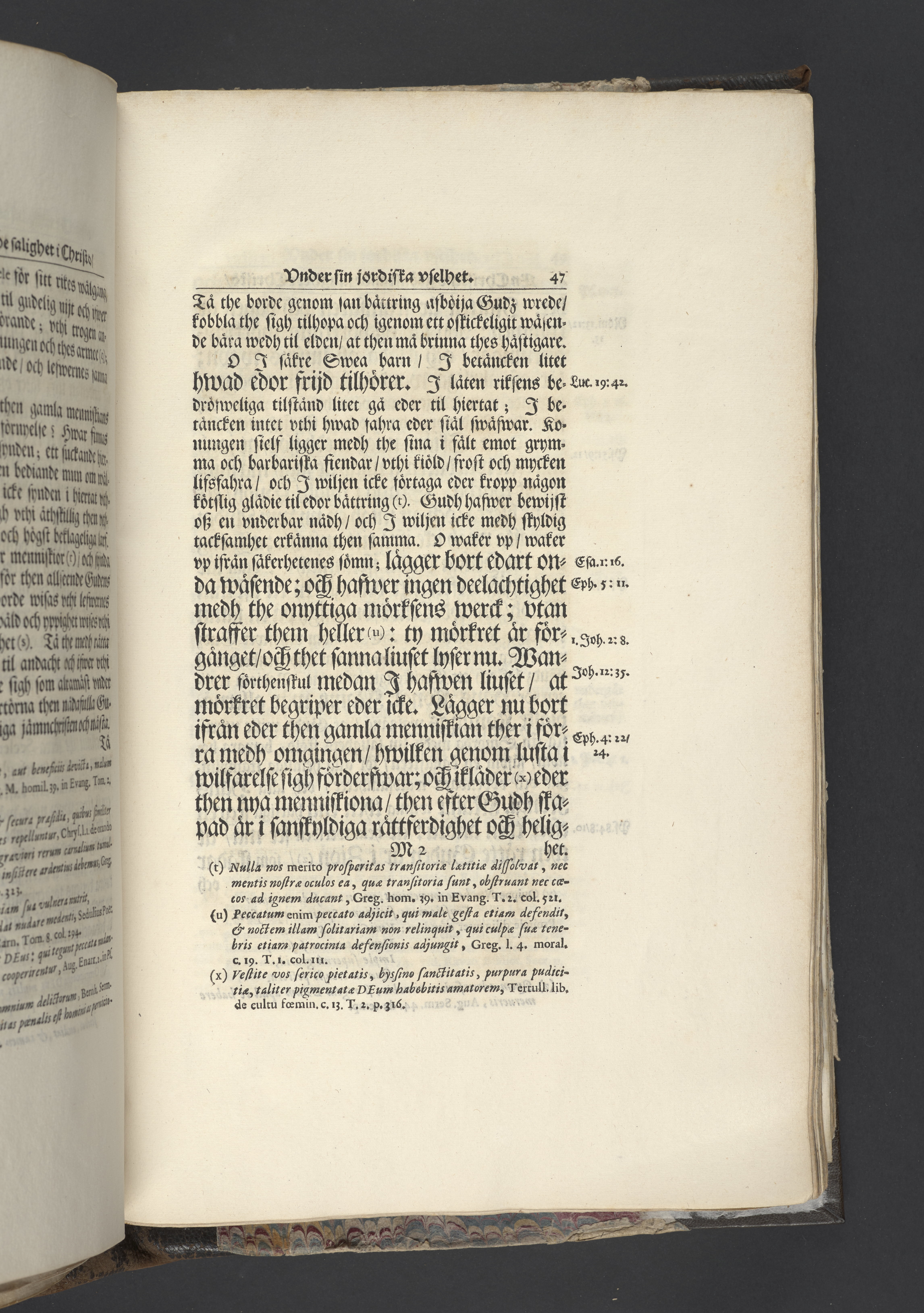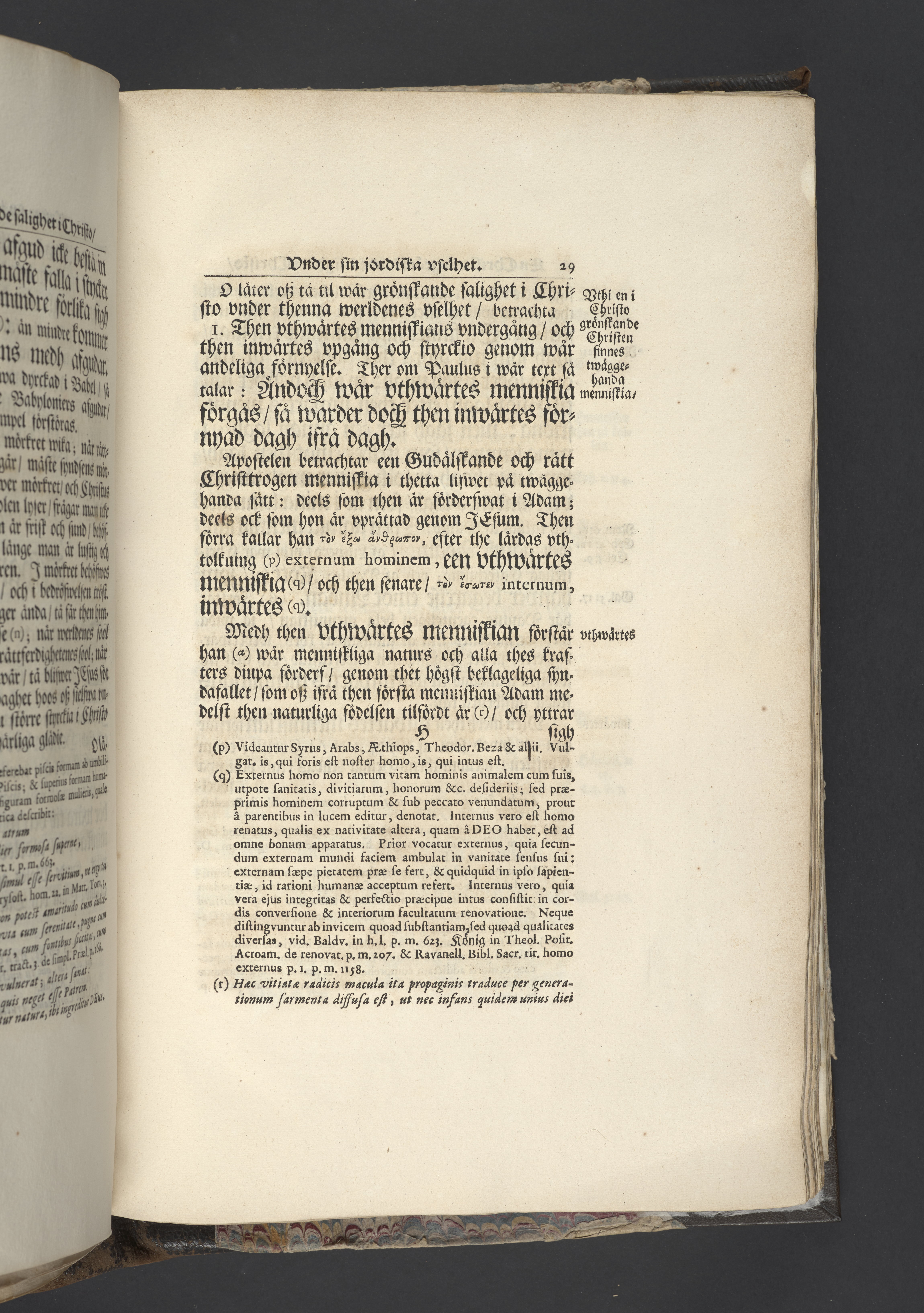 Band m. pärmar av marmorerat papper, rygg och hörn av pergament. Pärmfyllnad: trä.