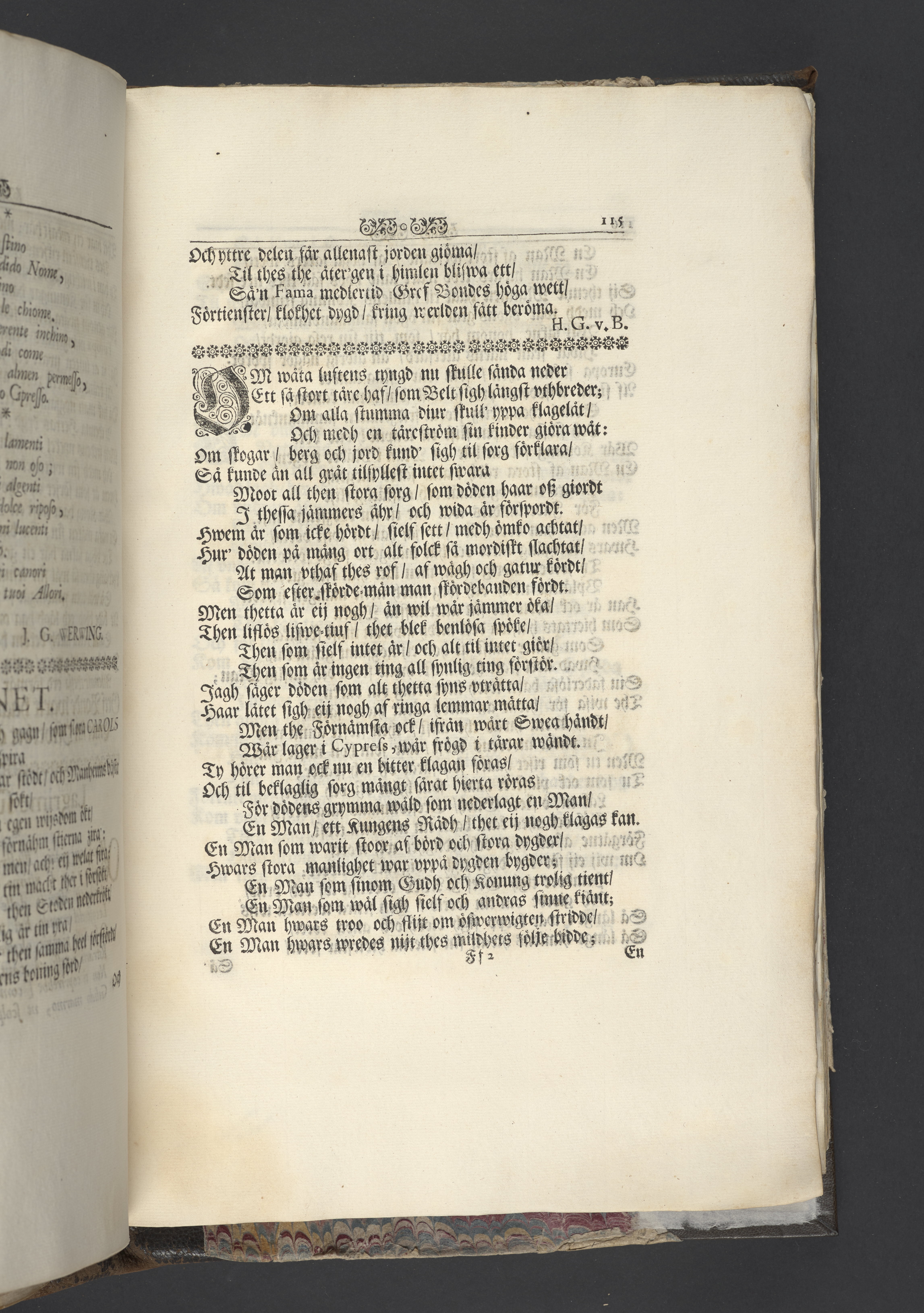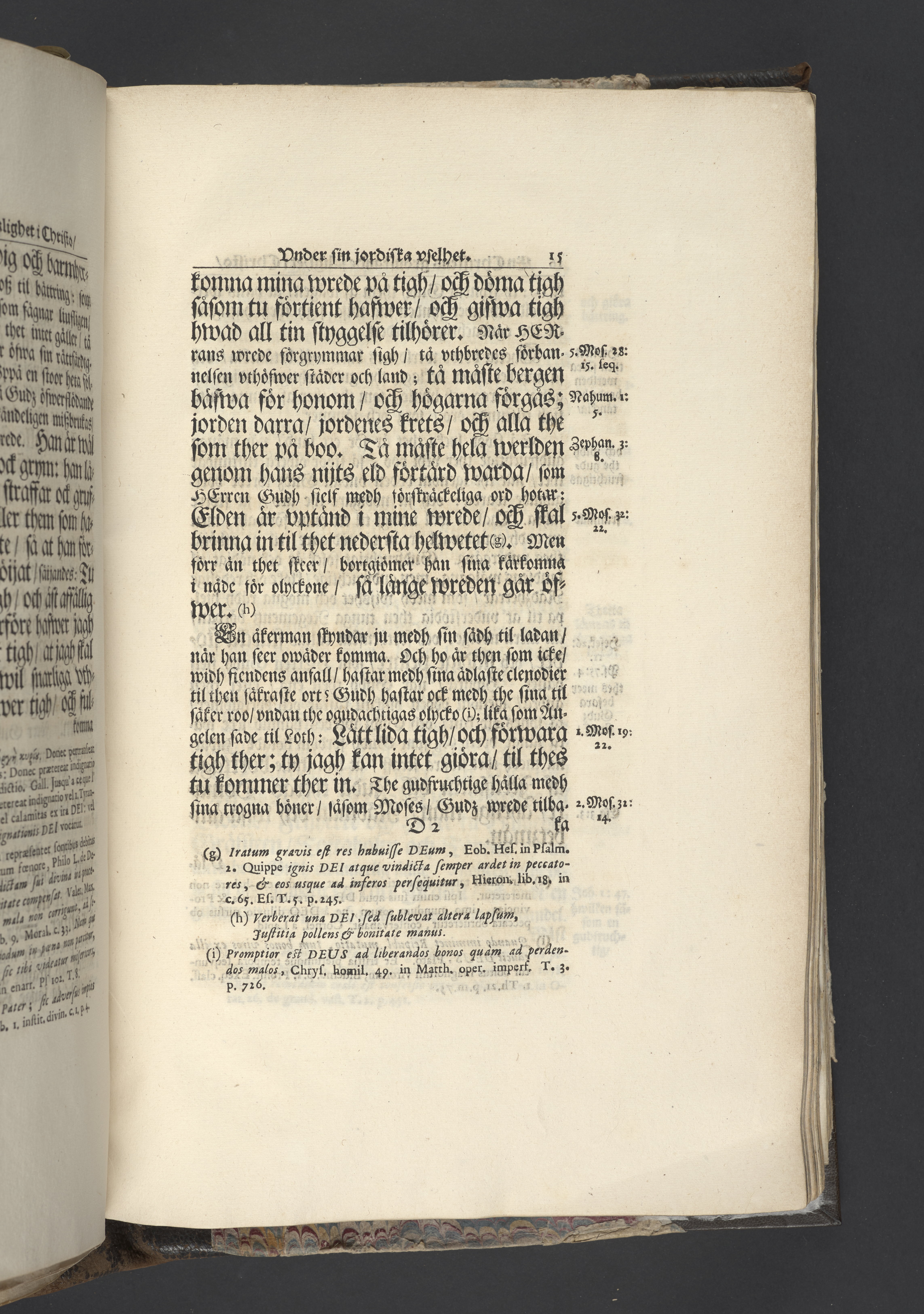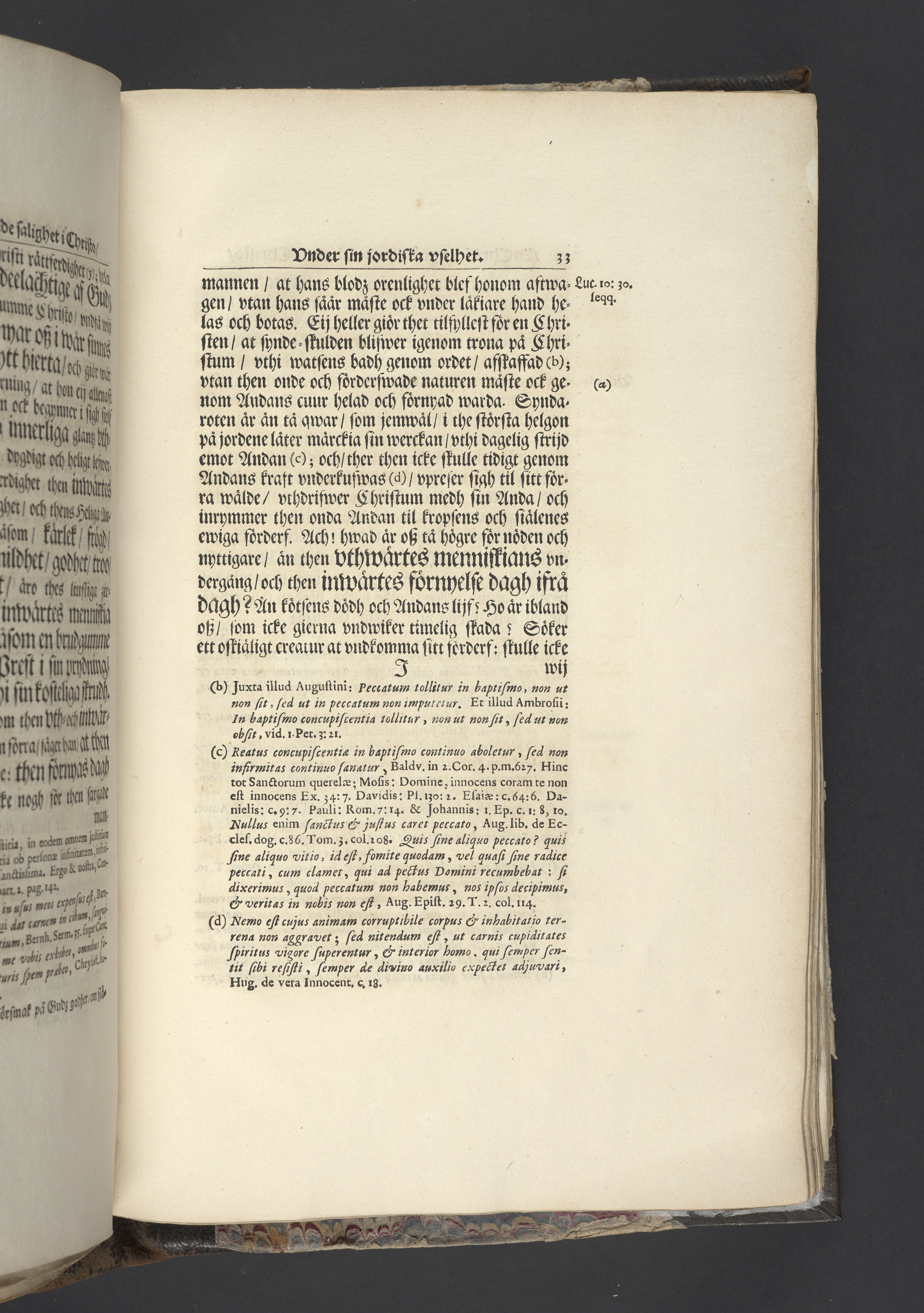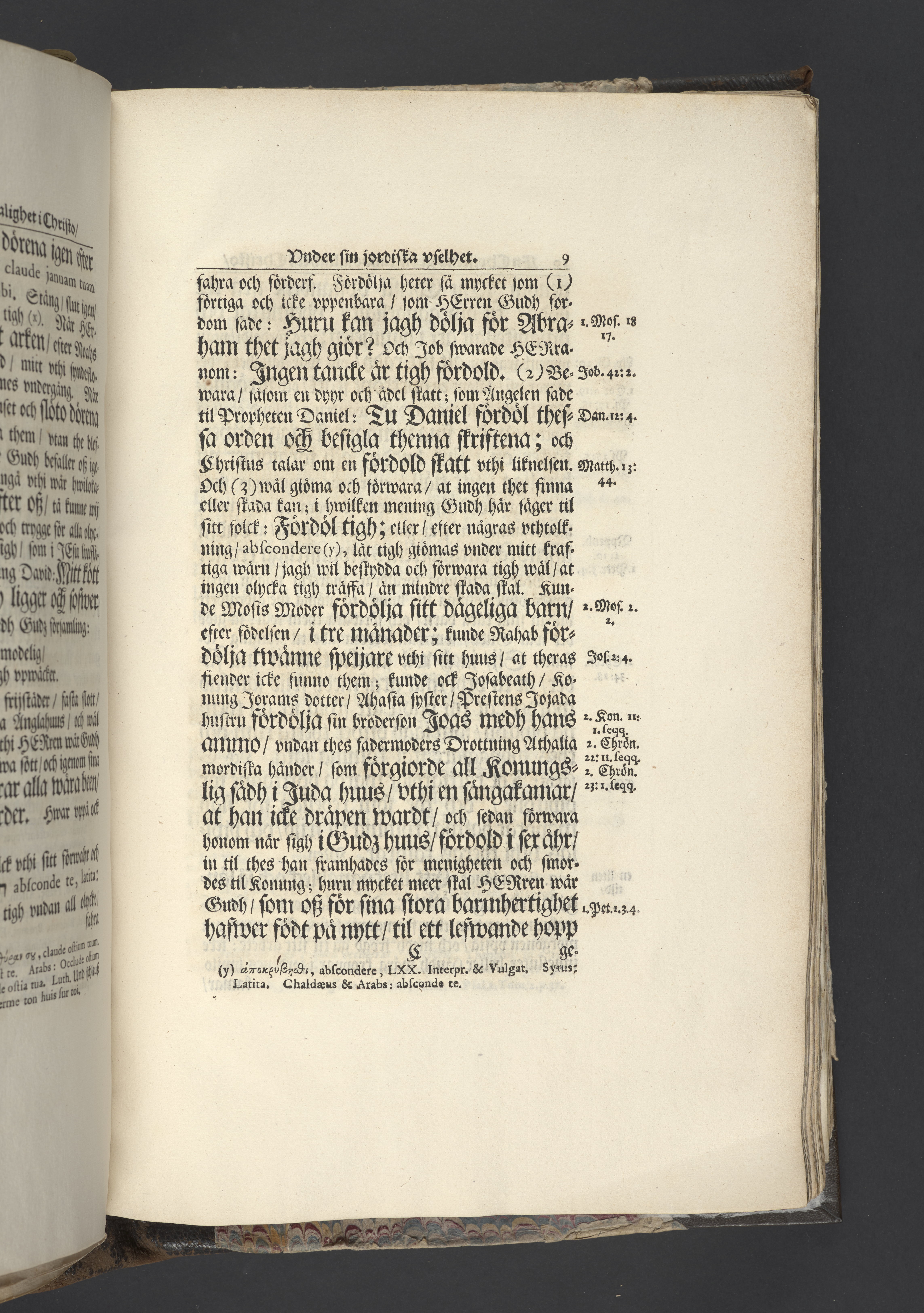 Band m. pärmar av marmorerat papper, rygg och hörn av pergament. Pärmfyllnad: trä.