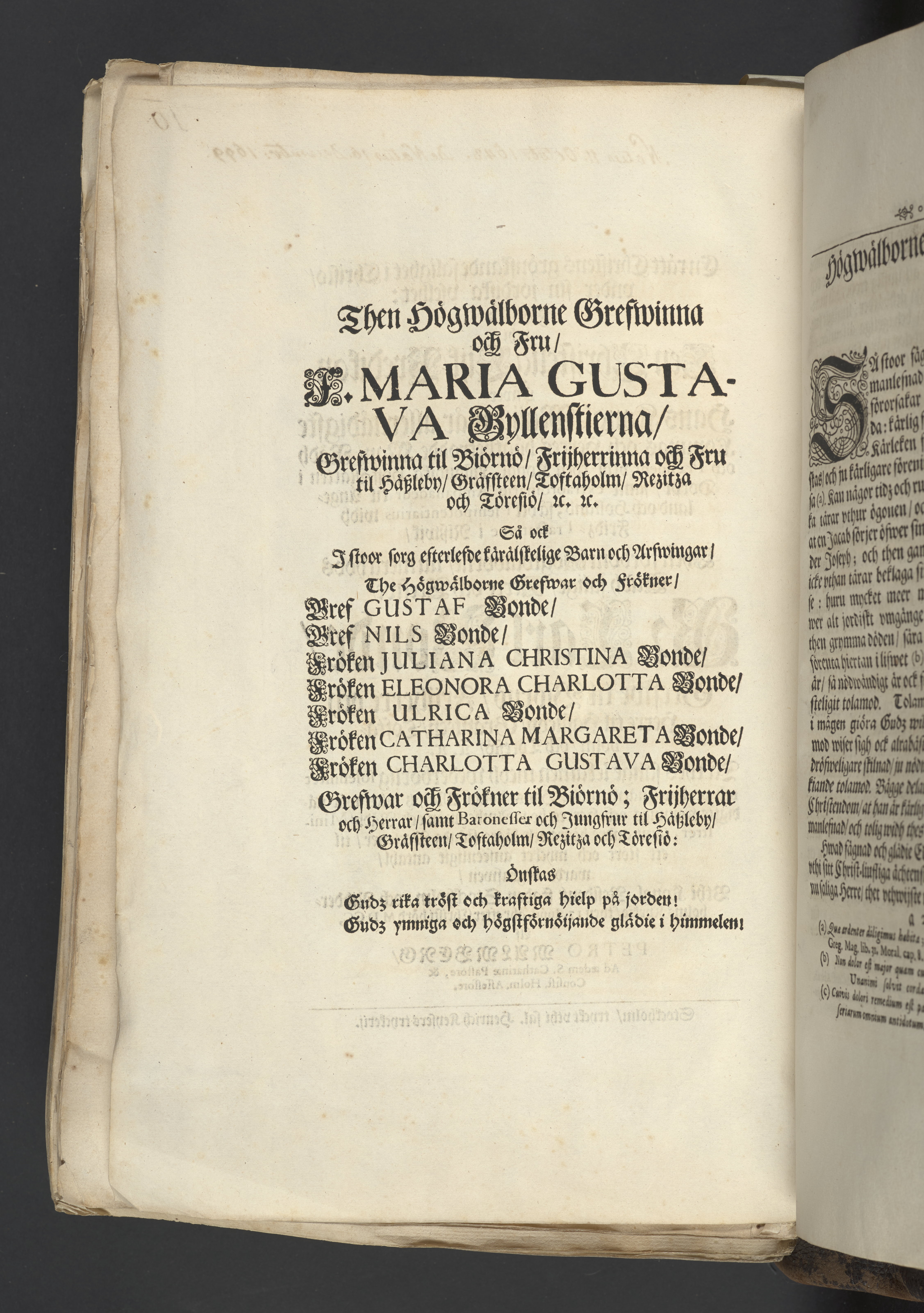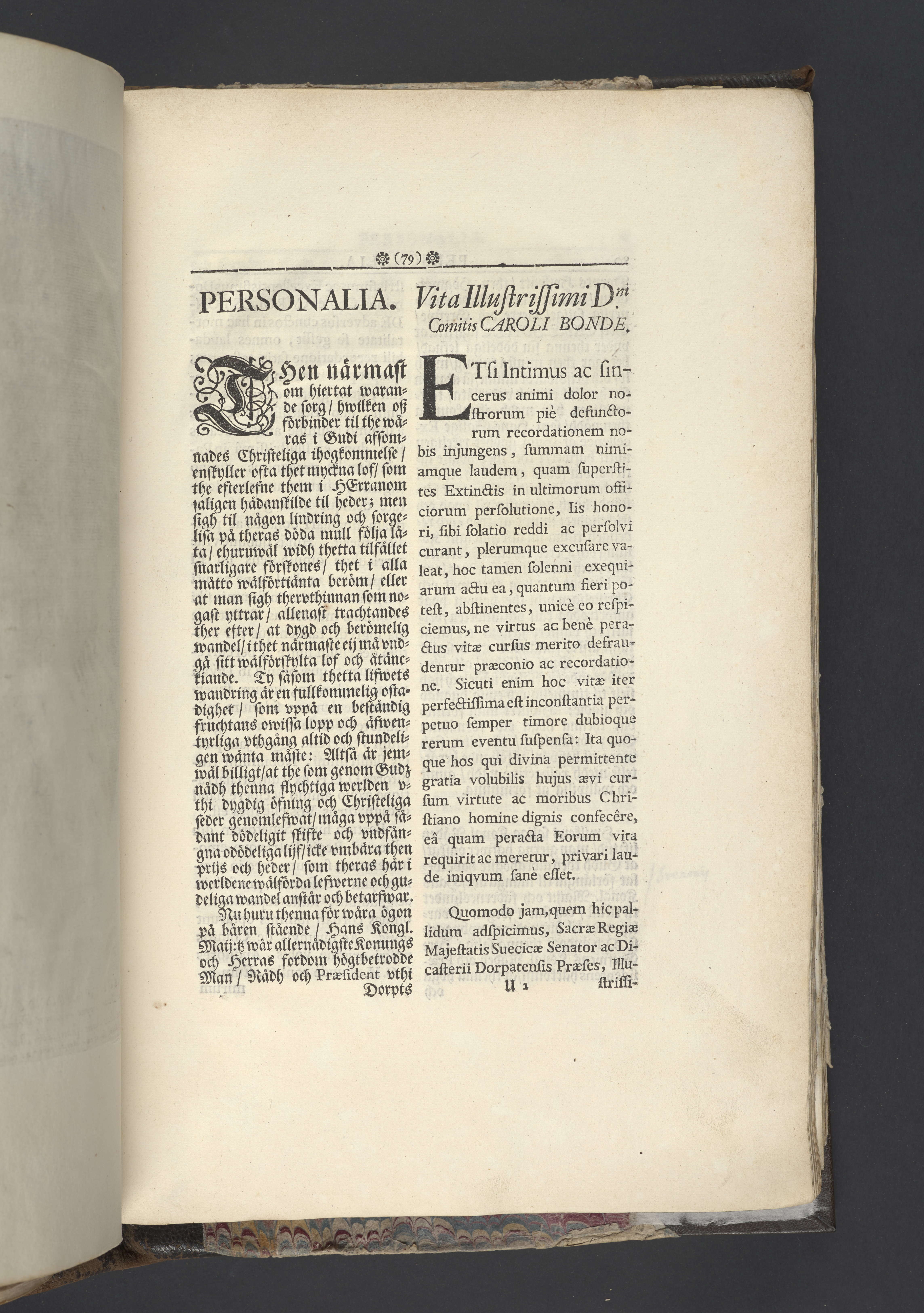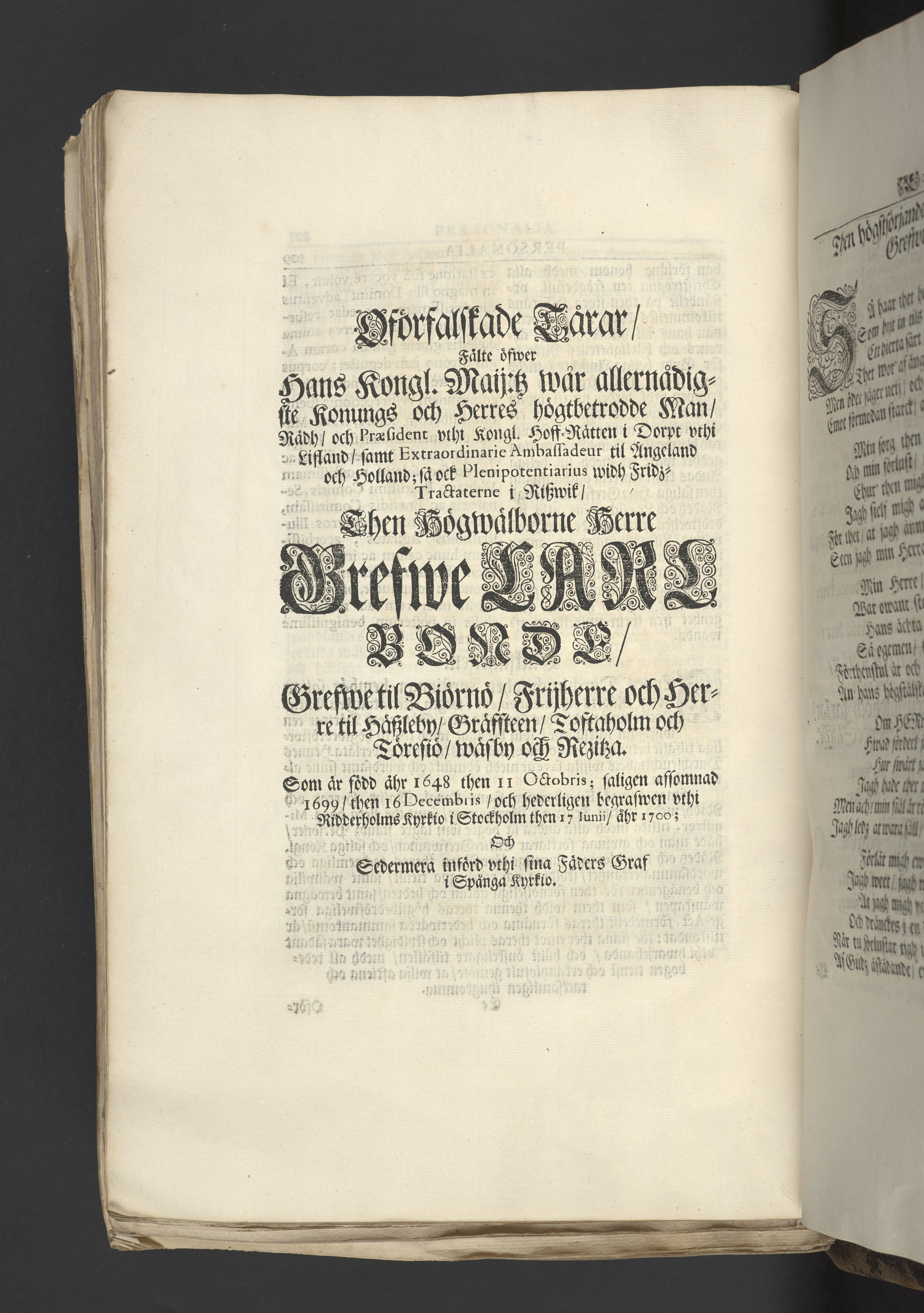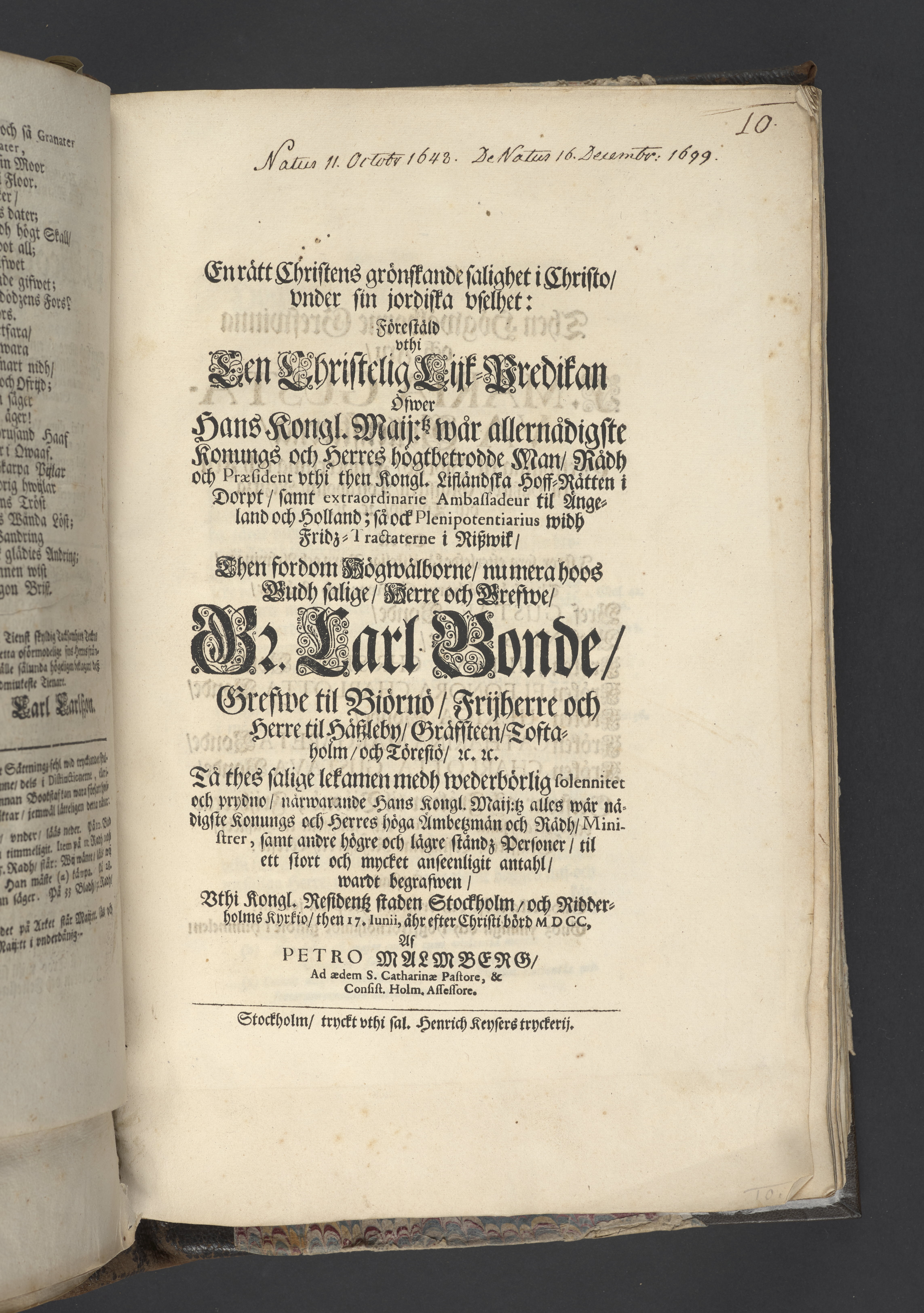 En rätt christens grönskande salighet i Christo, vnder sin jordiska vselhet: förestäld vthi een christelig lijk-predikan öfwer hans kongl. maij:tz wår allernådigste konungs och herres högtbetrodde man, rådh och præsident vthi then kongl. lifländska hoff-rätten i Dorpt, samt extraordinarie ambassadeur til Ängeland och Holland; så ock plenipotentiarius widh fridz-tractaterne i Riszwik ... nu mera hoos Gudh salige, herre och grefwe, gr. Carl Bonde ... tå thes salige lekamen : medh wederbörlig solennitet och prydno, närwarande hans kongl. maij:tz alles wår nådigste konungs och herres höga ämbetzmän och rådh, ministrer, samt andre högre och lägre ståndz personer, til ett stort och mycket anseenligit antahl, wardt begrafwen, vthi kongl. residentz staden Stockholm, och Ridderholms kyrkio, then 17. iunii, åhr efter Christi börd MDCC, af Petro Malmberg ... Stockholm, tryckt vthi sal. Henrich Keysers tryckerij.