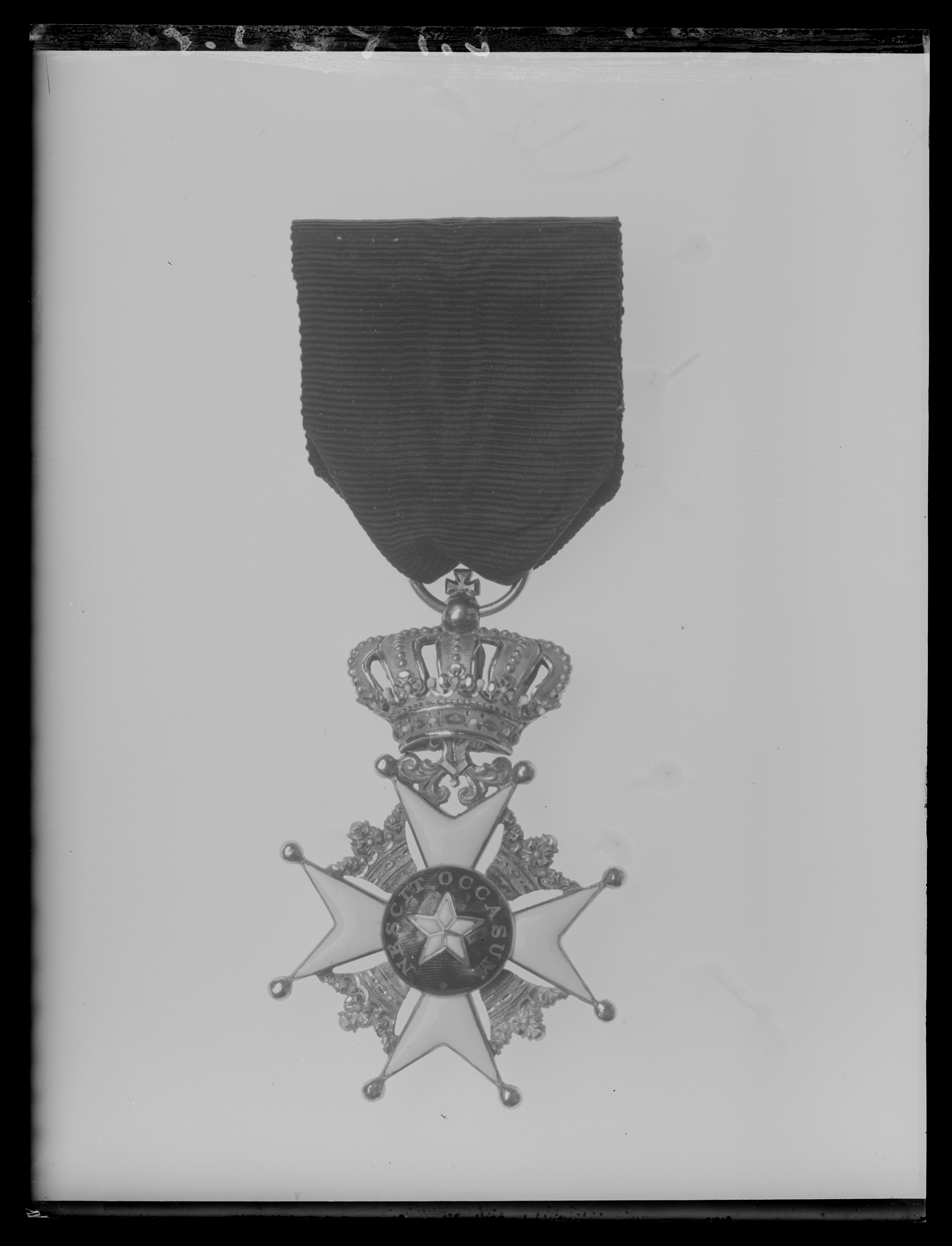 Vitemaljerat malteserkors av guld, kulor på spetsarna, mellan korsarmarna öppna kronor av guld. Blåemaljerad medaljong med guldtext: "NESCIT OCCASUM", vitemaljerad, femuddig stjärna. Mellan den övre korsarmens spetsar genombrutet bladverk av guld, däri fäst med scharner en kunglig krona av guld samt vit, grön och gulorange emalj, igenom äpplet draget en spiralformig bandring.