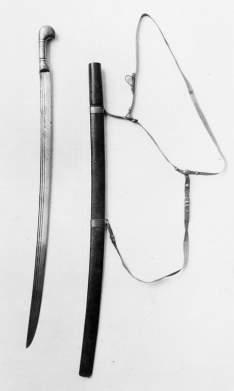 Balja klädd med läder, två mellanband av stål med dekor i form av påslaget guld i akantusslingor. Baljans ytterände tvärt avskuren. Tillbehör: Gehäng av sämskat, grönt läder med knappar och beslag av stål med dekor av påslaget guld. (enl.inv.1867 1 sölja, 1 spänntamp, 5 hylsor, 2 pucklor och 5 knappar). Friherre Ernst Magnus von Willebrands samling nr 73.