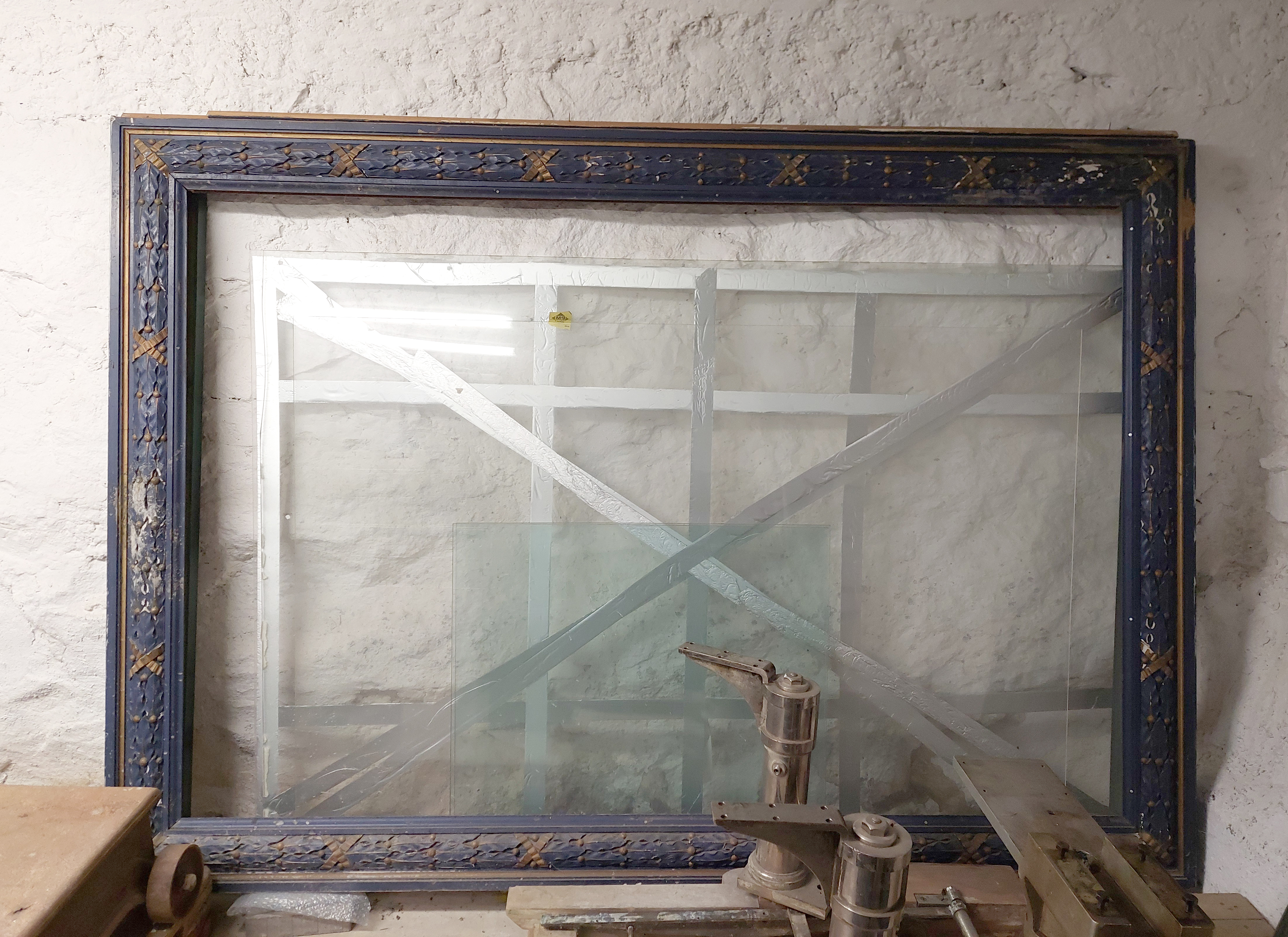 Ram till montern 1897 års industriutställning. Träram i blått och guld, med tillhörande lejon (två stycken, se annat nr).