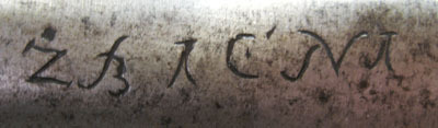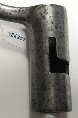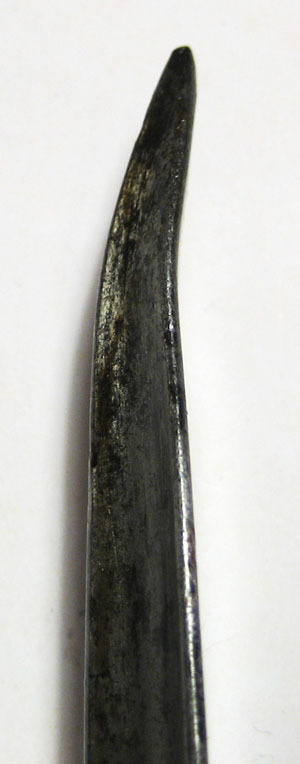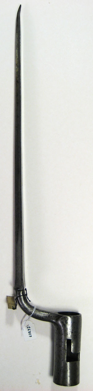 Helt i blankt stål. Rak stukatklinga med triangulärt tvärsnitt, bredare mot basen med tvärt avslut. Klingans sidor skålade med slät bas, bredsidan platt och vänd mot gevärets mynning. Inåtsvängd tånge övergående i cylindrisk hylsa, l 77 mm. På tångens ena sida inslagna bokstäver, möjligen "ZBACNA". I hylsan Z-formigt spår.