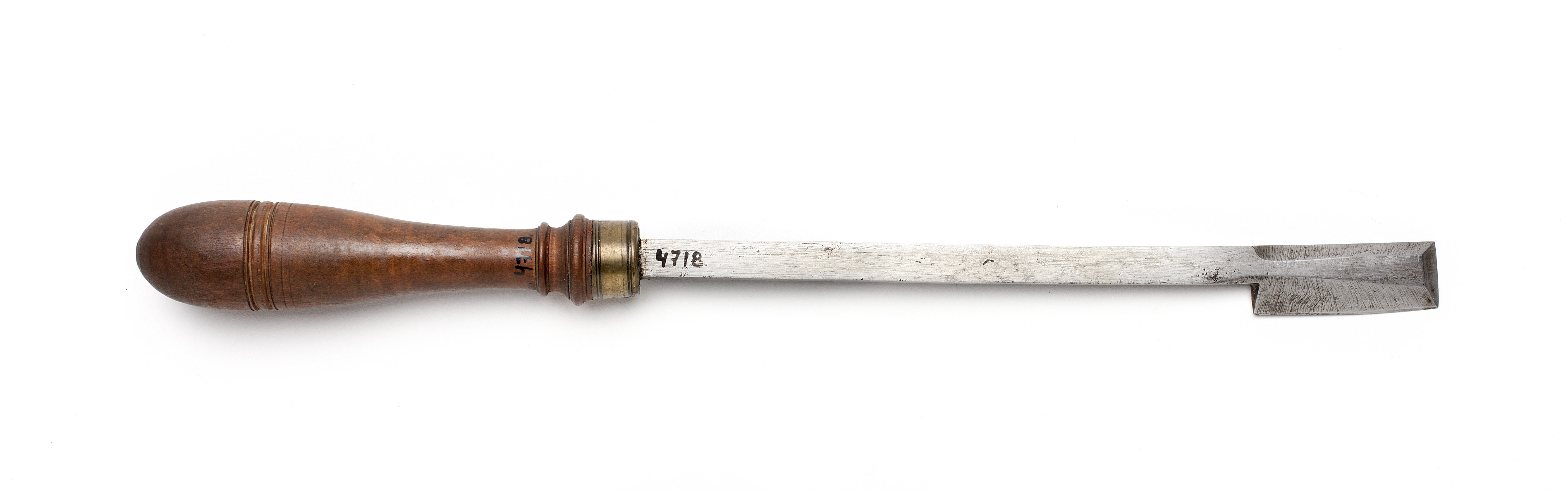 Klinga med rektangulär, i änden trapetsoidisk genomskärning. Rak, främre egg och sidoegg. Svarvat skaft av päronträ med två vulster nedtill. Mässingsring.