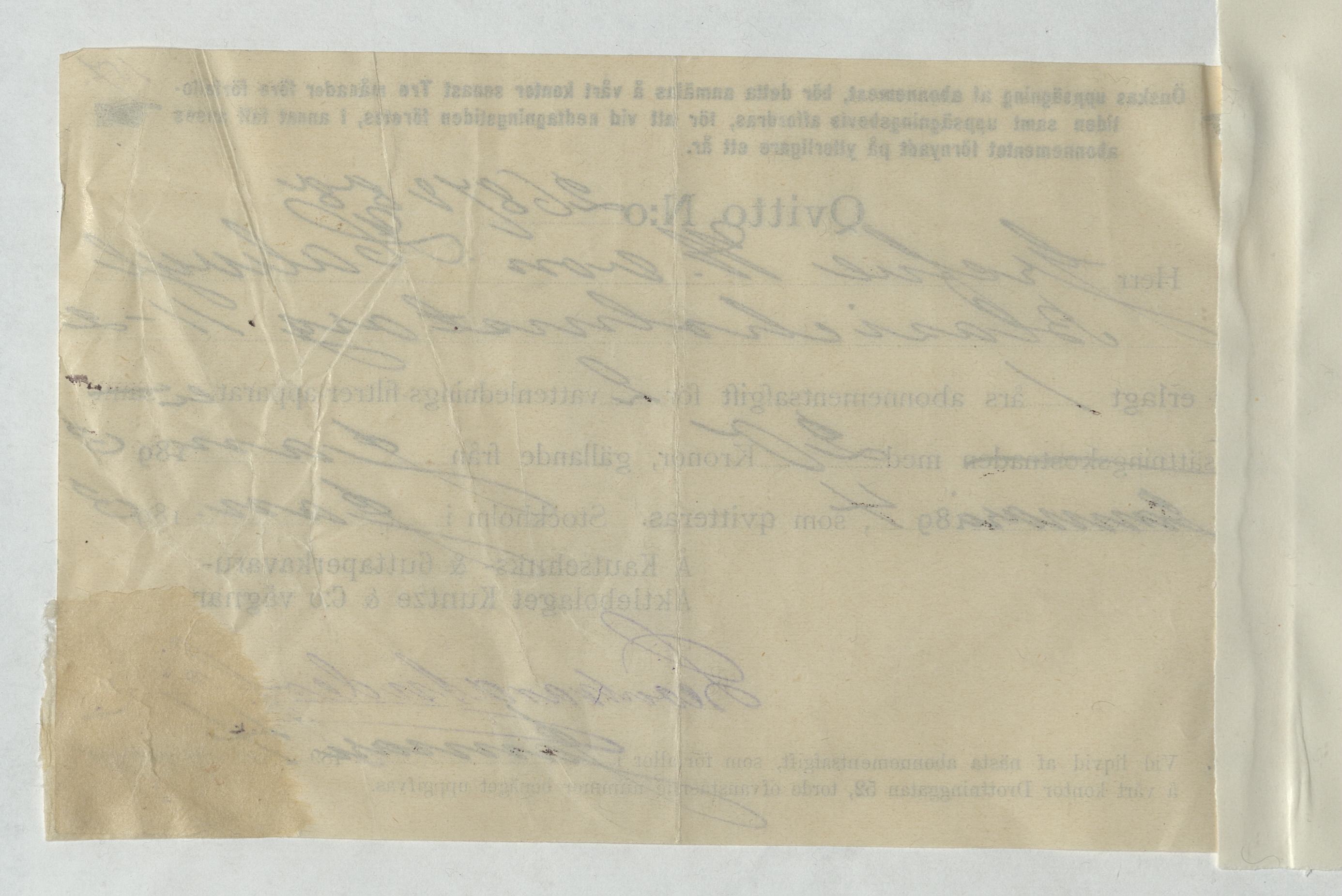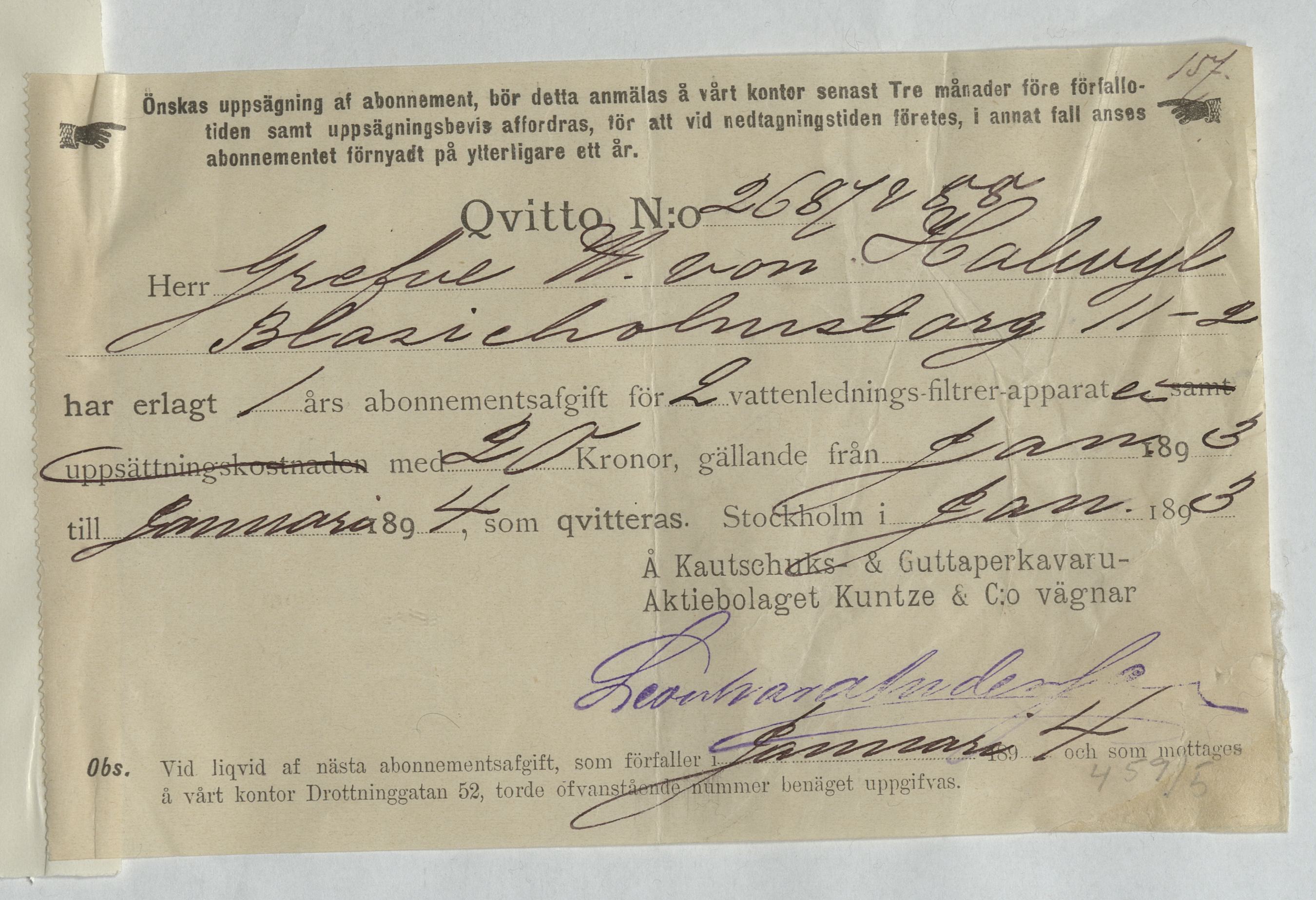 Kvitto från Kautschuks- & Guttaperkavaru-Aktiebolaget Kuntze & Co. Gällande betalning av abonemangsavgift för vattenlednings-filter-apparat.