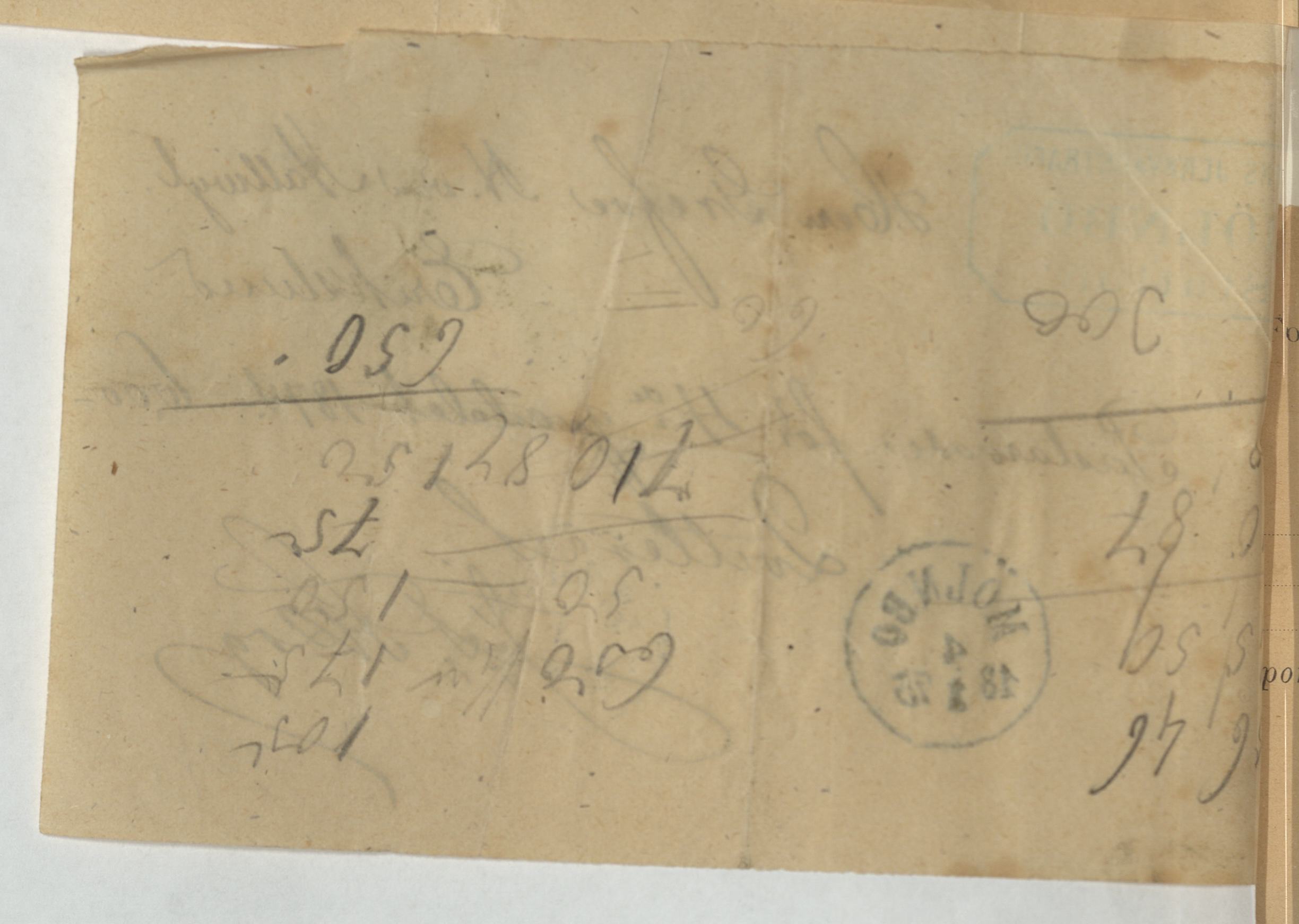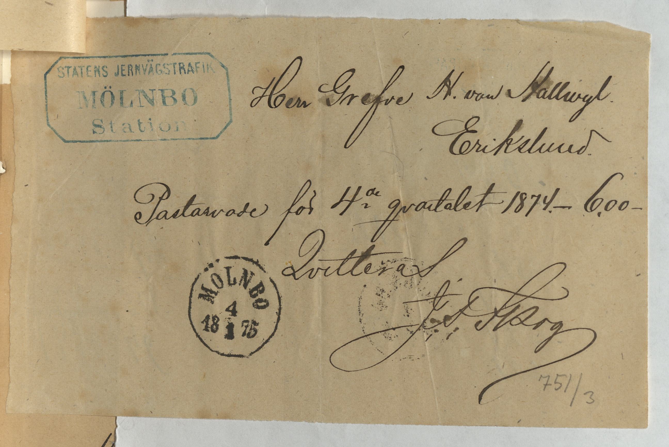 Kvitto från J. F. Skog. Postföreståndare, Mölnbo 1875.