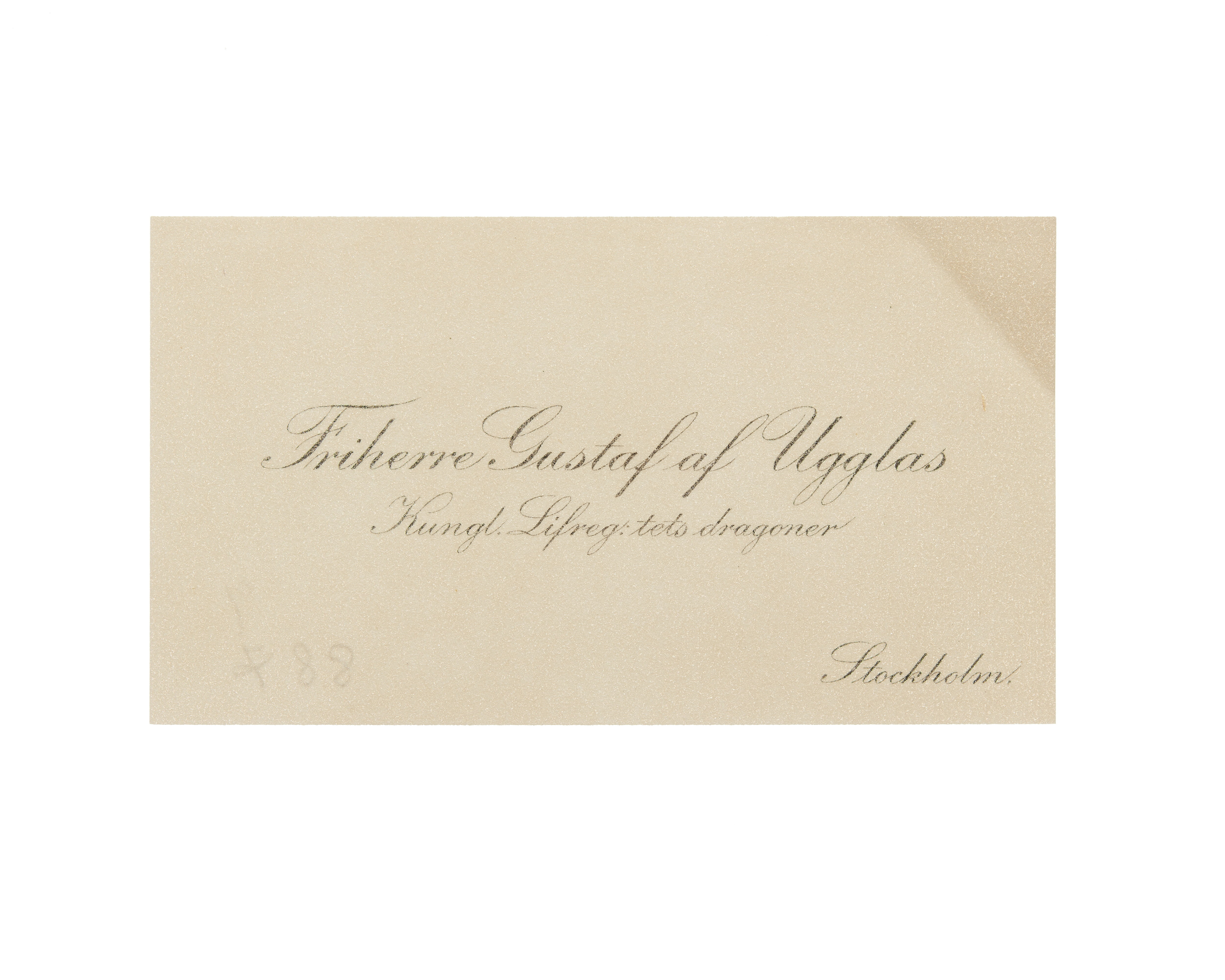 Två visitkort från Friherre Gustaf af Ugglas, Kungl. livreg:tets dragoner. Båda vikt i övre högra hörnet. Adress (nedre högra hörnet) Stockholm.