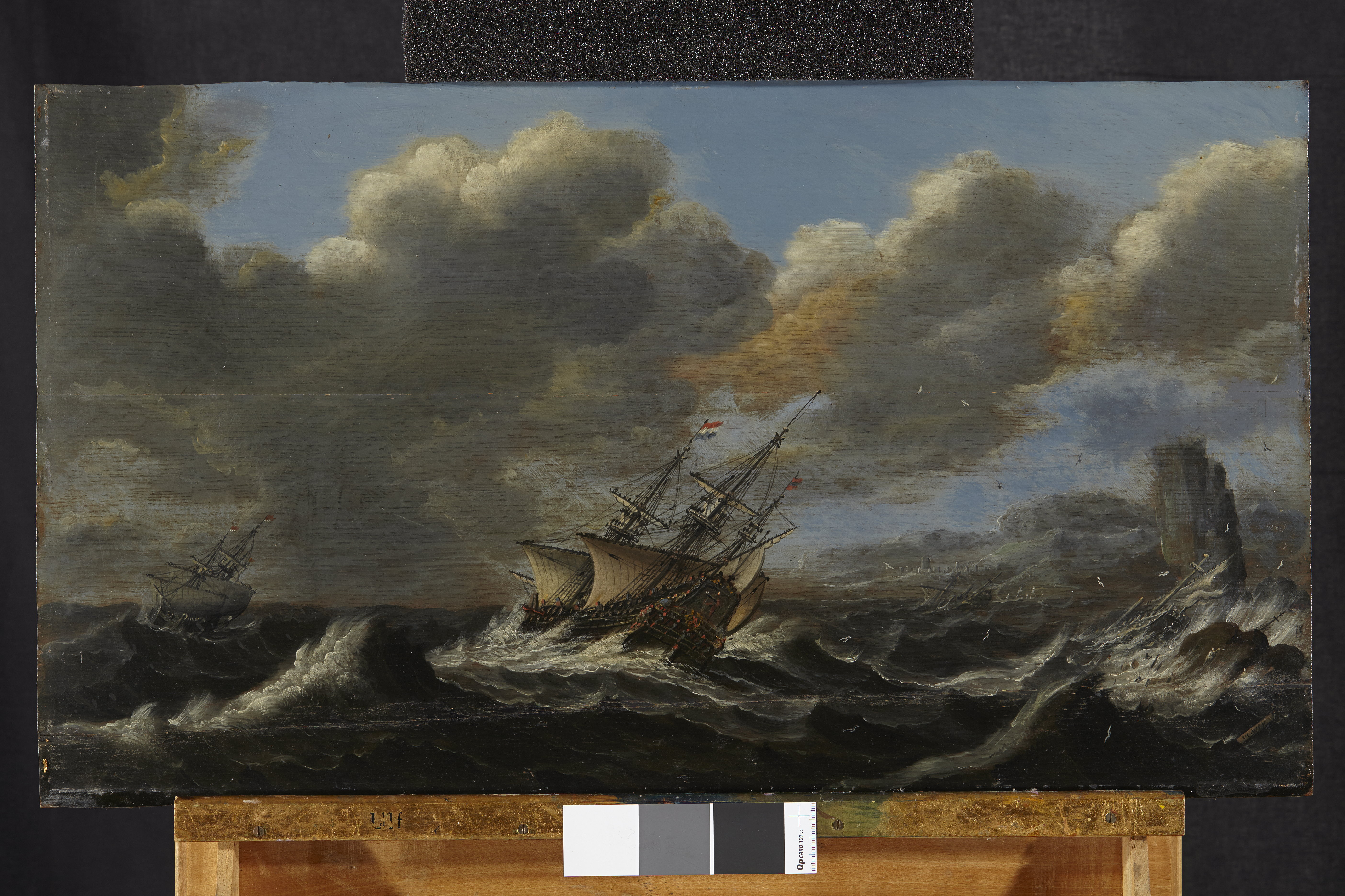 Två holländska krigsskepp seglar i storm utanför en klippig kust. I bränningarna rester av två förlista skepp. Signatur C.C. WOU på bräda i vattnet i hörnet ned till höger. På baksidan skrivet med blyerts : " Rengiordt Den 18 Augusti 1790 af C S B ". Olja på pannå (ek). Förgylld fururam med rundstav , ramlist 40 mm.