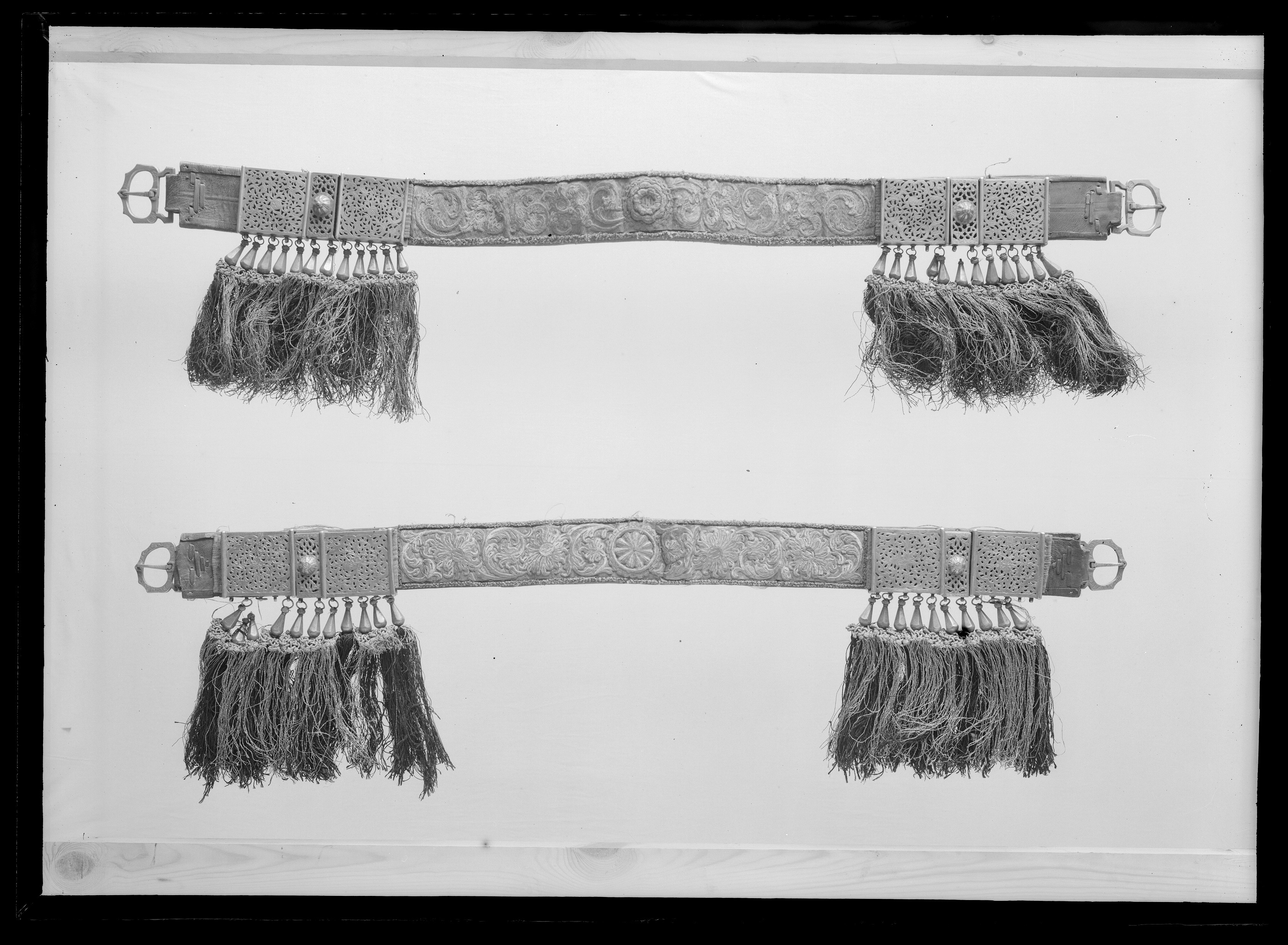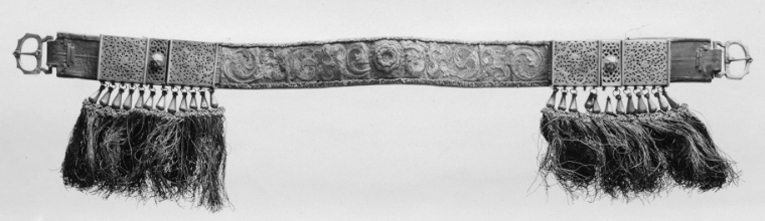 Förbygel af rödt läder med rikt guldbroderi, 6 utgraerade brockor af silfver med 24 silfverklappar, frans af svart silke och guld, samt 2 söljor af silfver.