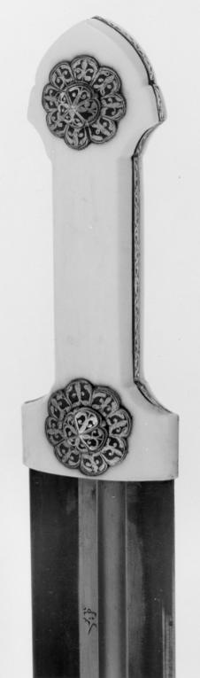 Fäste av elfenben delat i två plattor som är snidade med insvängt mittparti och bladformad ytterända. Elfenbensplattorna hålles samman med ett stålband med dekor av påslaget guld i form av bladslingor. På fästets utsida finns två beslag i form av en rund bricka av stål med vågig kant, i centrum en toppig rund nit med fasade sidor. Beslagen har dekor i form av påslagna blad av guld. Tvåeggad blånerad klinga av stål med jämnbreda mötande skär. Vid sidan av ryggåsen finns en skålad rand längs hela klingan. På klingans utsida finns ett smedsmärke.
