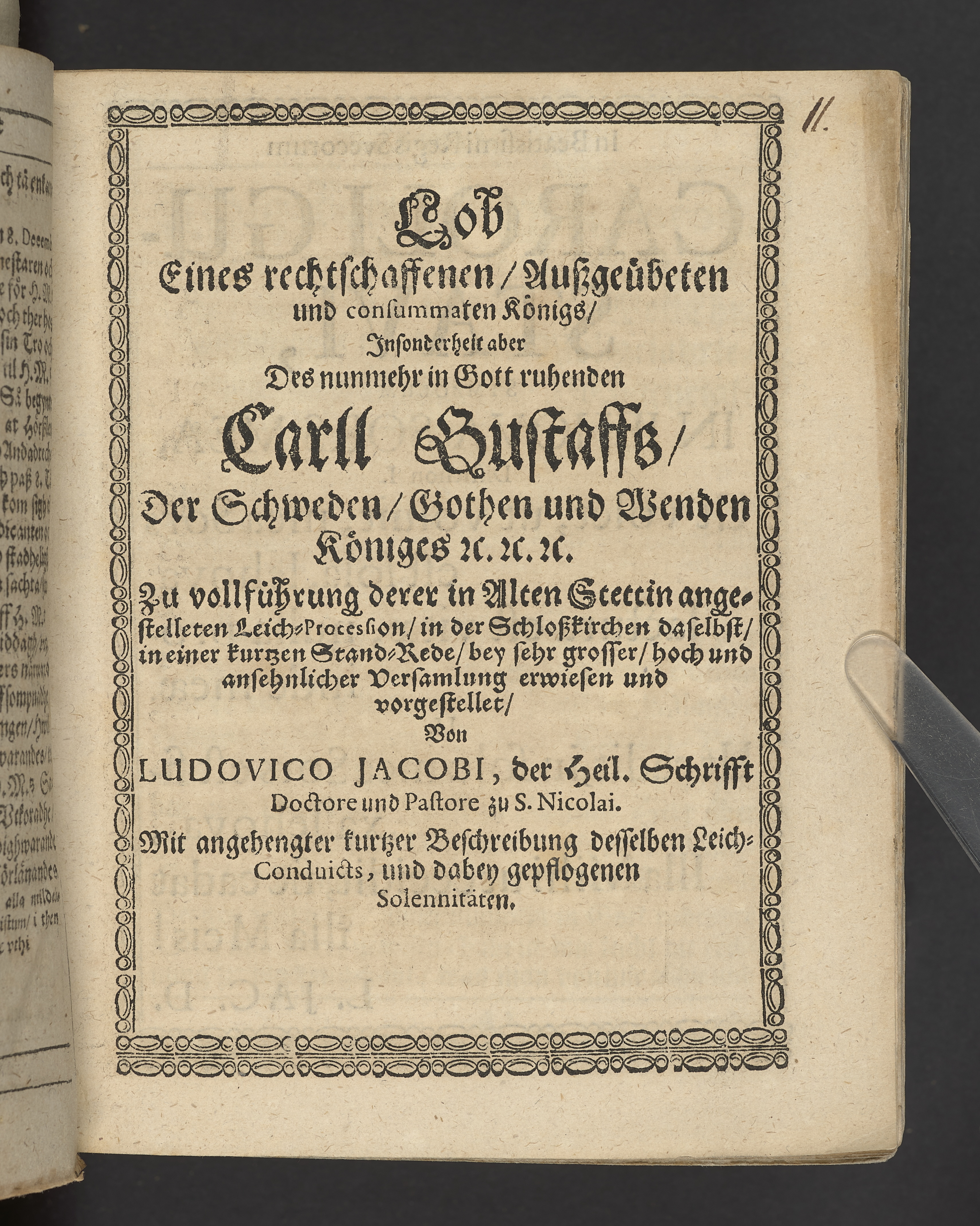 Lob eines rechtschaffenen, auszgeübeten und consummaten Königs, insonderheit aber des nunmehr in Gott ruhenden Carll Gustaffs der Schweden, Gothen und Wenden Königes ... zu vollführung derer in Alten Stettin angestellten Leich-Procession, in der Schloszkirche daselbst in einer Stand-Rede ... vorgestellet, von Ludovico Jacobi ... Mit kurtzer Beschreibung desselben Leich Conduicts, und dabey gepflogenen Solennitäten.