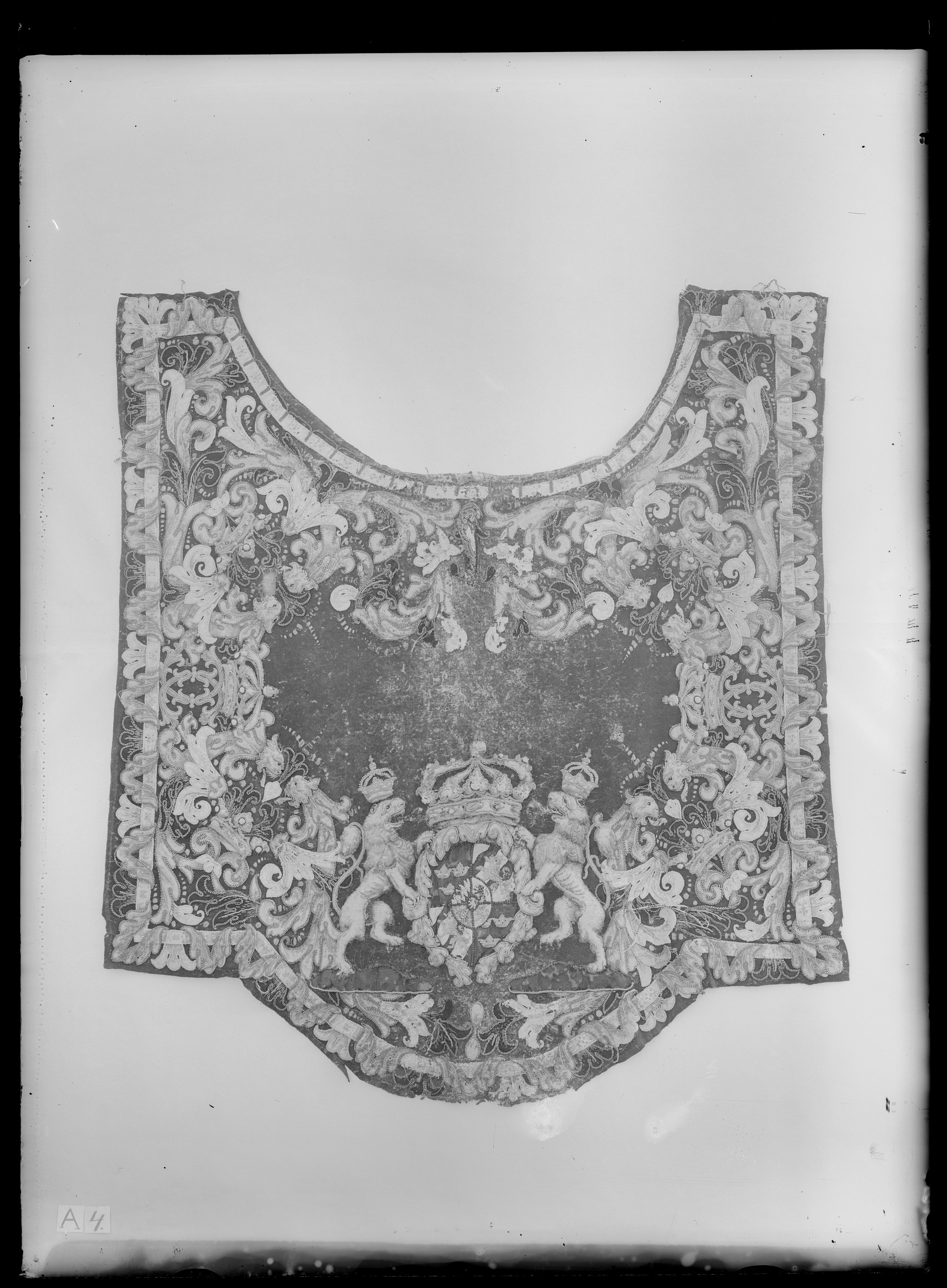 Täcke av blått kläde med applikationer av kläde i flera färger, huvudsakligen gult och vitt. Samma typ som nr 4061 men skiljer sig från detta i följande avseenden: Bredd framtill: 1500 mm. Riksvapnets mått 500x620 mm. De sköldhållande lejonen krönta med slutna kronor och står på små grästuvor markerade med yttäckande ullgarnsbroderier i grönt, gult, brunt och vitt. De gula lejonen i vapenskölden är sydda av gult ullgarn i schattersöm. Vänstra framstycket har haft två bruna läderremmar, fästade 50 mm innanför framkanten. Av dessa återstår den övre, som är 260x20 mm. Den nedre remmen är avsliten. Högra framstycket har haft två bruna lädertränsar, placerade på motsvarande plats. Den övre tränsen är 35x28 mm och har ett spänne av vitmetall 22x28 mm. Den nedre tränsen är trasig. På baksidan finns fem tränsar, från sen tid, liksom på nr 4061. I den ena sitter en pappersetikett med inskription "K.Lif-Rustkammaren // och Klädkammaren // No 821". Siffrorna är skrivna med brunt bläck. Textens övriga del är tryckt. 90 mm nedanför täckets inskärning står "G.10" med svart tusch. Två bruna läderhällor 240x35 mm sitter 500 mm från respektive långsida och ungefär i täckets mittparti. En svansrem, 450x8 mm av brunt läder, sitter 480 mm ovanför täckets bakre kant. Nere i ena hörnet sitter en papperslapp 62x40 mm med inskription i brunt bläck: "No 97 // 30 st hästetecken".