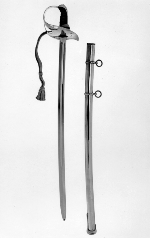 Fäste av förgylld mässing, anslutande till m: 1864. På utsidan av den bakåt utdragna parerplåten inslaget " CA & AD Ek ". Kavel klädd med svärtat skinn, lindad med två parter förgylld, tvinnad mässingstråd i sju räfflor. Stötlapp av rött kläde. Klinga böjd, eneggad av förnicklad stål. Vid klingbasen på insidan inslaget: " G. E. SVALLING & CO, MÖLNTORP ". Buren ca 1890 av dåvarande prins Gustav Adolf.