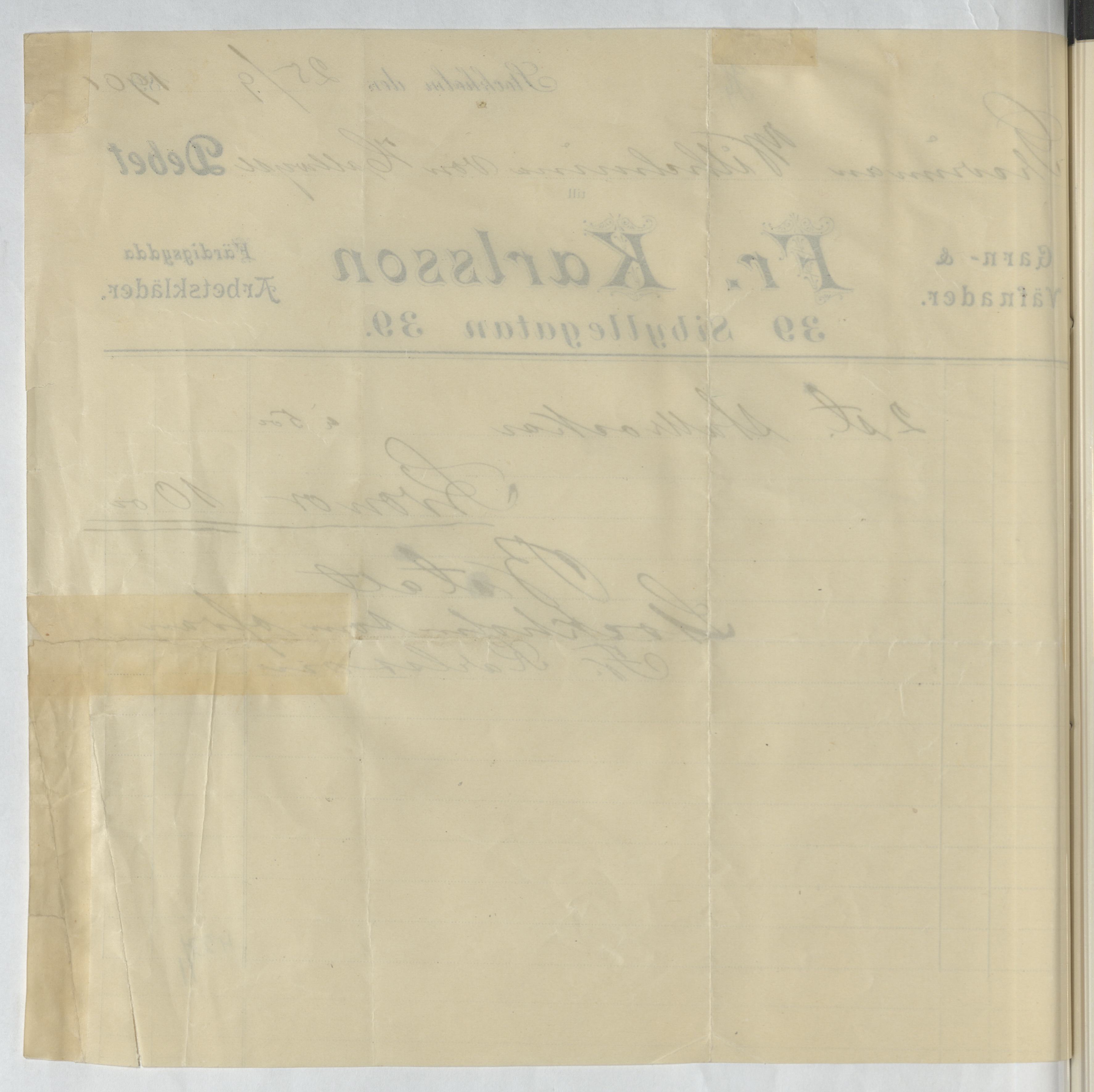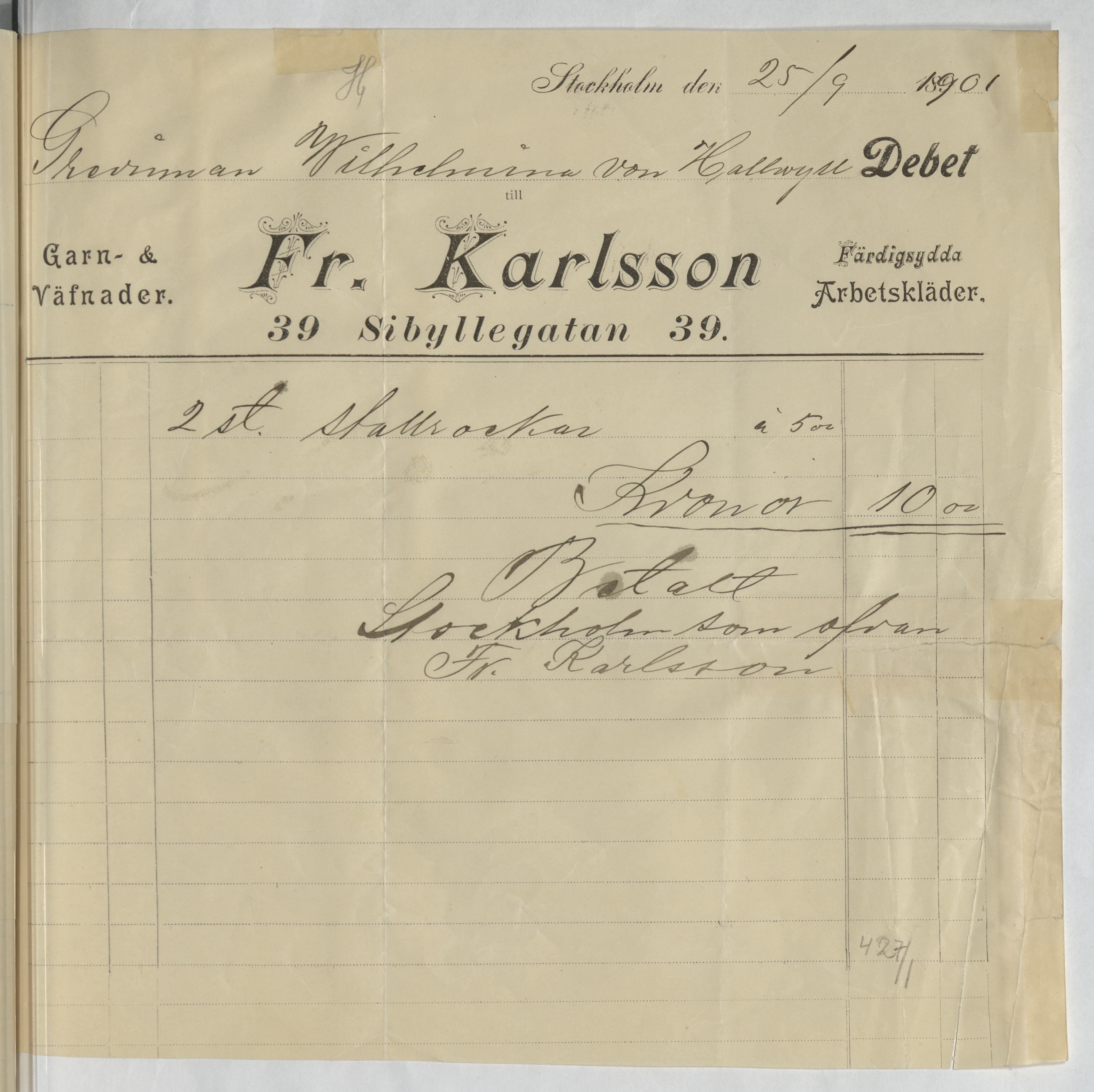 Kvitto från Fr. Karlsson. Stockholm, 1901.
