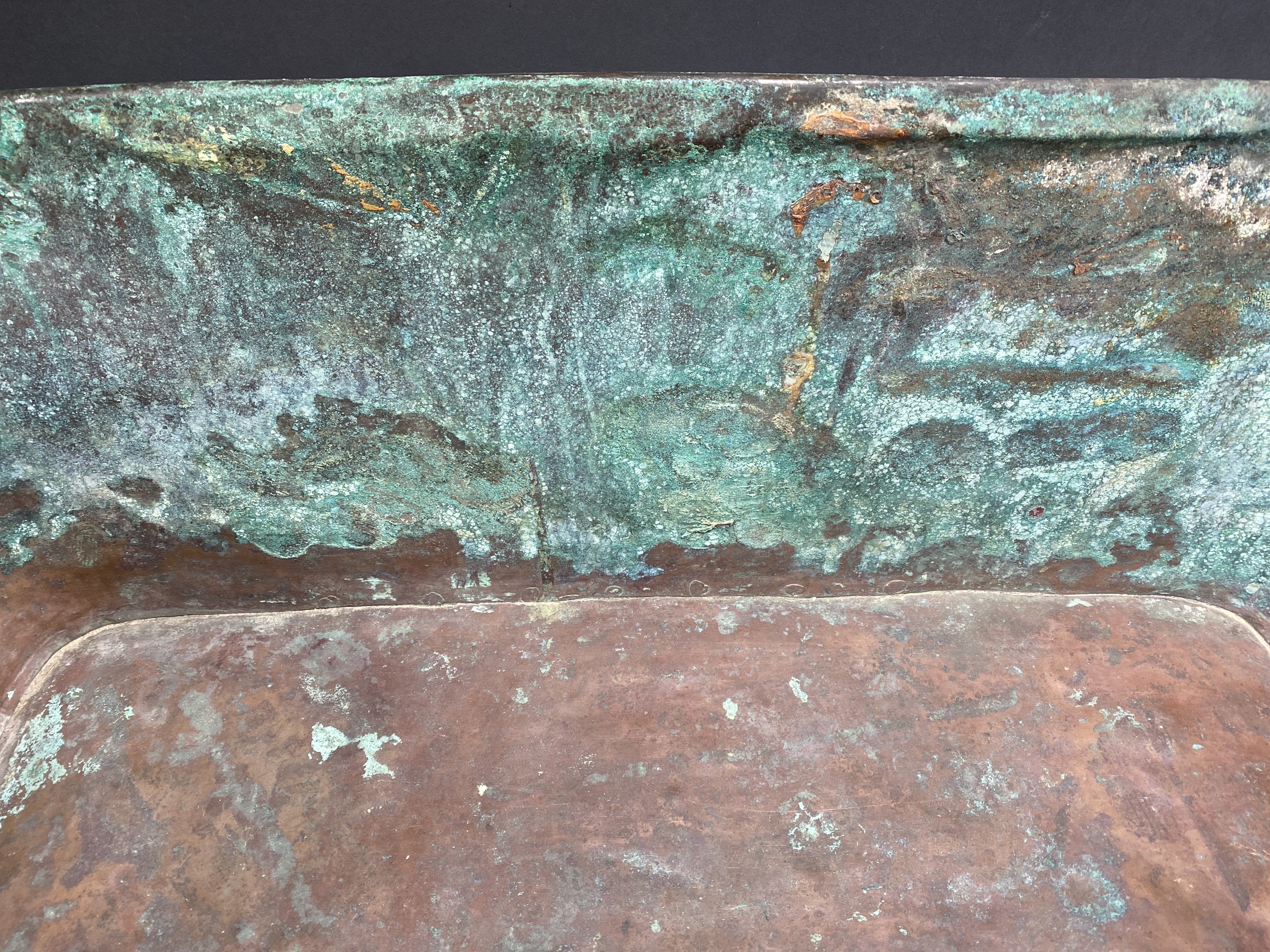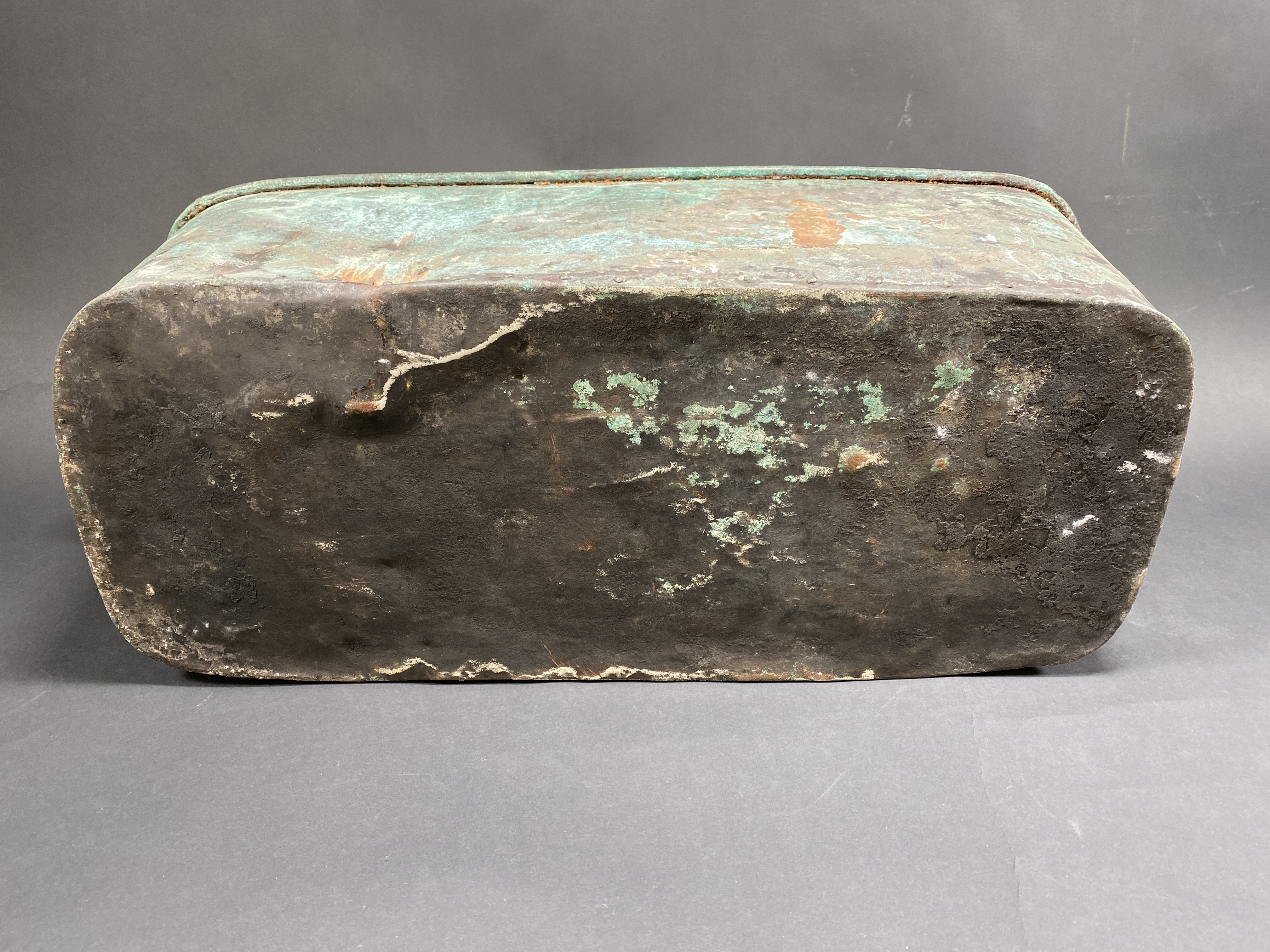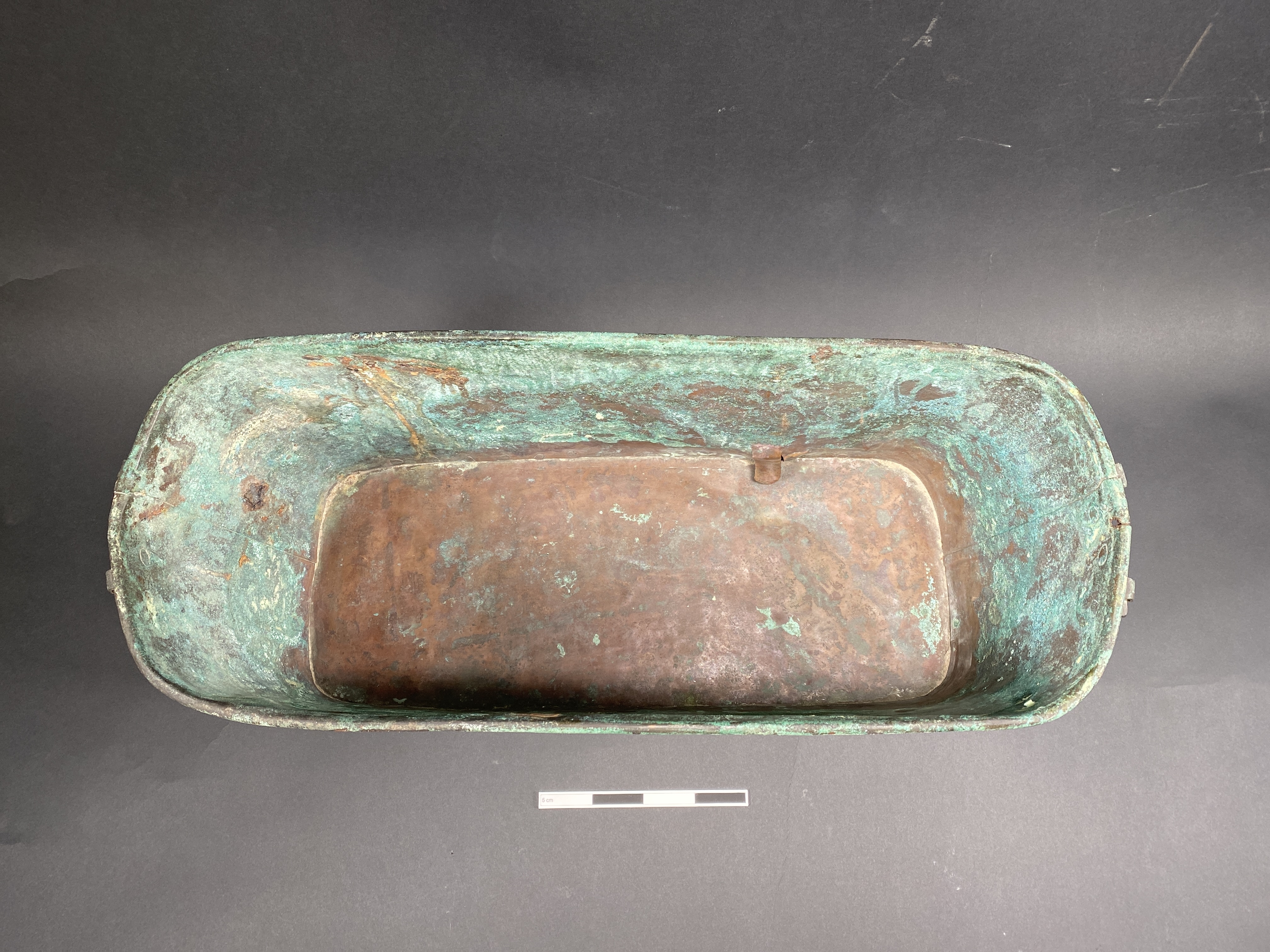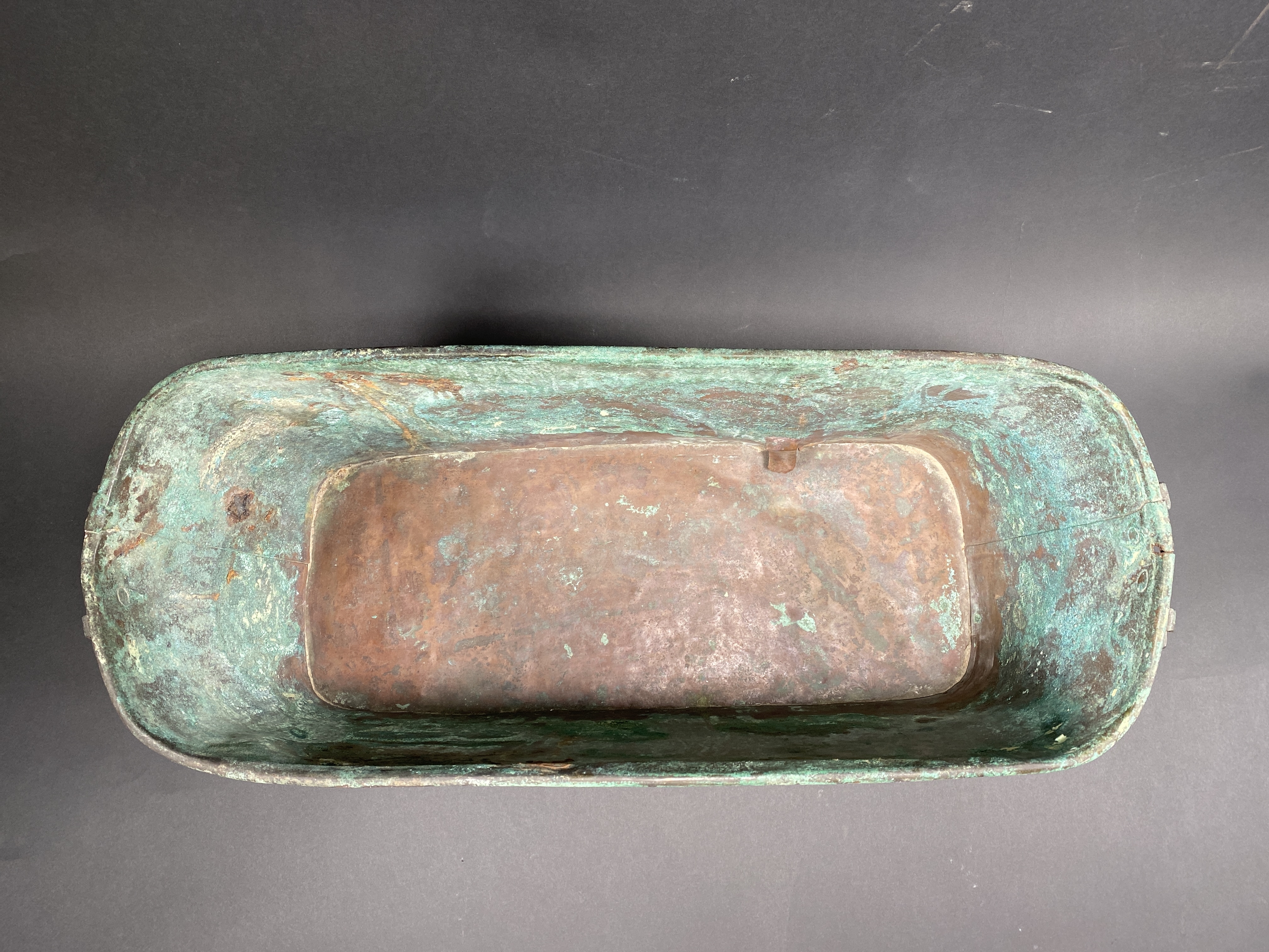Avlång kittel, fyrkantig form med rundade hörn och en koppargrepar vid vardera kortsida.