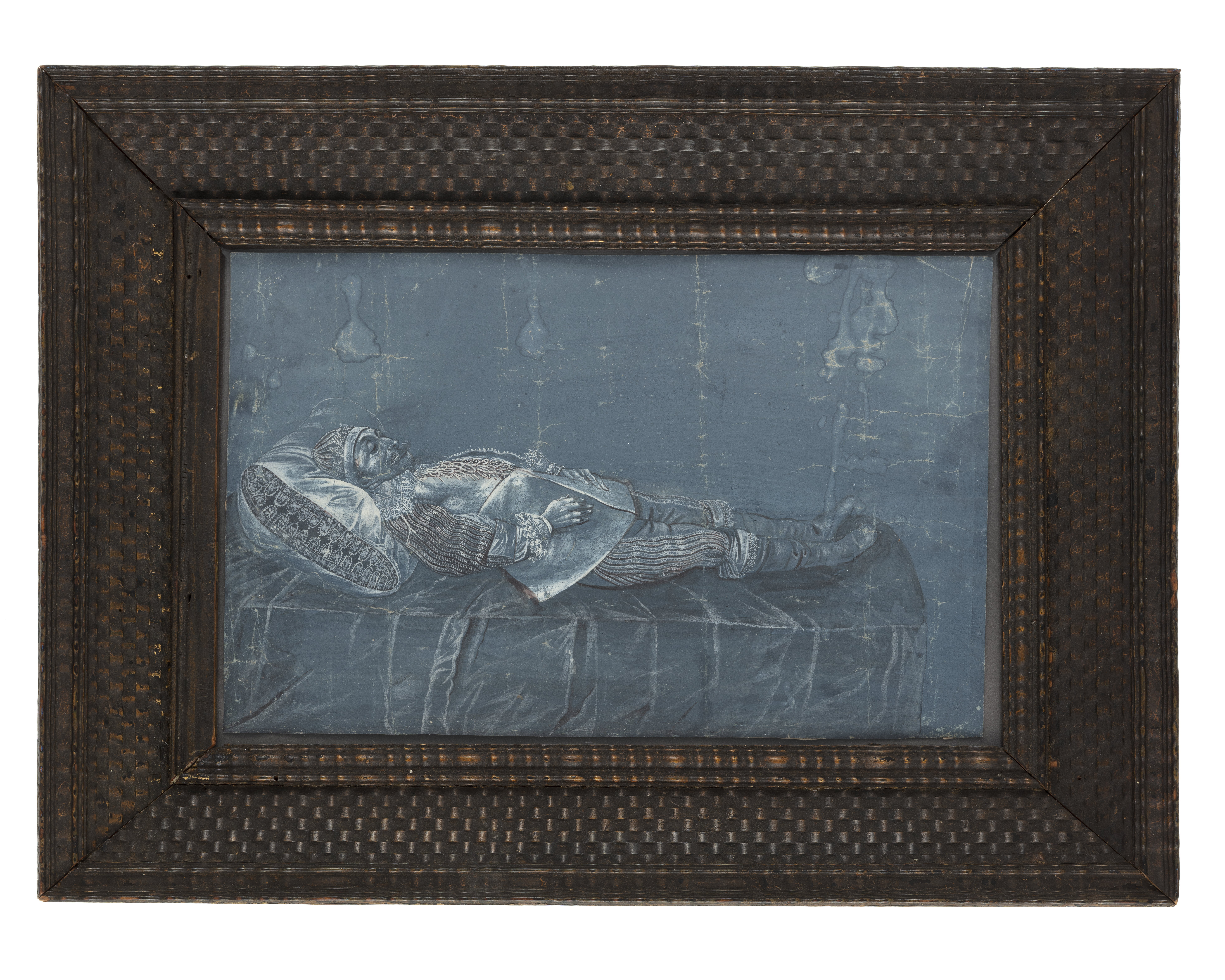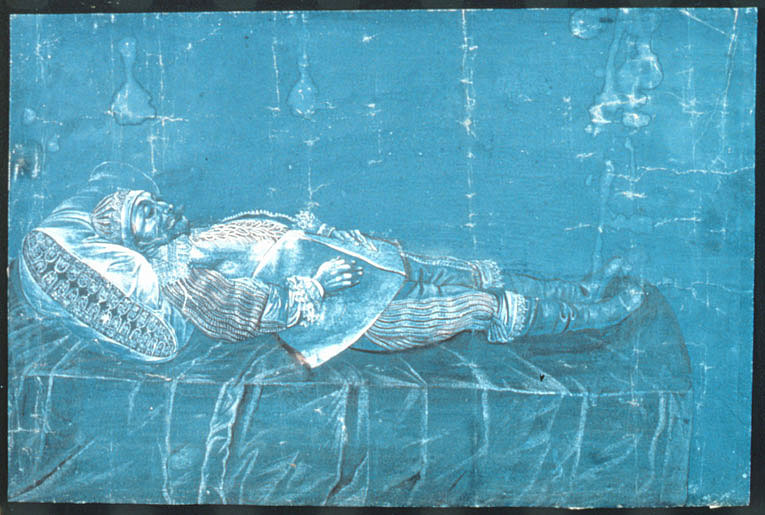 Gouache föreställande Gustav II Adolf på lit de parade, tillskriven bröderna F.- och J. Strachen, Wolgast 1633.